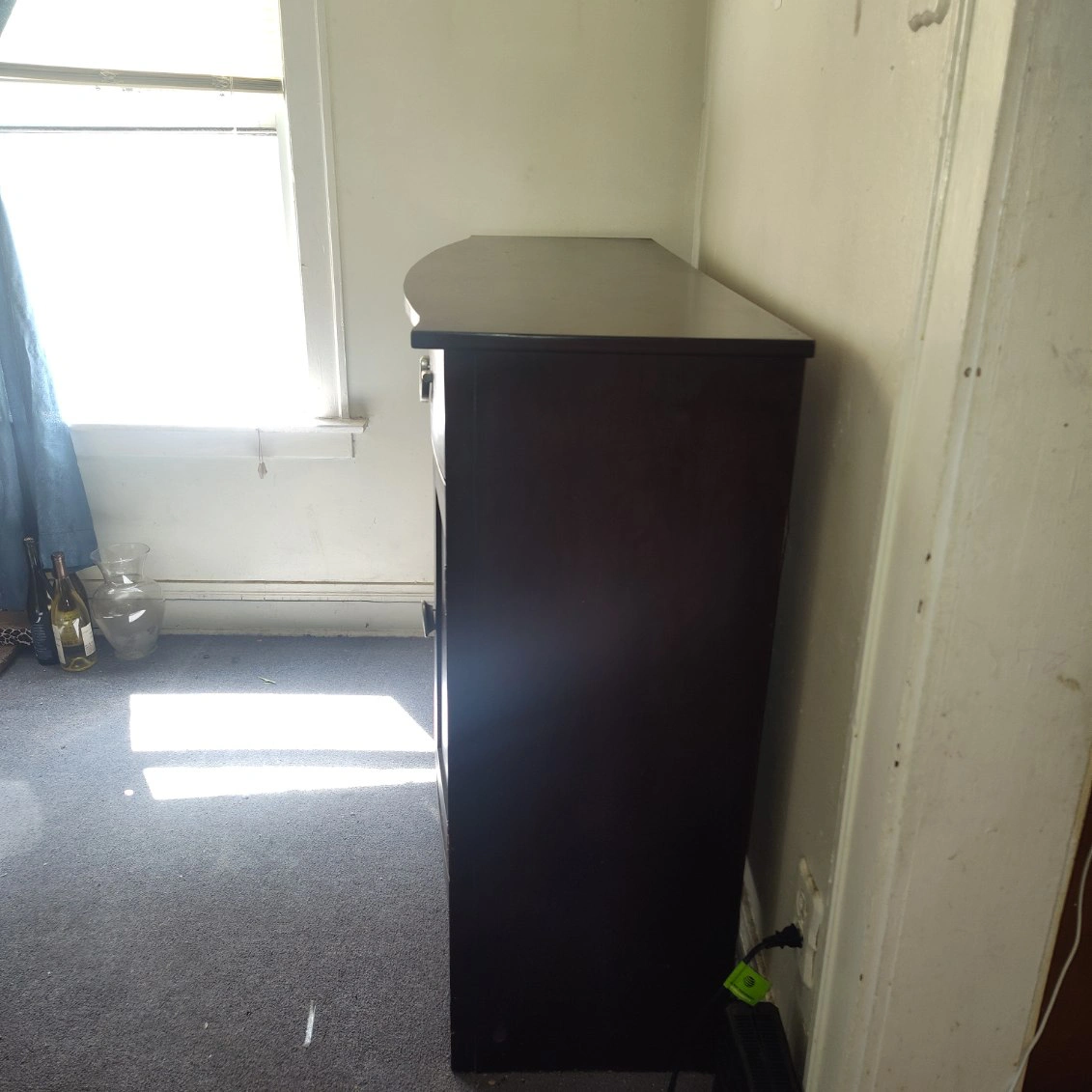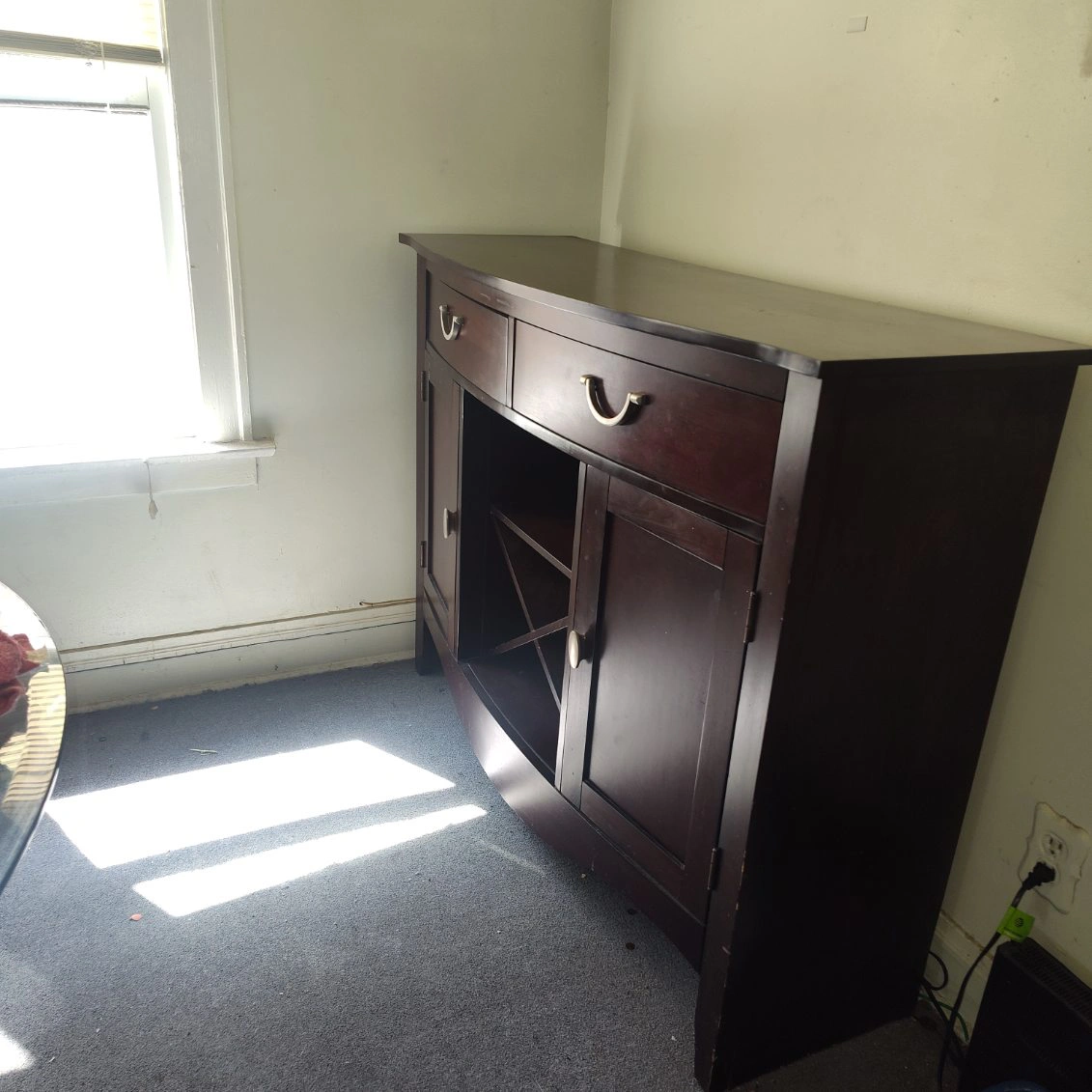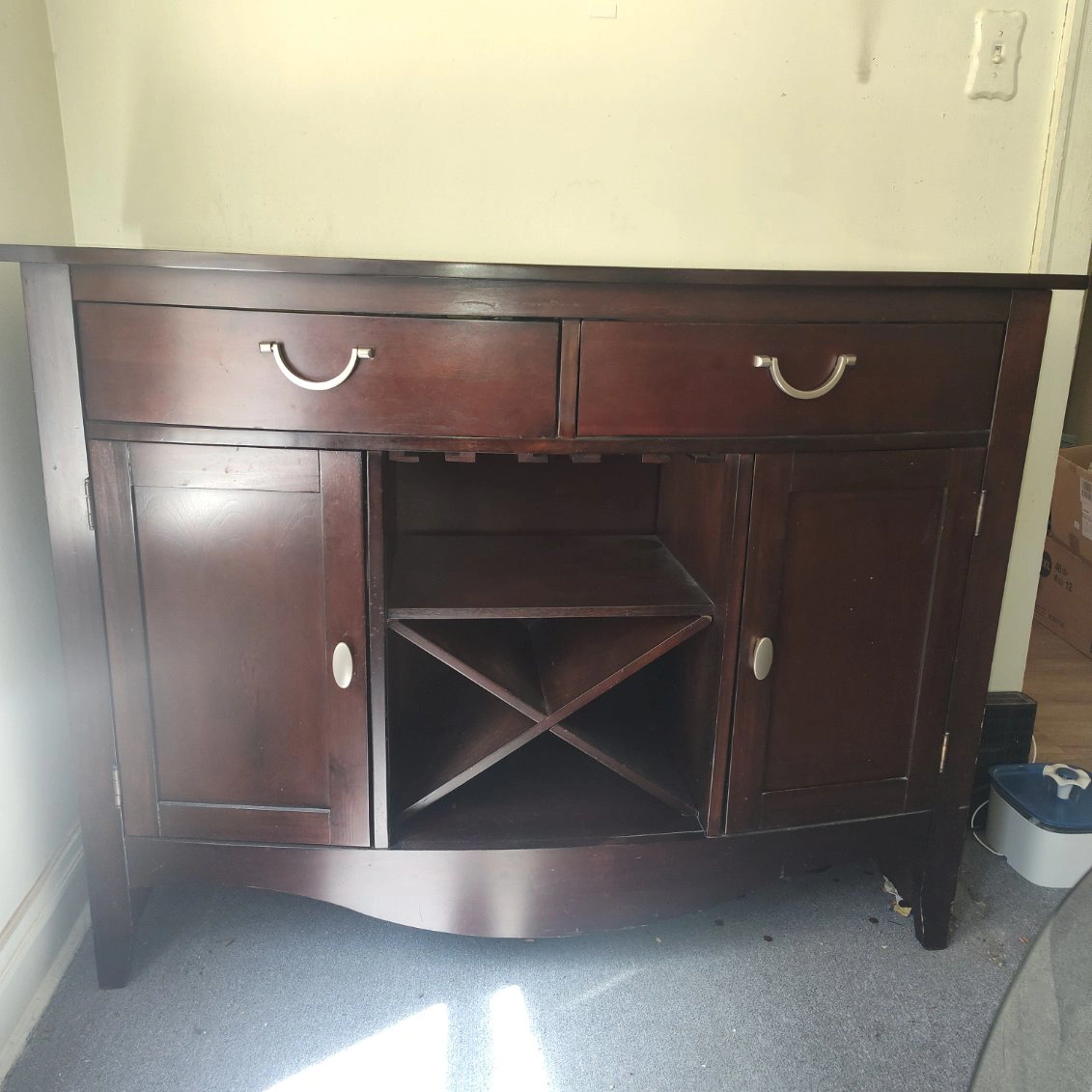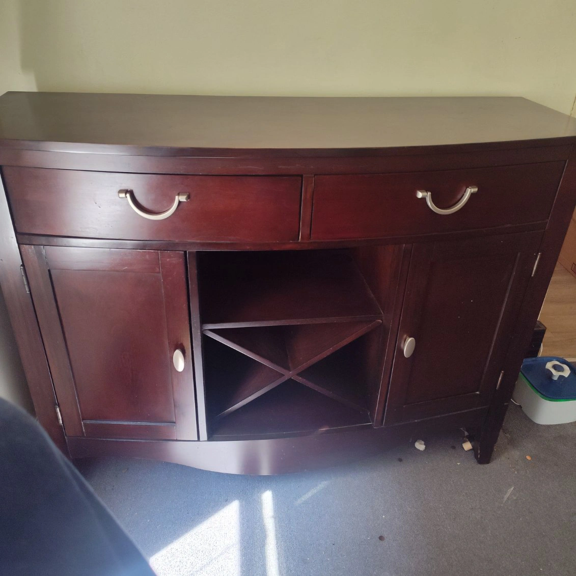 Dark brown wood buffet server. Features two drawers, two cabinet doors, and a wine rack. Curved front design. Good for dining room or bar area.