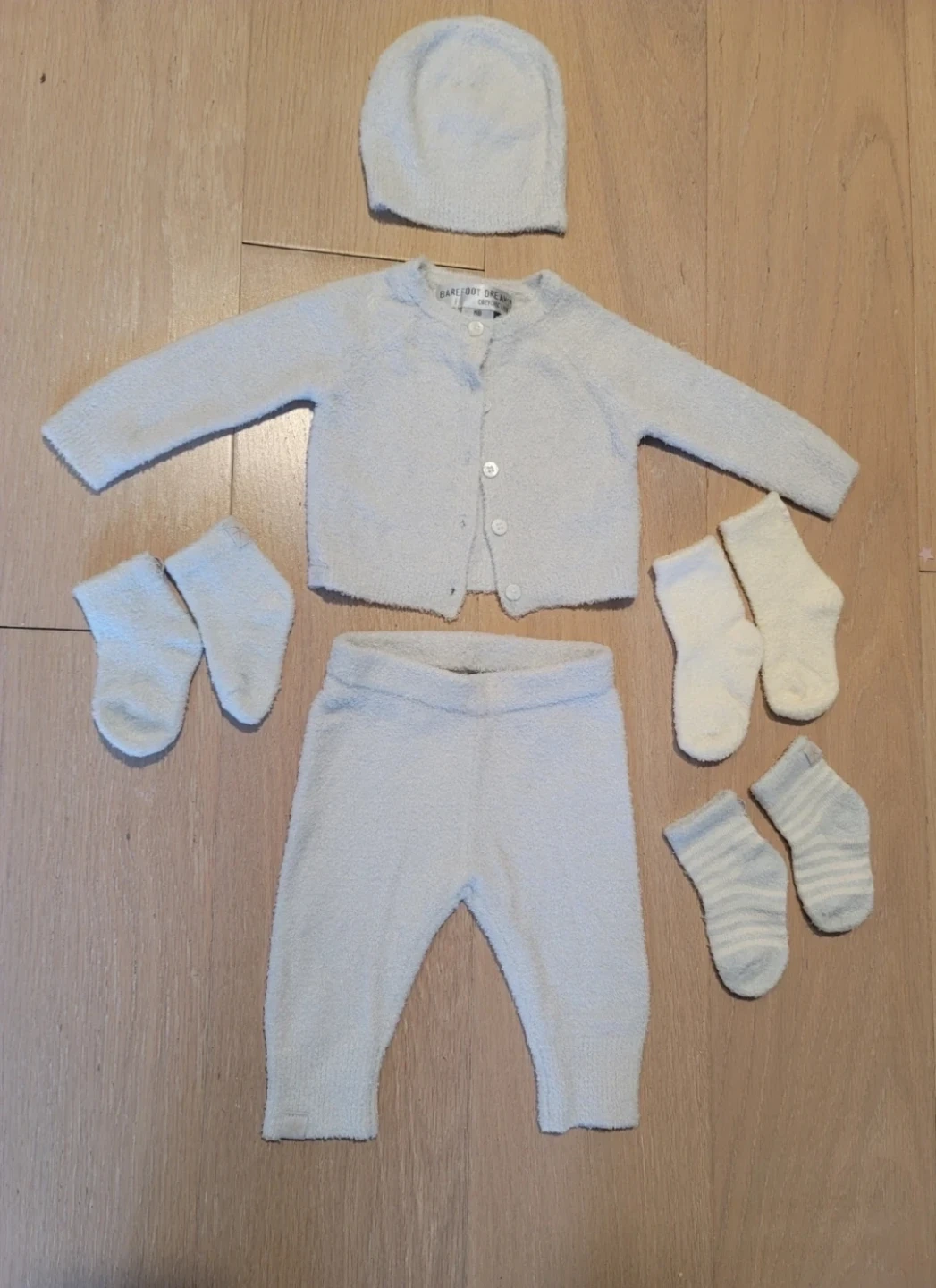 Barefoot Dreams baby set includes a cardigan, hat, and socks. Soft, cozy material. Perfect for newborns. Includes a total of 4 pairs of socks.