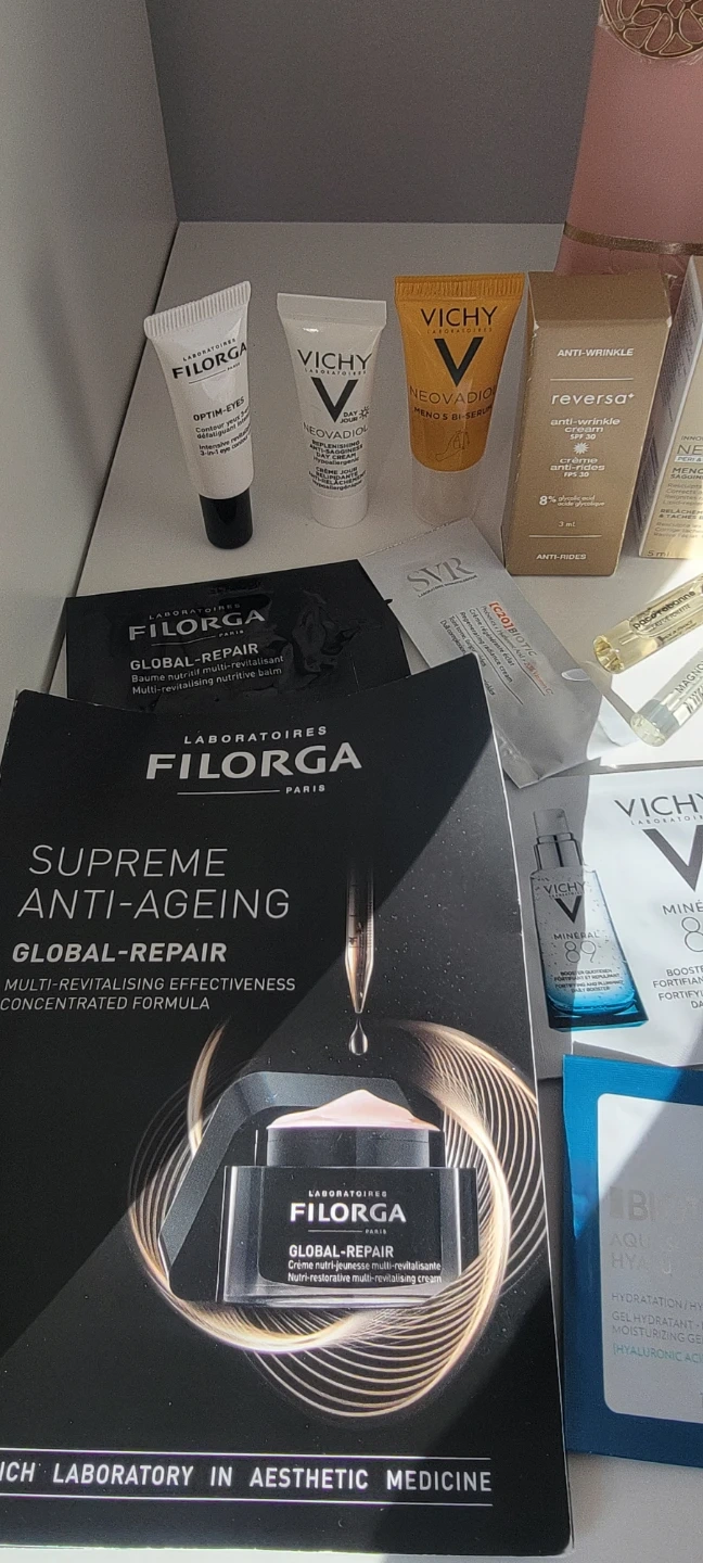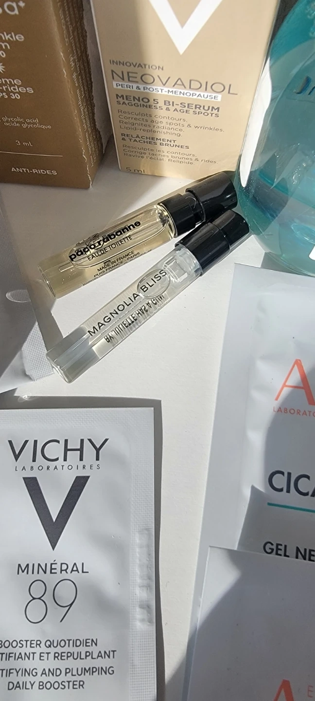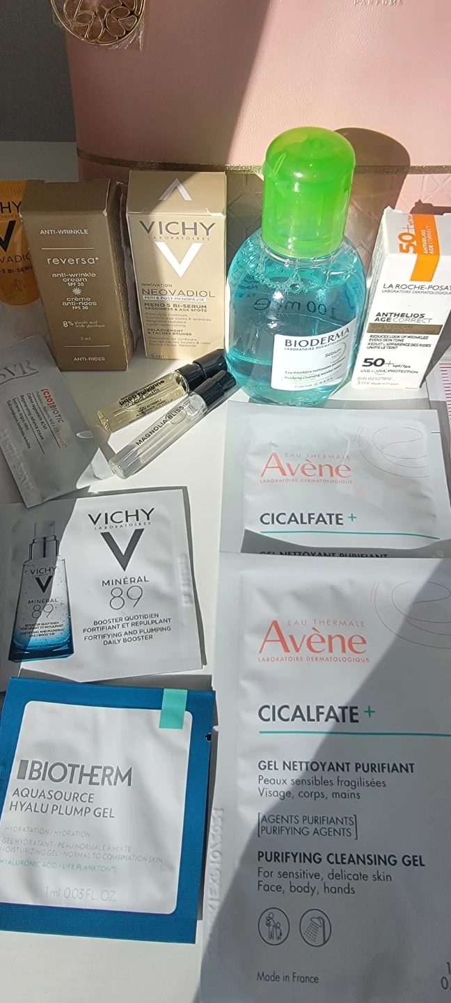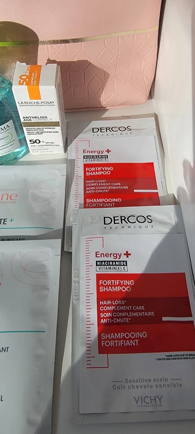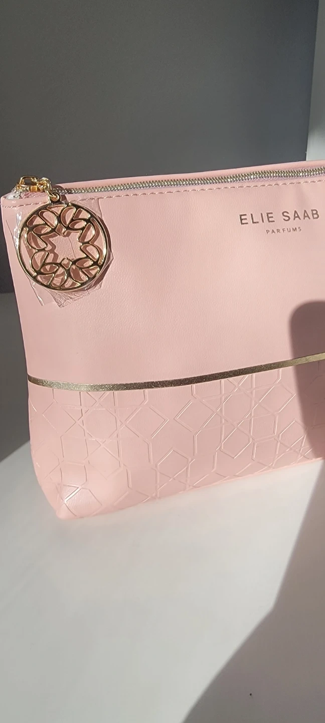 A pale pink Elie Saab makeup bag. It comes with various perfume and skincare samples including Vichy Dercos shampoo, La Roche-Posay sunscreen, and more. Perfect for travel or organizing your beauty essentials!