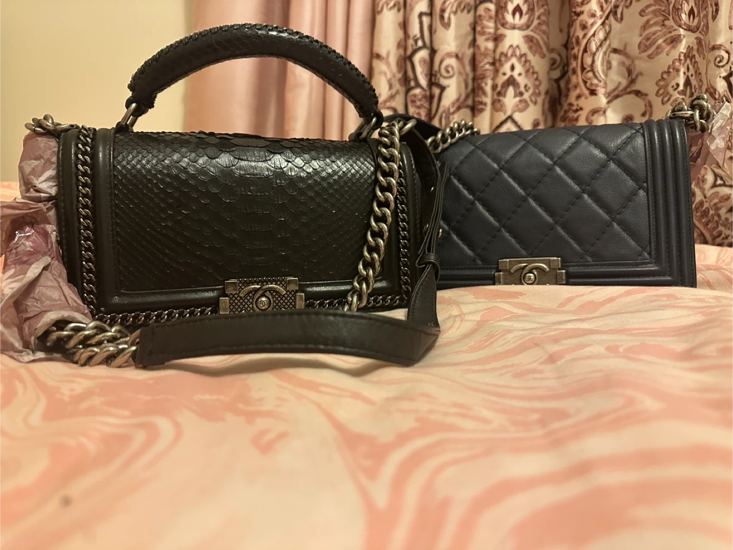 Two authentic Chanel Boy Bags are available. One is in black python leather, and the other is in navy quilted leather. Both feature iconic Chanel hardware and chain straps. These statement pieces add a touch of luxury to any outfit.