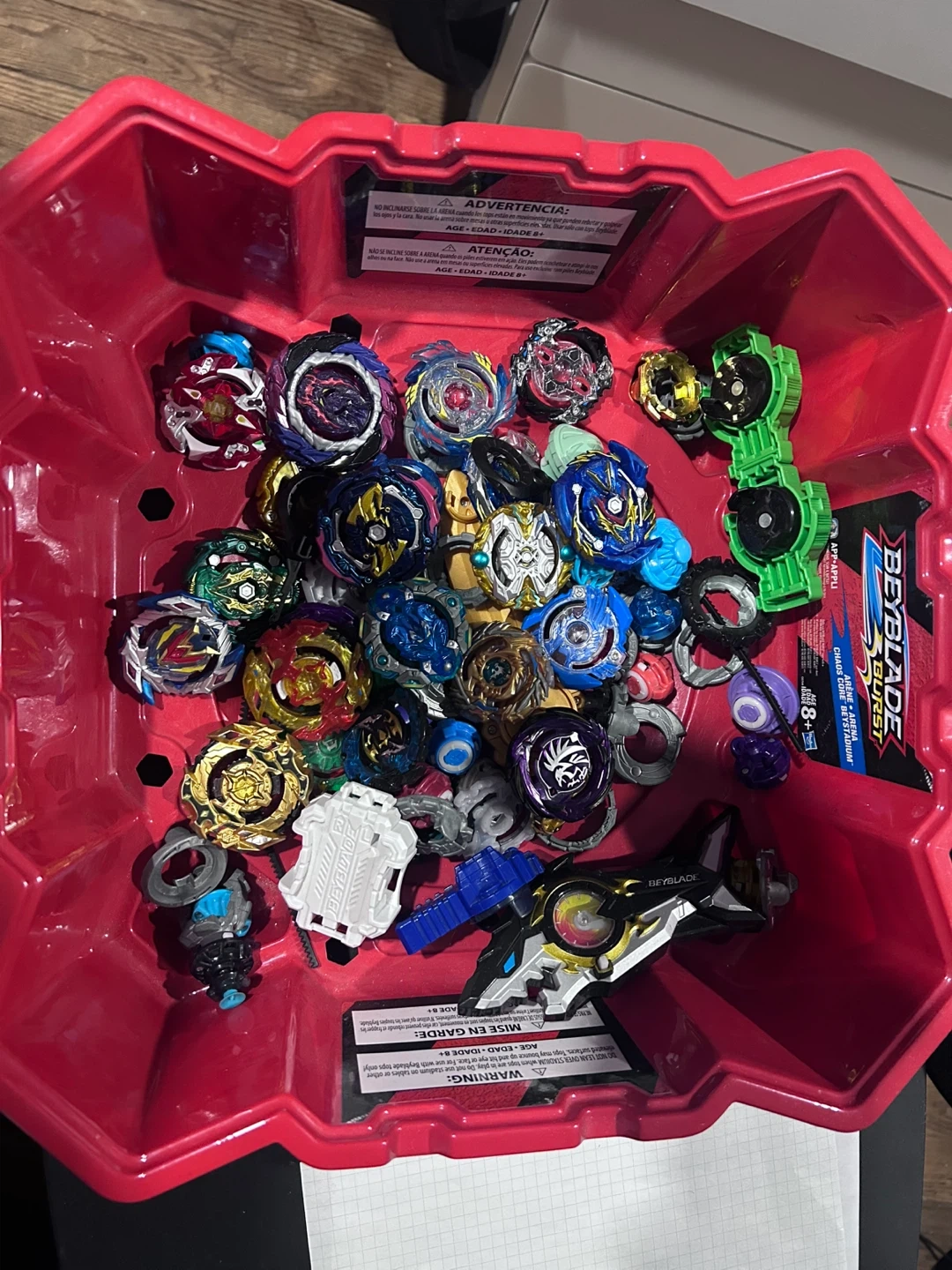 Has a bunch of different beyblades i used to play with.