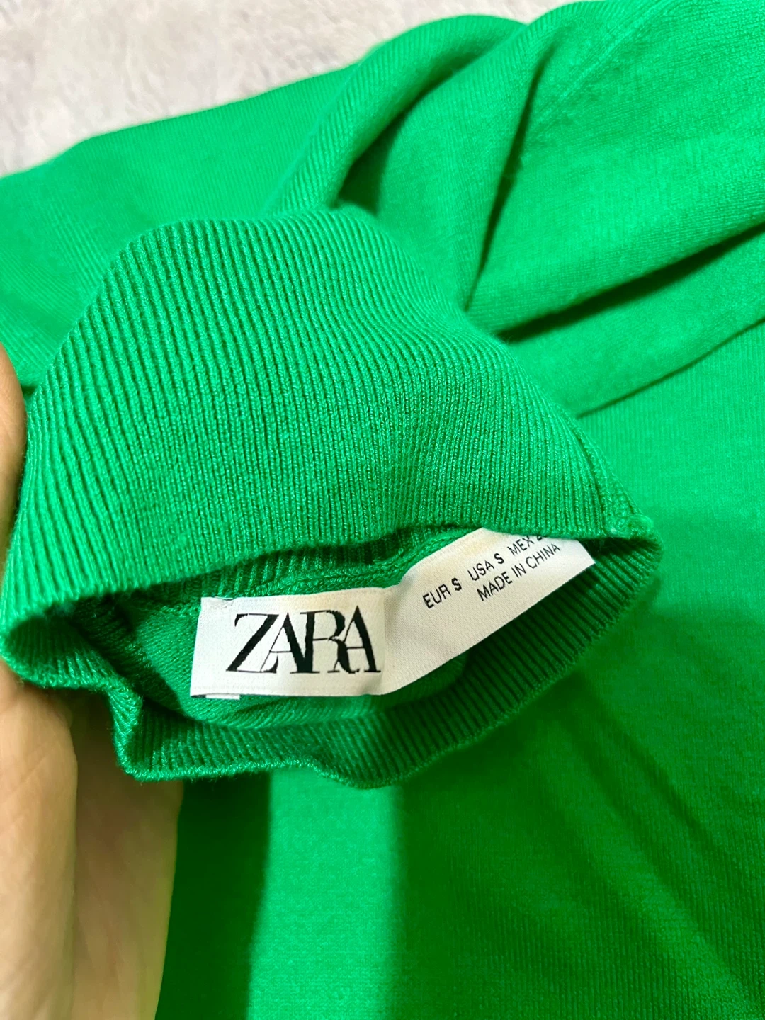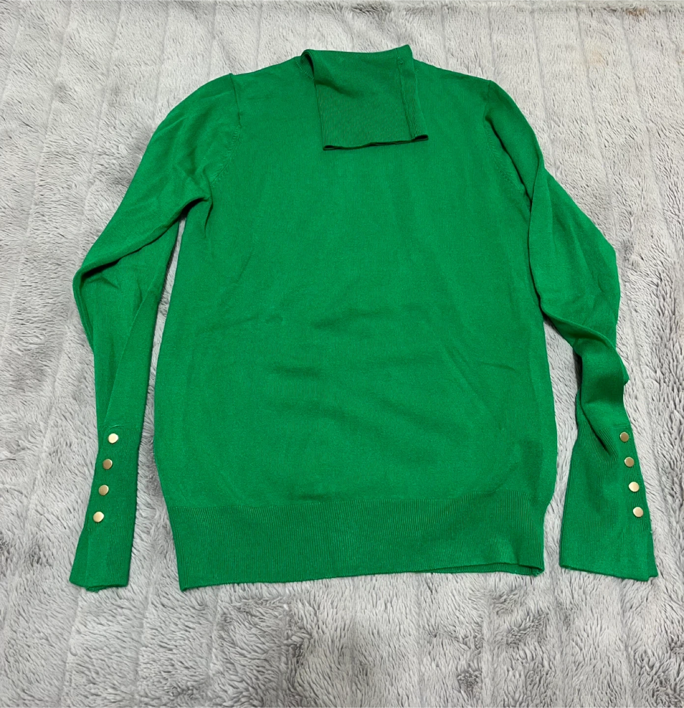 This is a Zara sweater in a bright green color. It's a size Small with decorative gold buttons on the cuffs. The material feels like a soft knit.