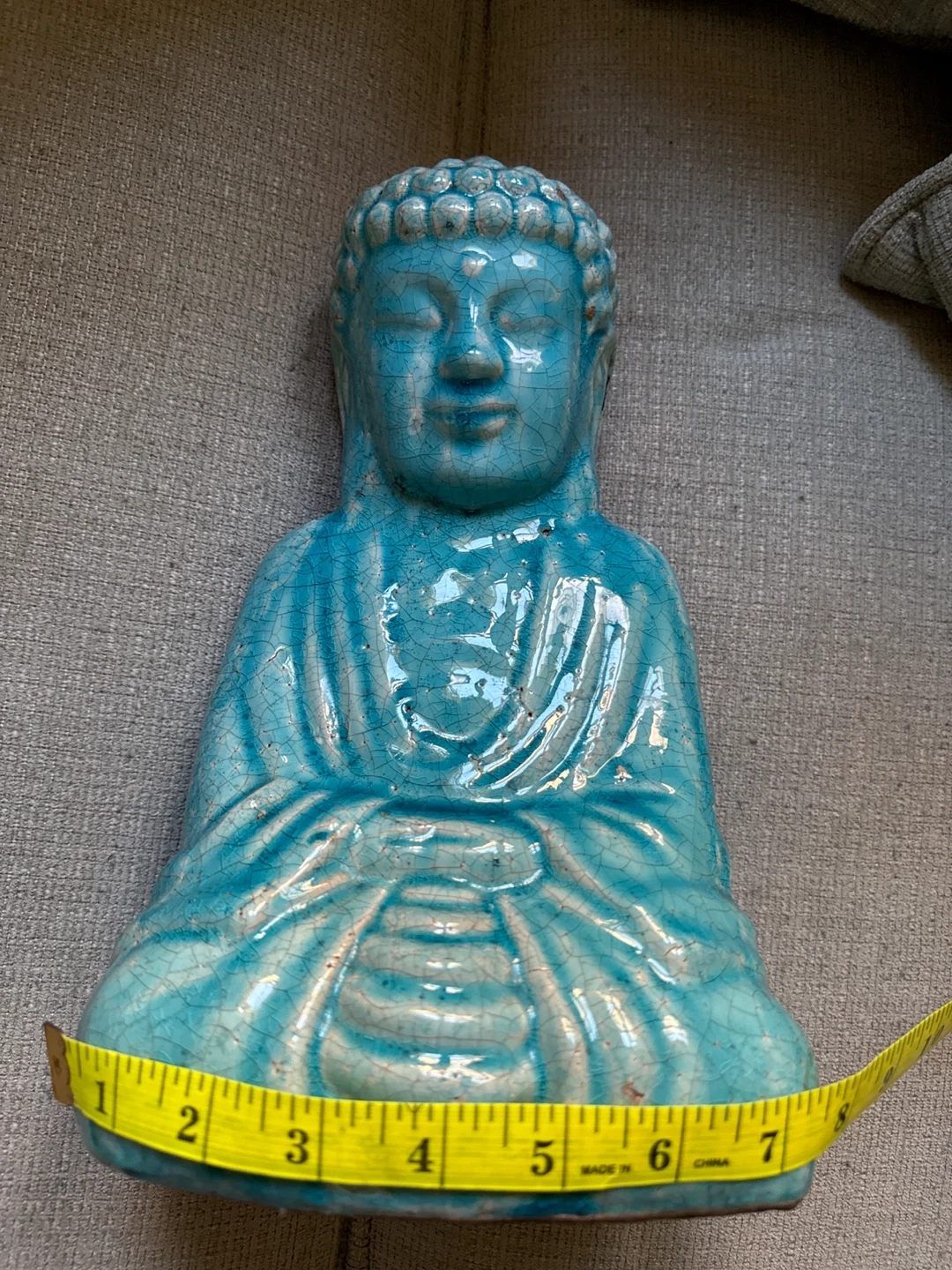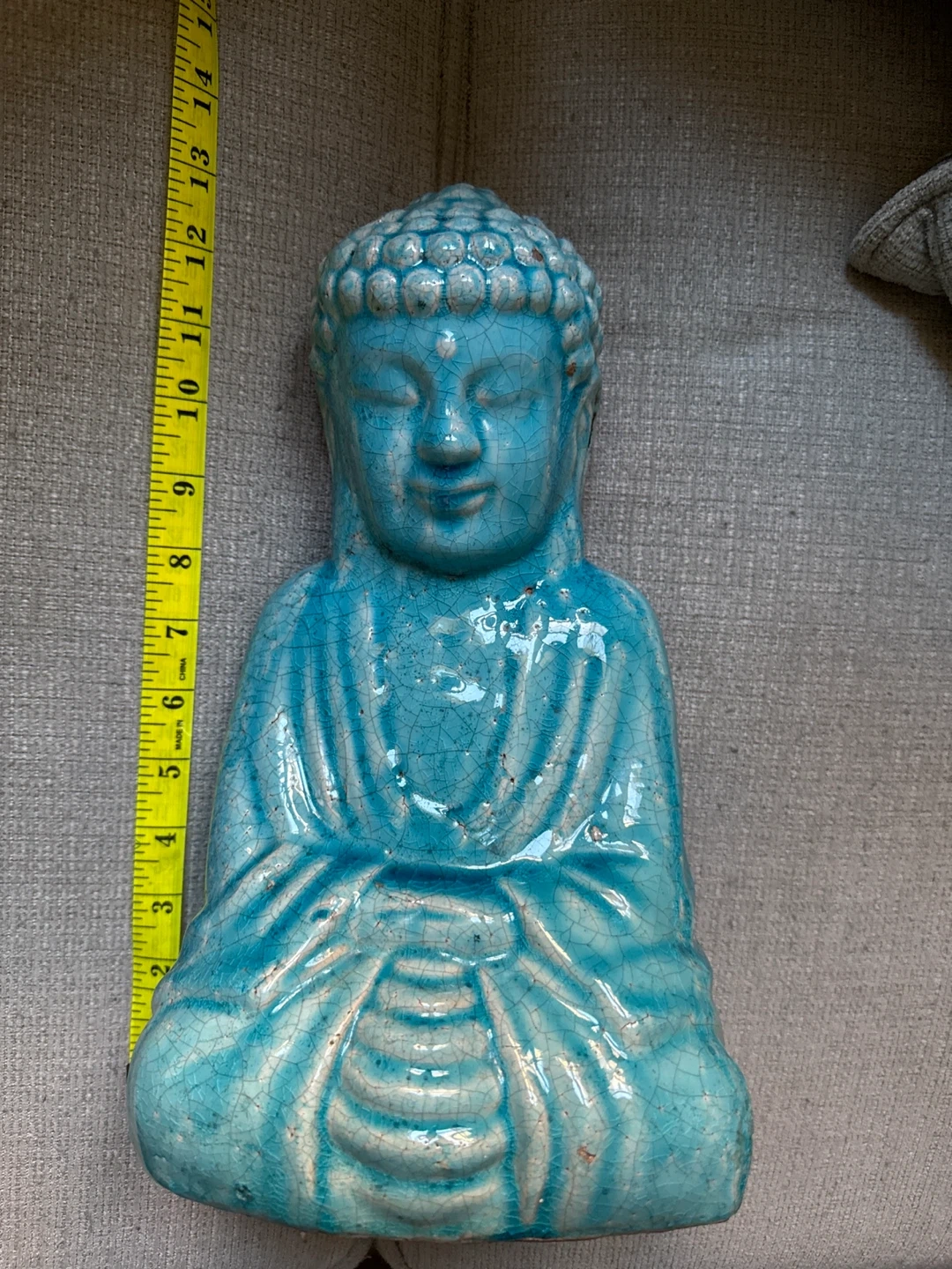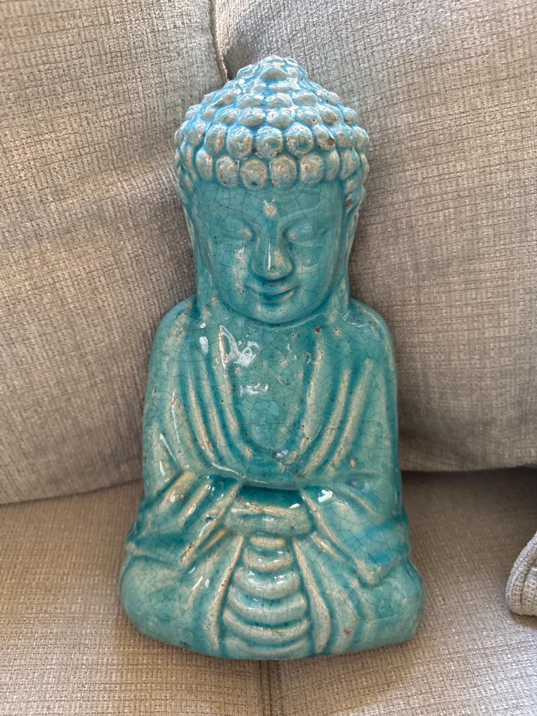 Decorative turquoise Buddha figurine. Ceramic material. Approximately 13 inches tall. Turquoise Painted Resin Brighten up your home with a pop of color! With a bold splash of color, the traditional and beloved Buddha is transformed into a contemporary and fun piece of home decor. The perfect balance of thought, rest of the senses, and tranquillity. Smoke Free home/ pick up/cash only.