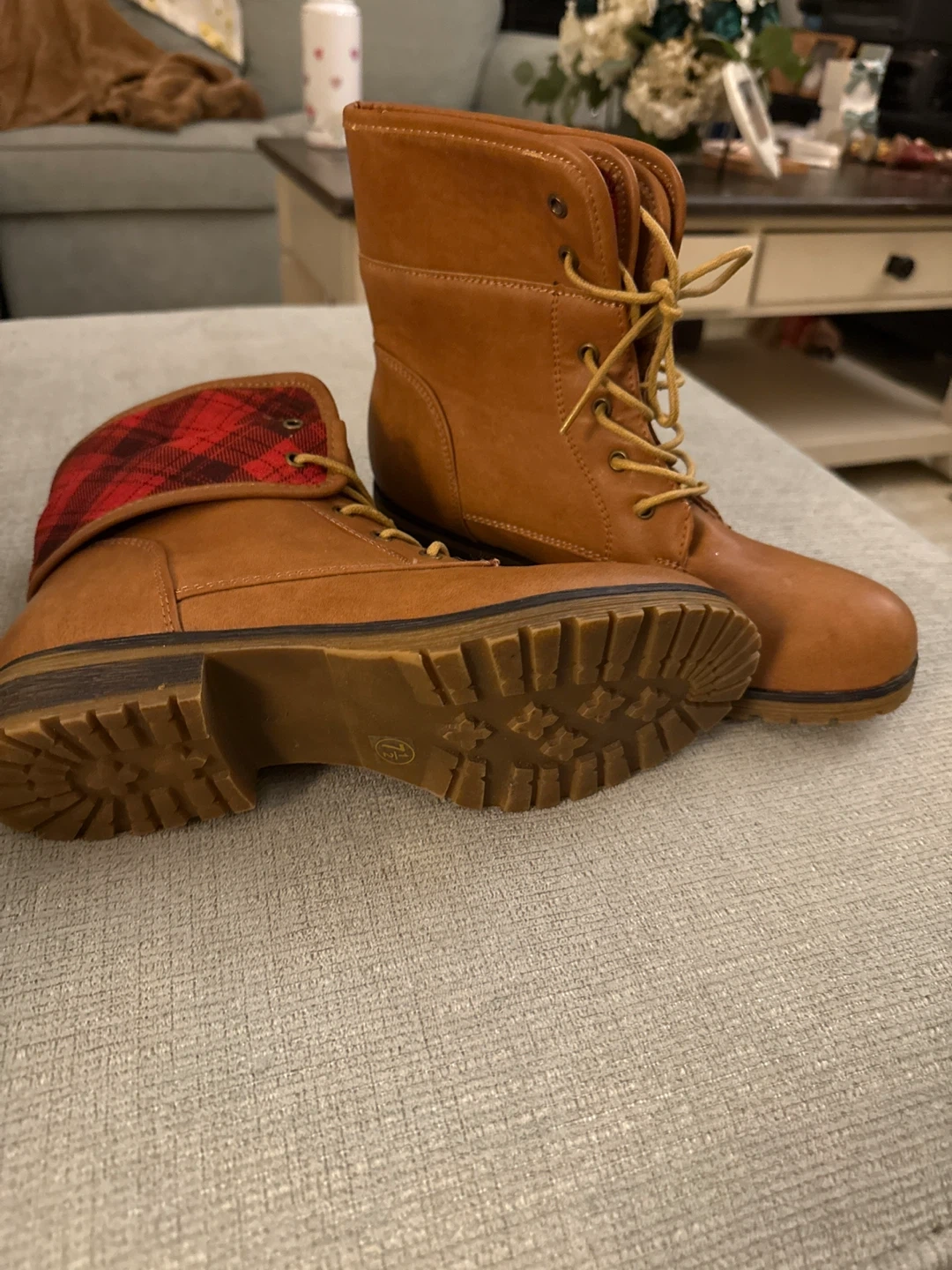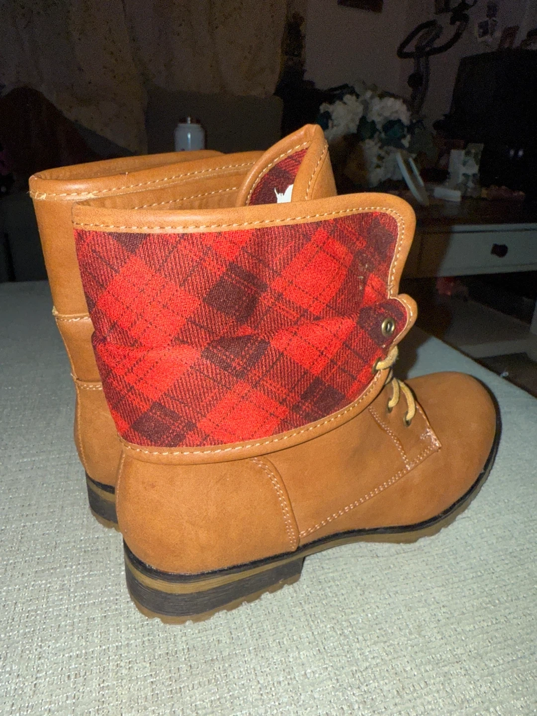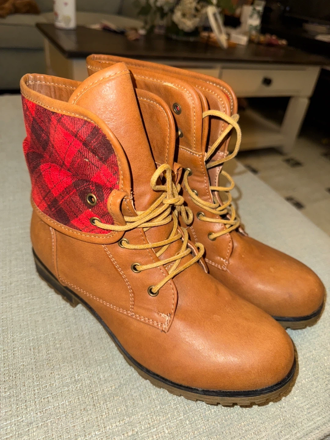 CA. Collection by Carrini combat boots. These stylish brown boots feature a lace-up front and a cozy red plaid lining that can be cuffed down. They're a size 7.5 with a durable lug sole. Perfect for adding a touch of rustic charm to any outfit! Smoke-free home. Pick up/ cash only🙏🏽