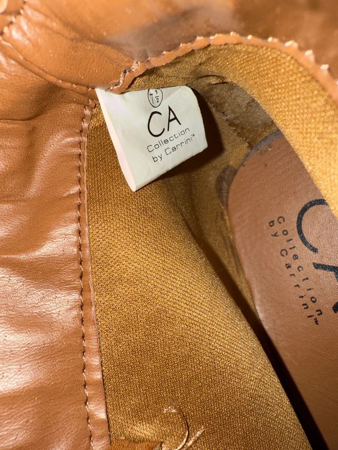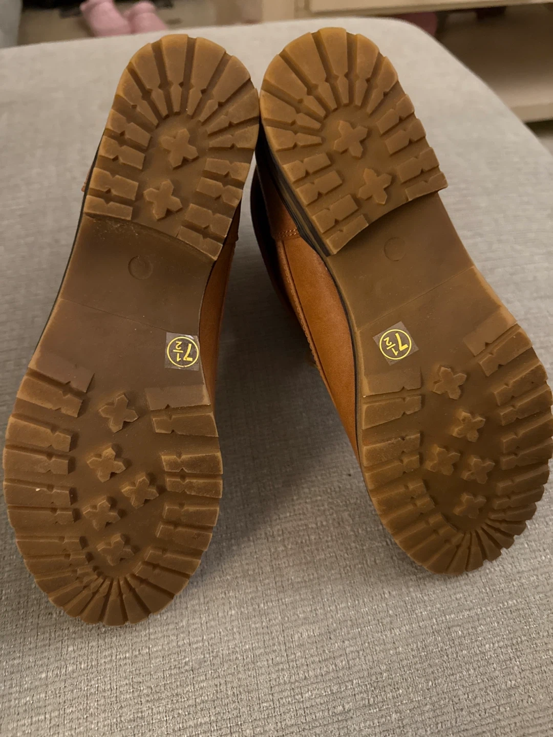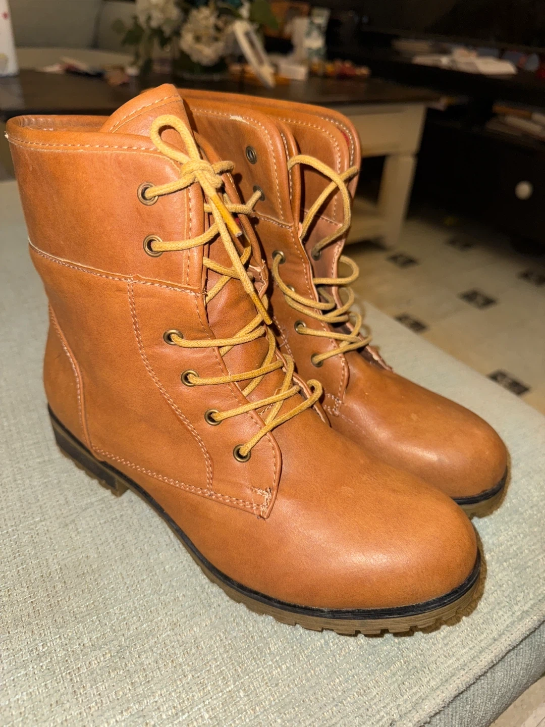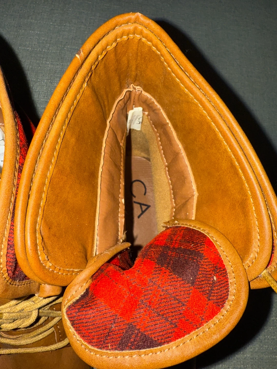 CA. Collection by Carrini combat boots. These stylish brown boots feature a lace-up front and a cozy red plaid lining that can be cuffed down. They're a size 7.5 with a durable lug sole. Perfect for adding a touch of rustic charm to any outfit! Smoke-free home. Pick up/ cash only🙏🏽