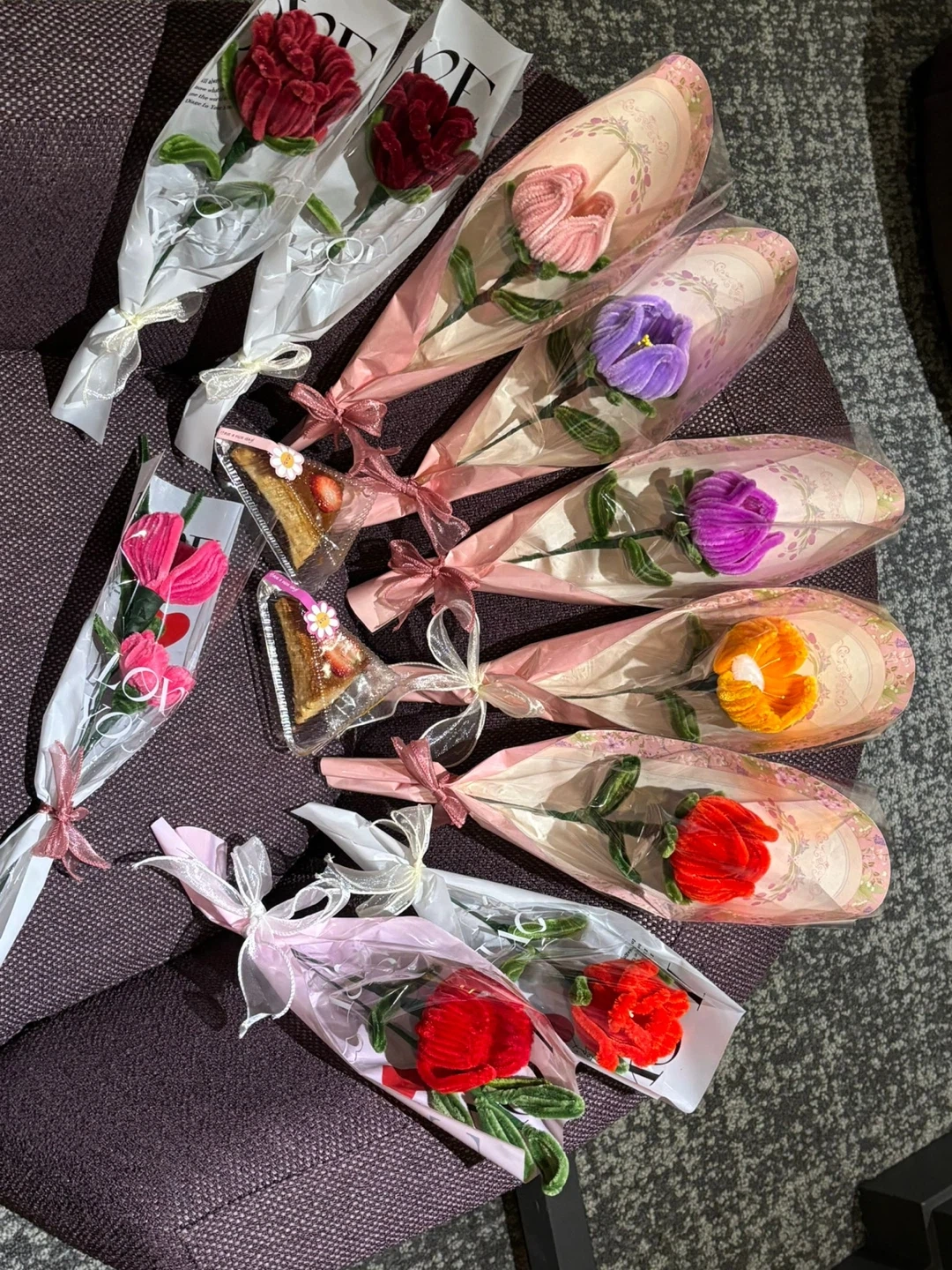 Set includes multiple individual velvet flower bouquets in various colours like red, pink, purple, and orange. Each flower is elegantly wrapped and tied with a ribbon. Also includes two triangular cake slices, topped with strawberry. These look like perfect little gifts for someone special!
