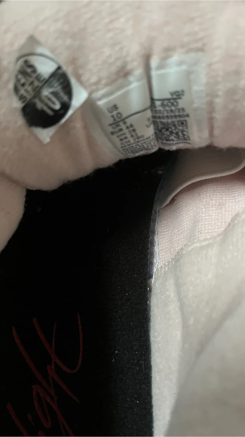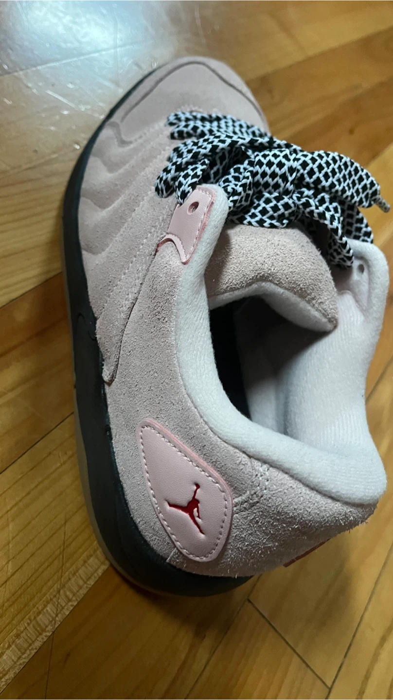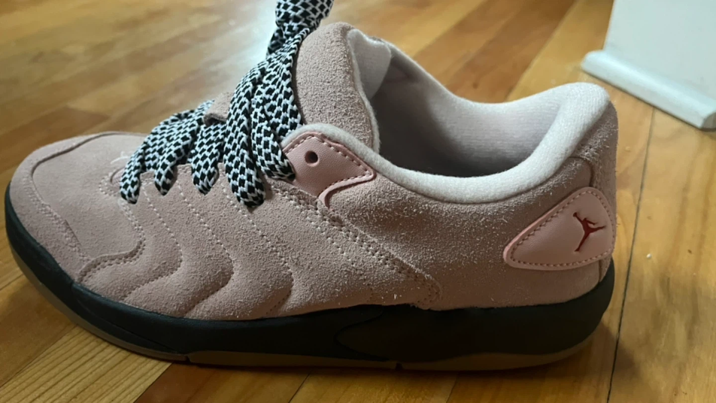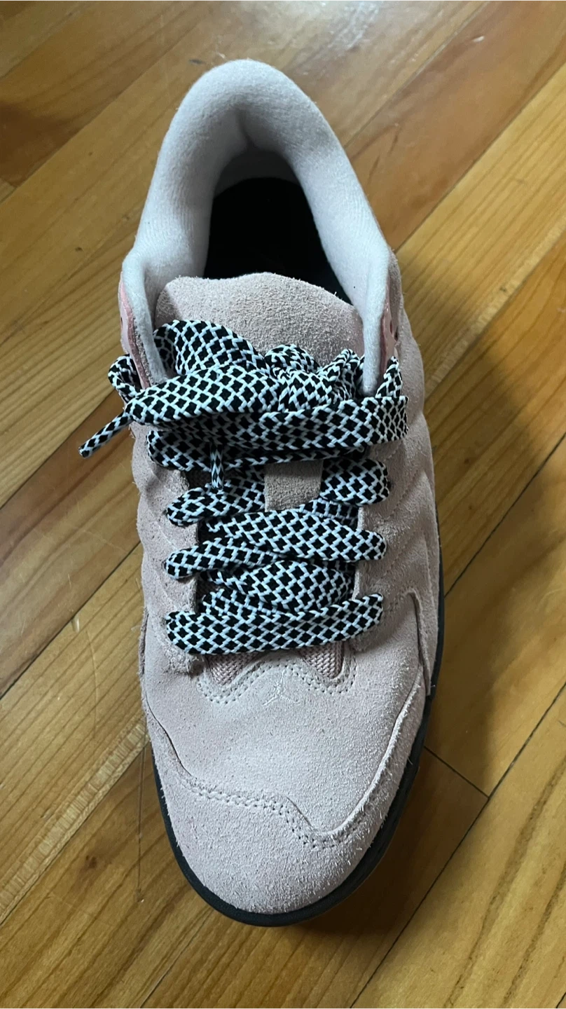 These are Jordan 12 Retro SE sneakers in a light pink suede colorway. They're a US size 10. The shoes feature a unique black and white checkered lacing. Perfect for a collector or everyday wear!