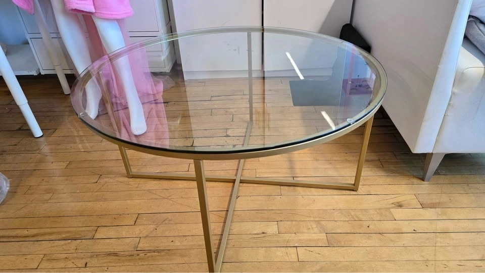 Office move out sale! Welwick Designs 36-inch Clear/Gold Medium Round Glass Coffee Table. Pick up Queen west and Bathurst.