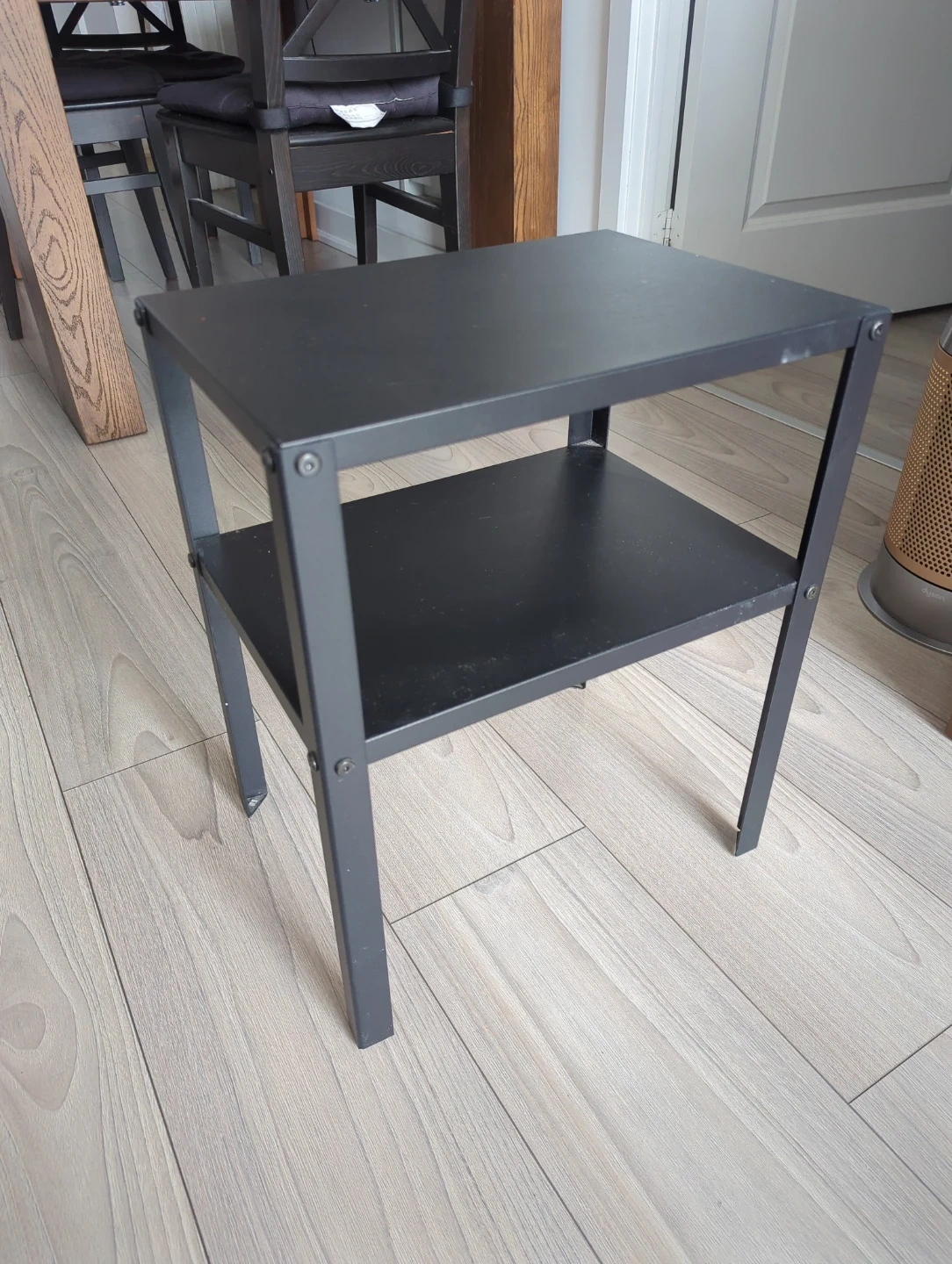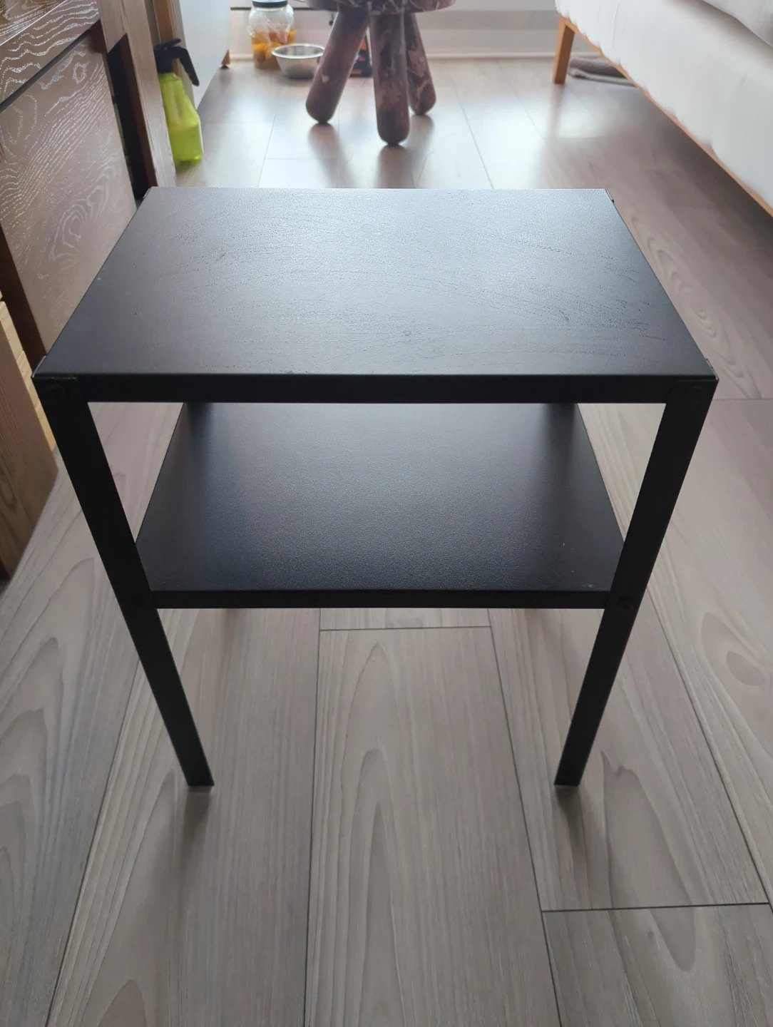 This is a black metal two-tier side table. It has a matte black finish and a simple, modern design. The table is sturdy and provides ample surface area for your needs.