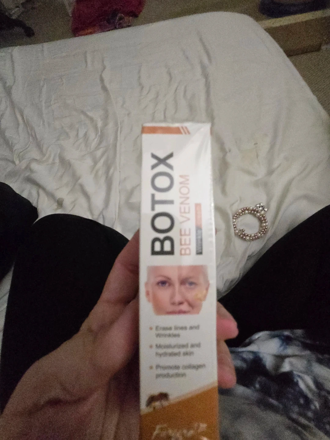 This cream is formulated with bee venom. It's designed to erase lines and wrinkles. Skin feels moisturized and hydrated, promoting collagen production.