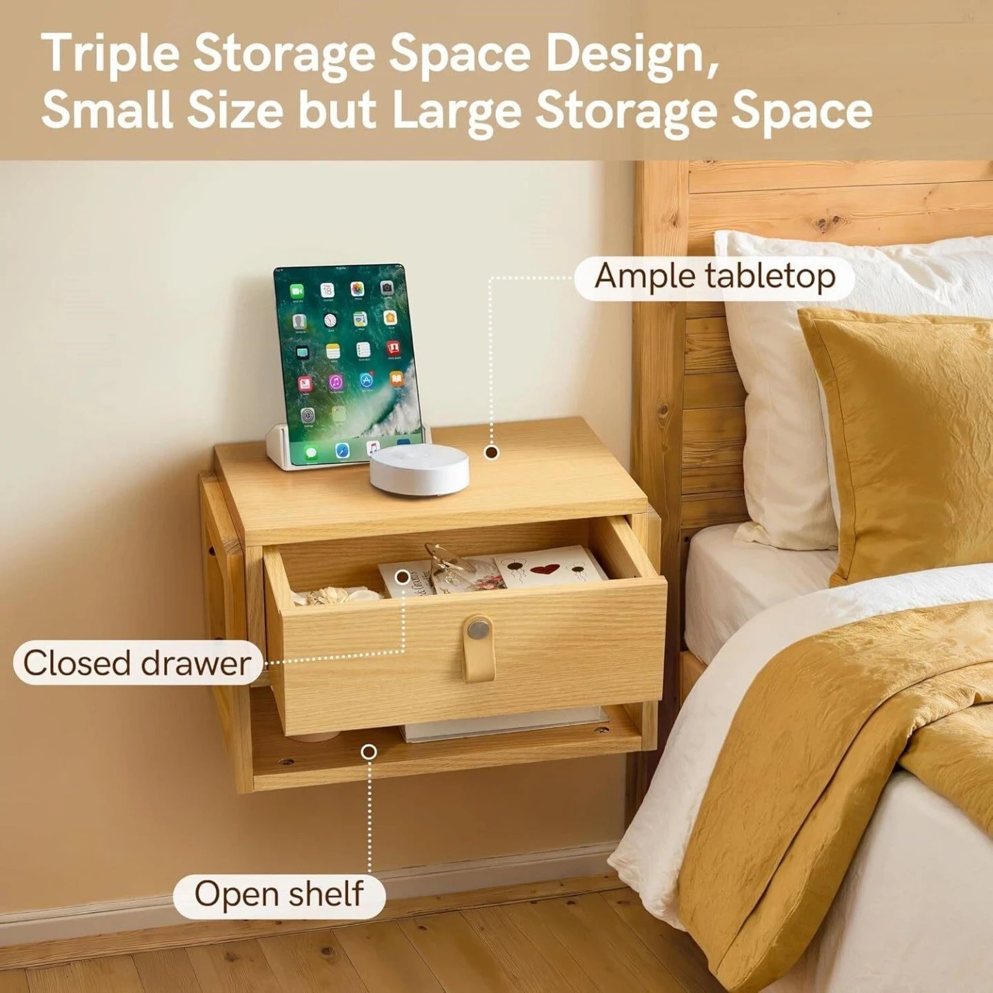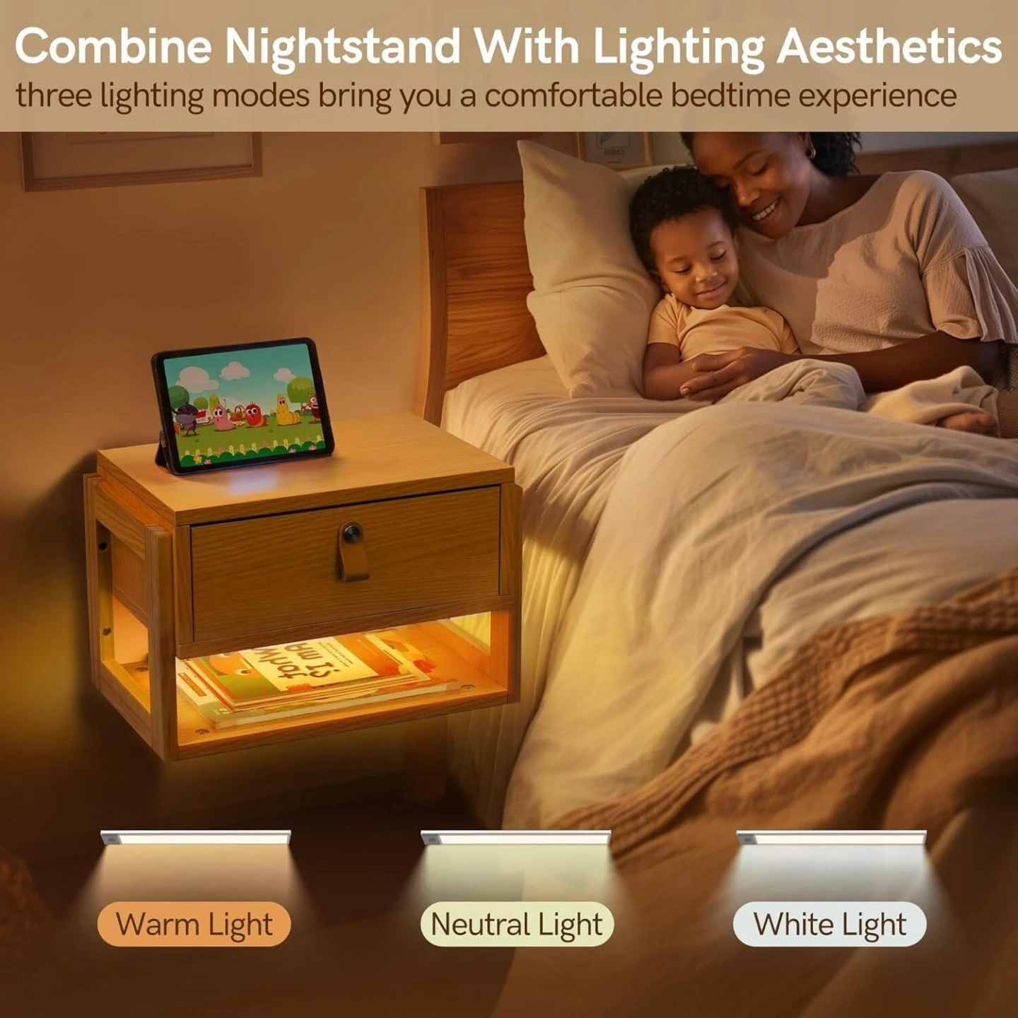 This is a wooden floating nightstand with a drawer and an open shelf. It features triple storage space for ample room. The nightstand also comes with a smart motion sensor light strip offering three lighting modes for a comfortable bedtime experience.