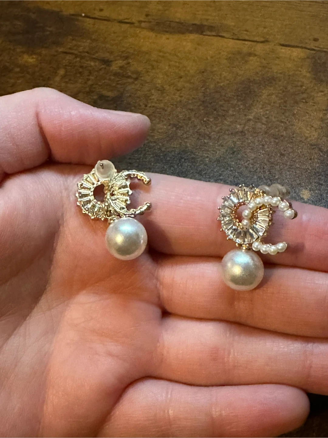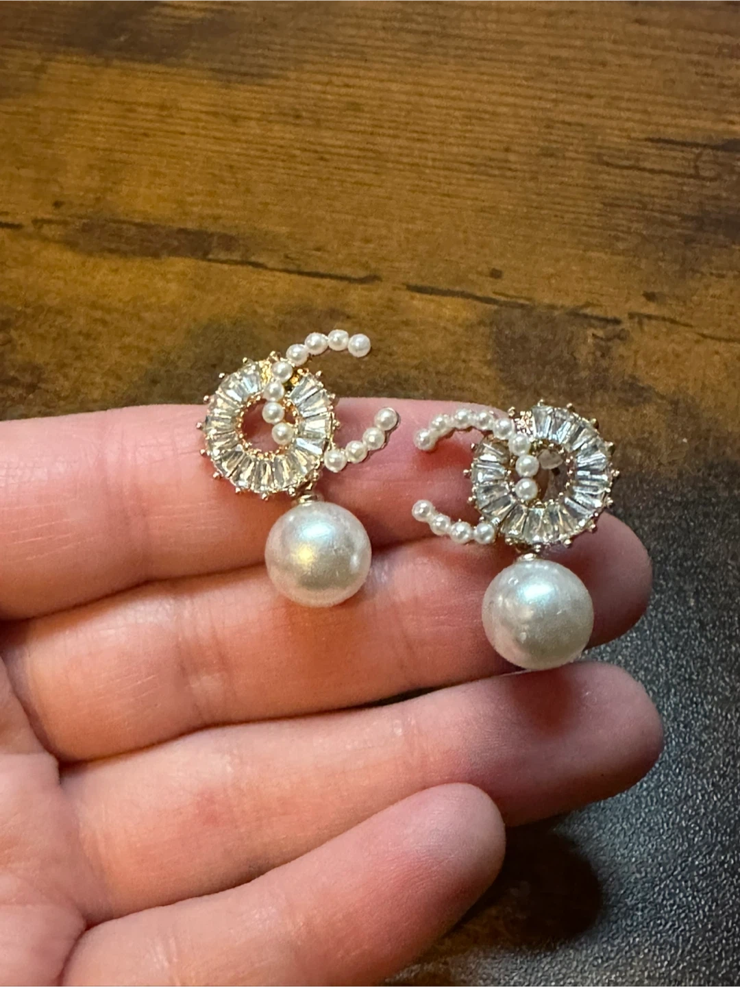 Elegant pearl drop earrings adorned with sparkling crystal accents. These earrings feature a classic pearl pendant suspended from a decorative design. They're suitable for adding a touch of sophistication to any outfit, from everyday wear to special occasions.