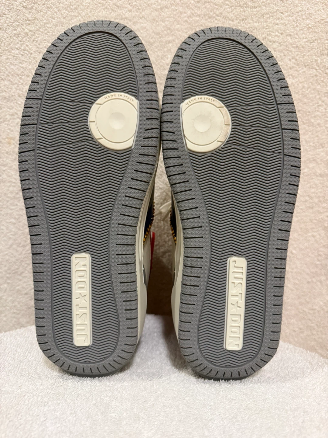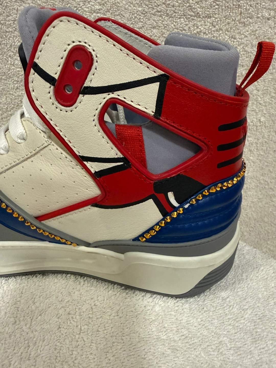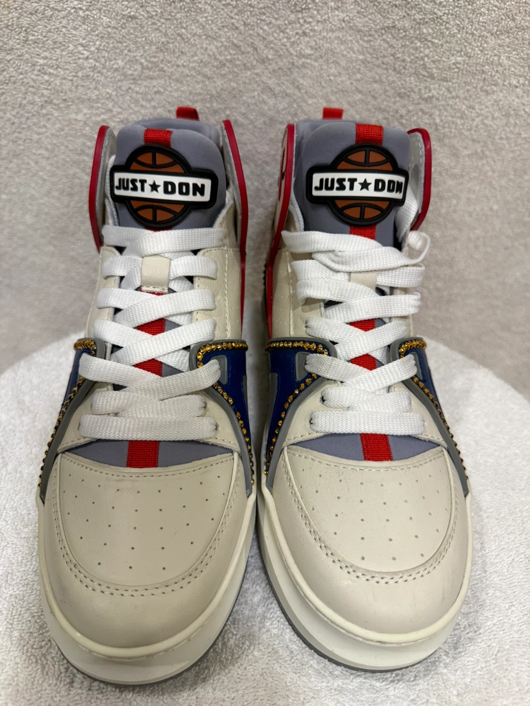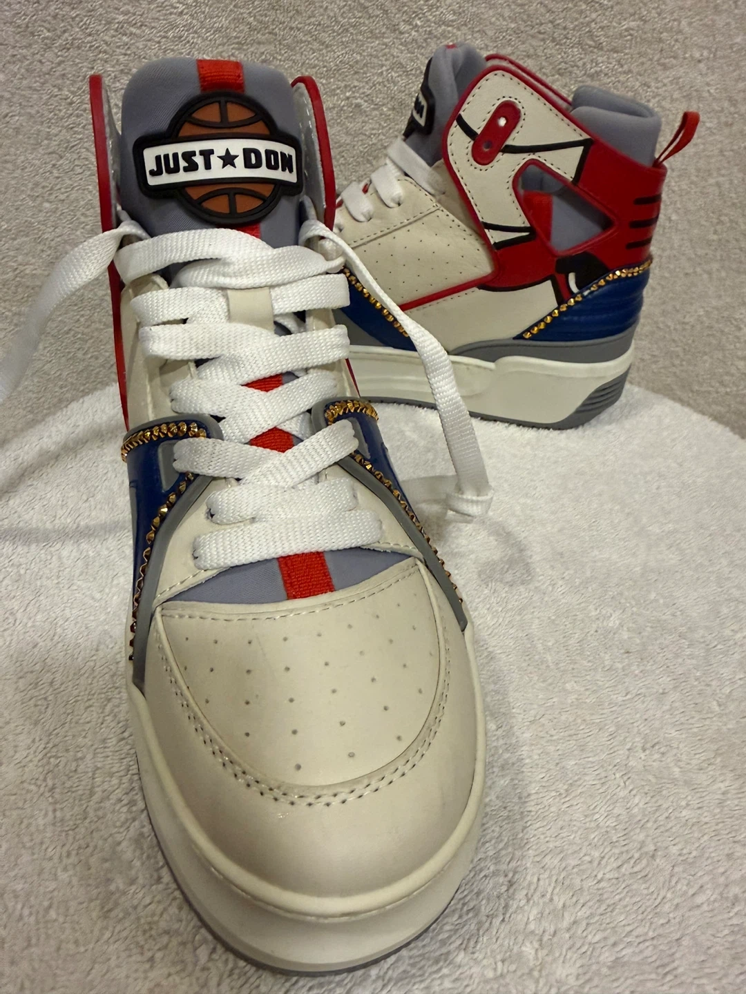 These high top sneakers feature a bold red, white, and blue design with gold accents. They're made in Italy and branded with 'Just Don' on the soles. These unique sneakers are sure to make a statement!