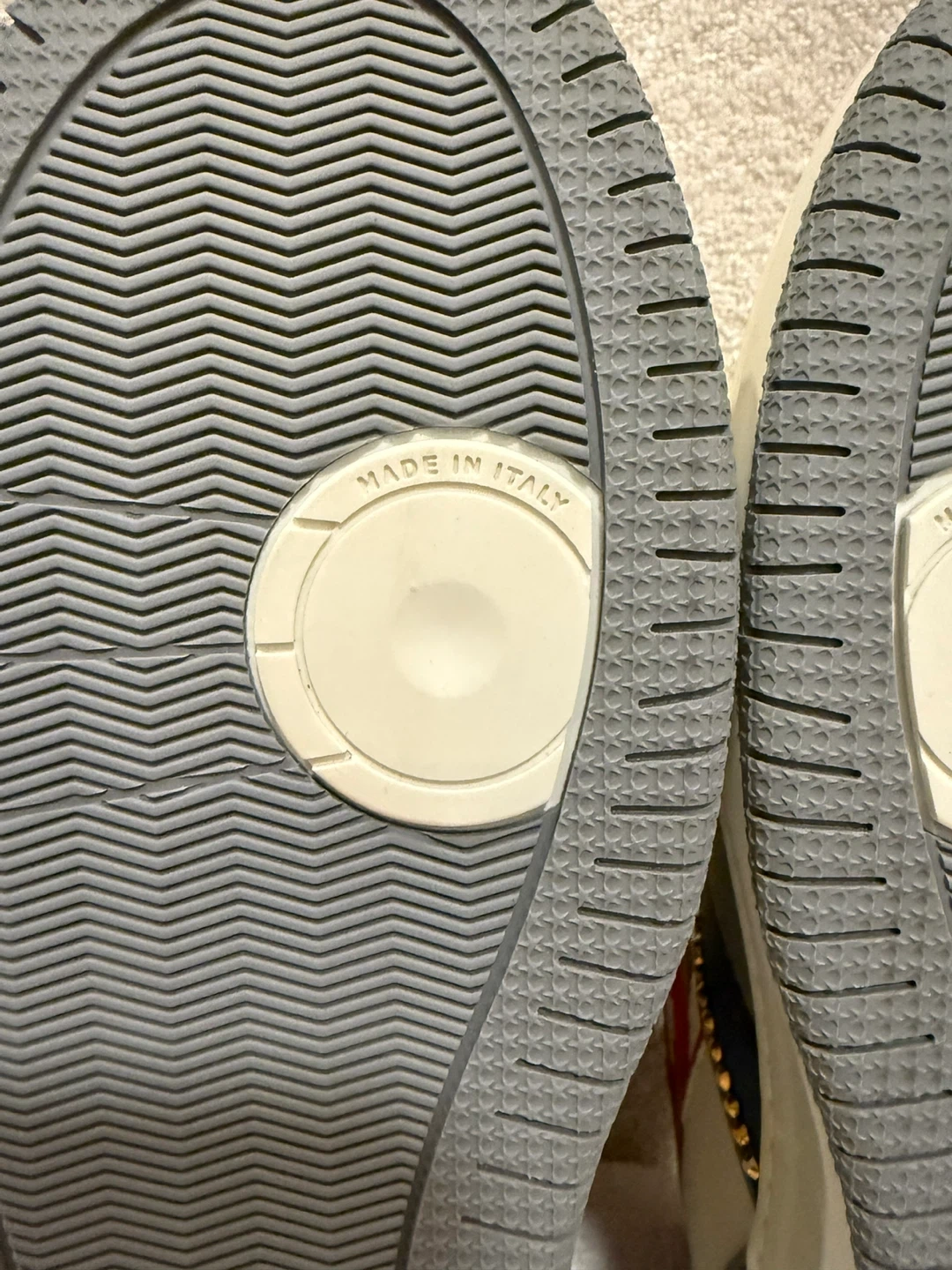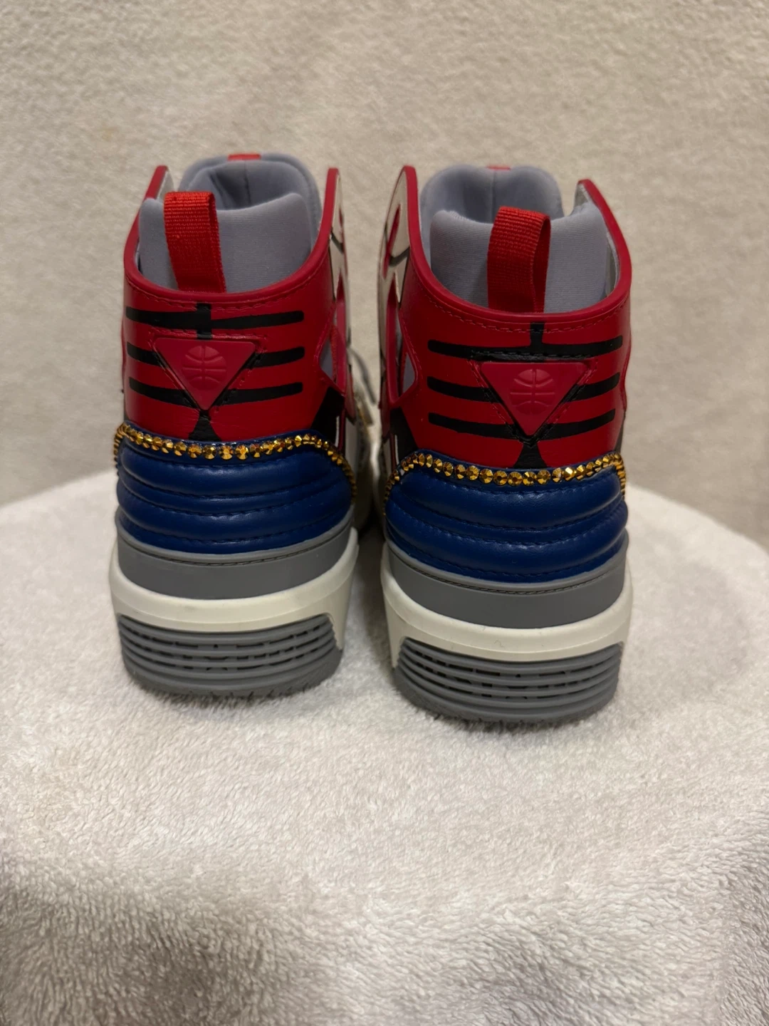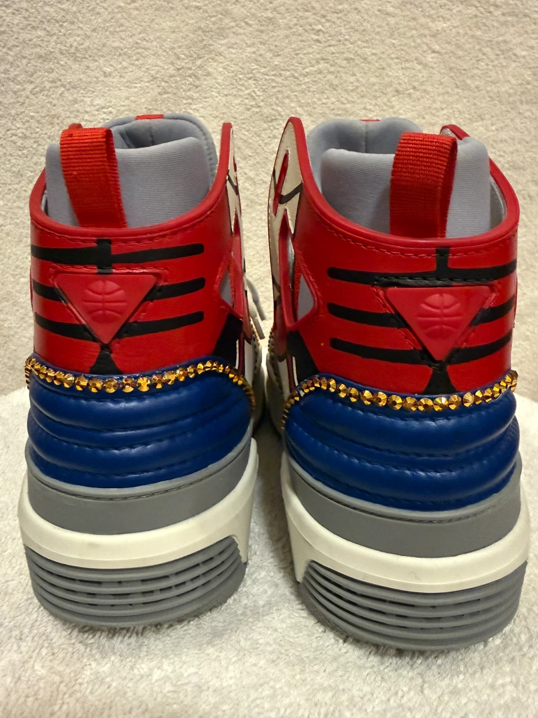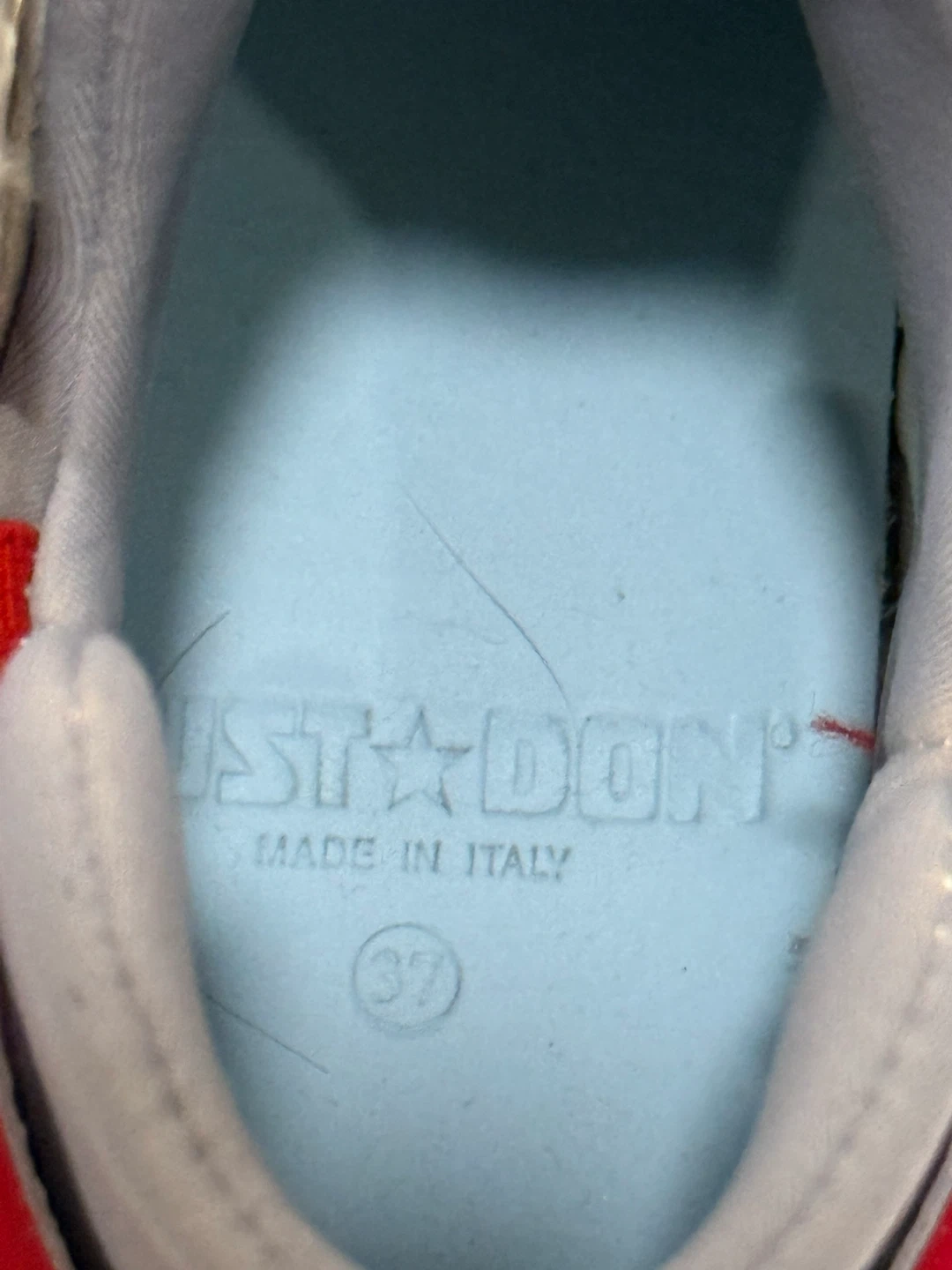 These high top sneakers feature a bold red, white, and blue design with gold accents. They're made in Italy and branded with 'Just Don' on the soles. These unique sneakers are sure to make a statement!