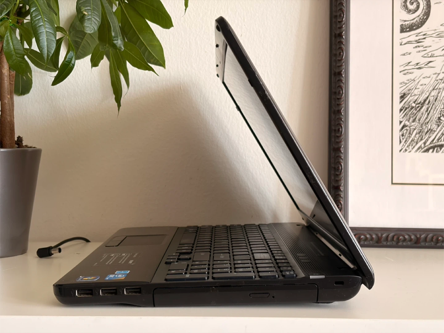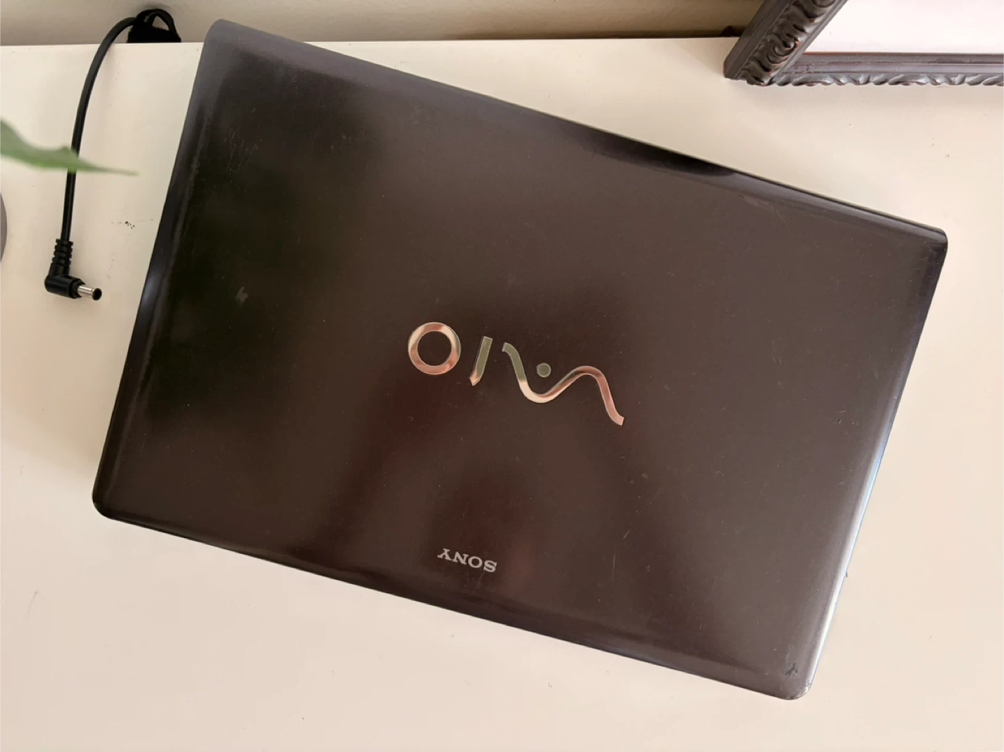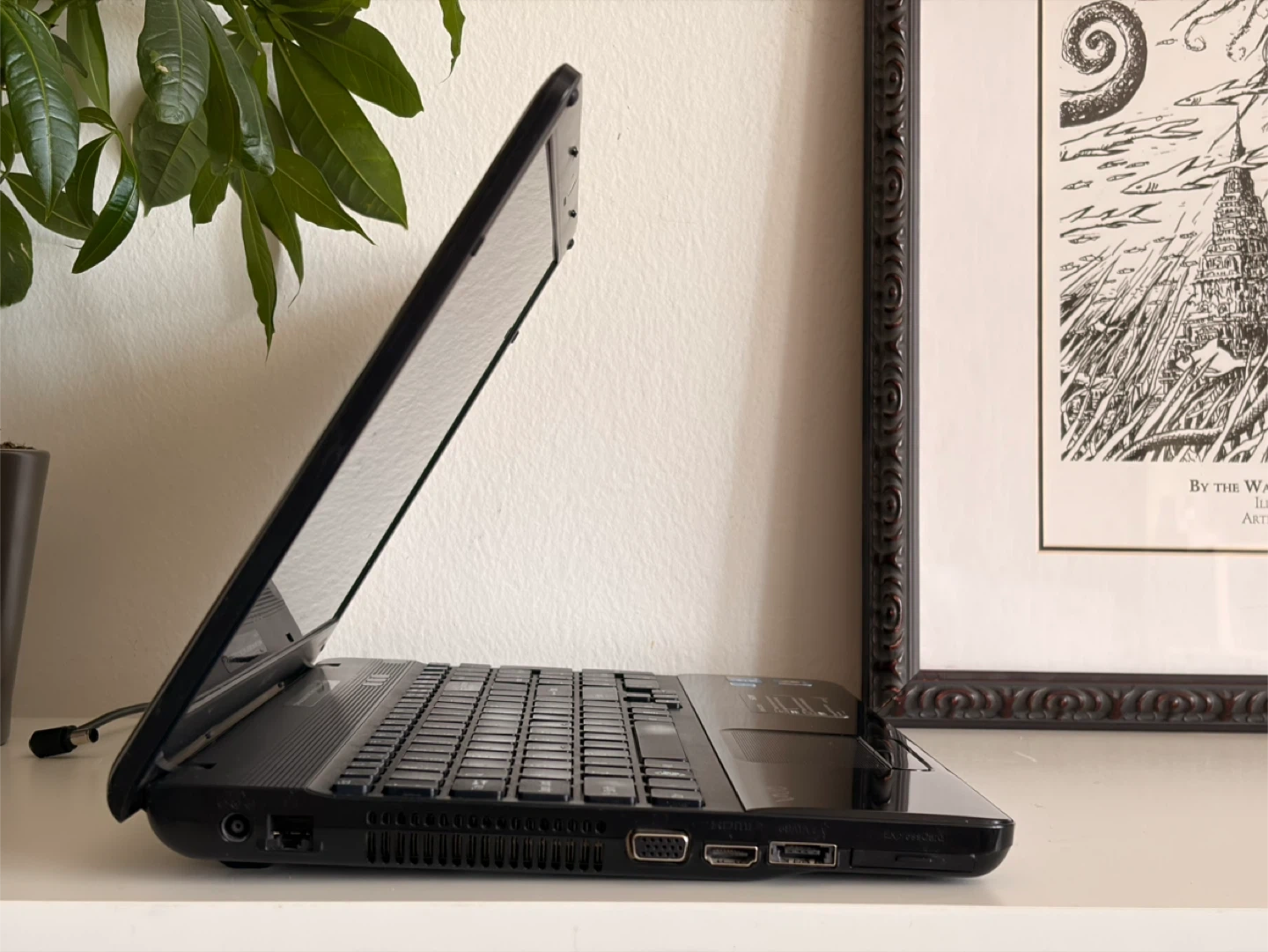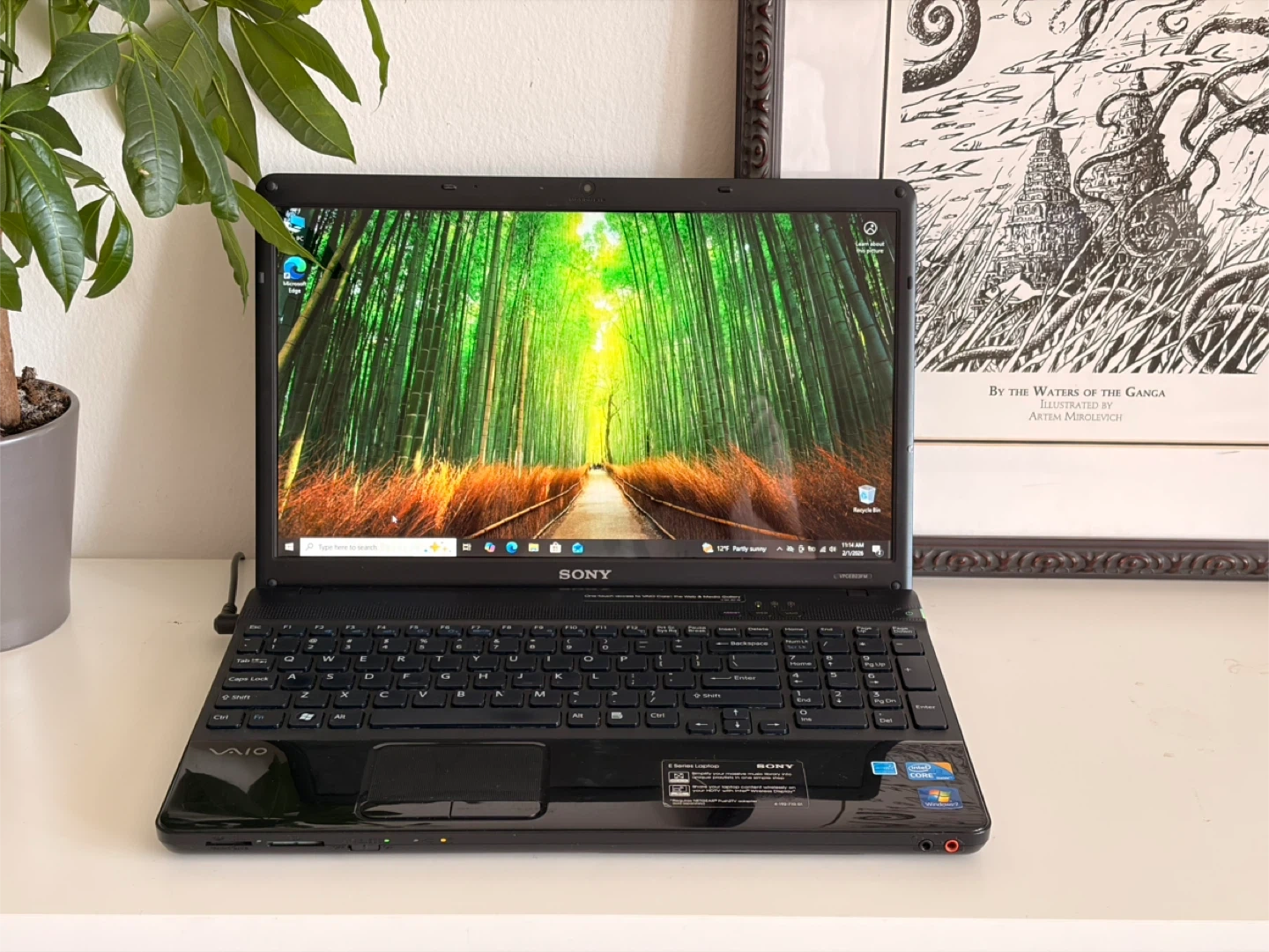 This is a black Sony VAIO E Series laptop. It comes with a full keyboard and touchpad. Multiple ports are available on the sides.