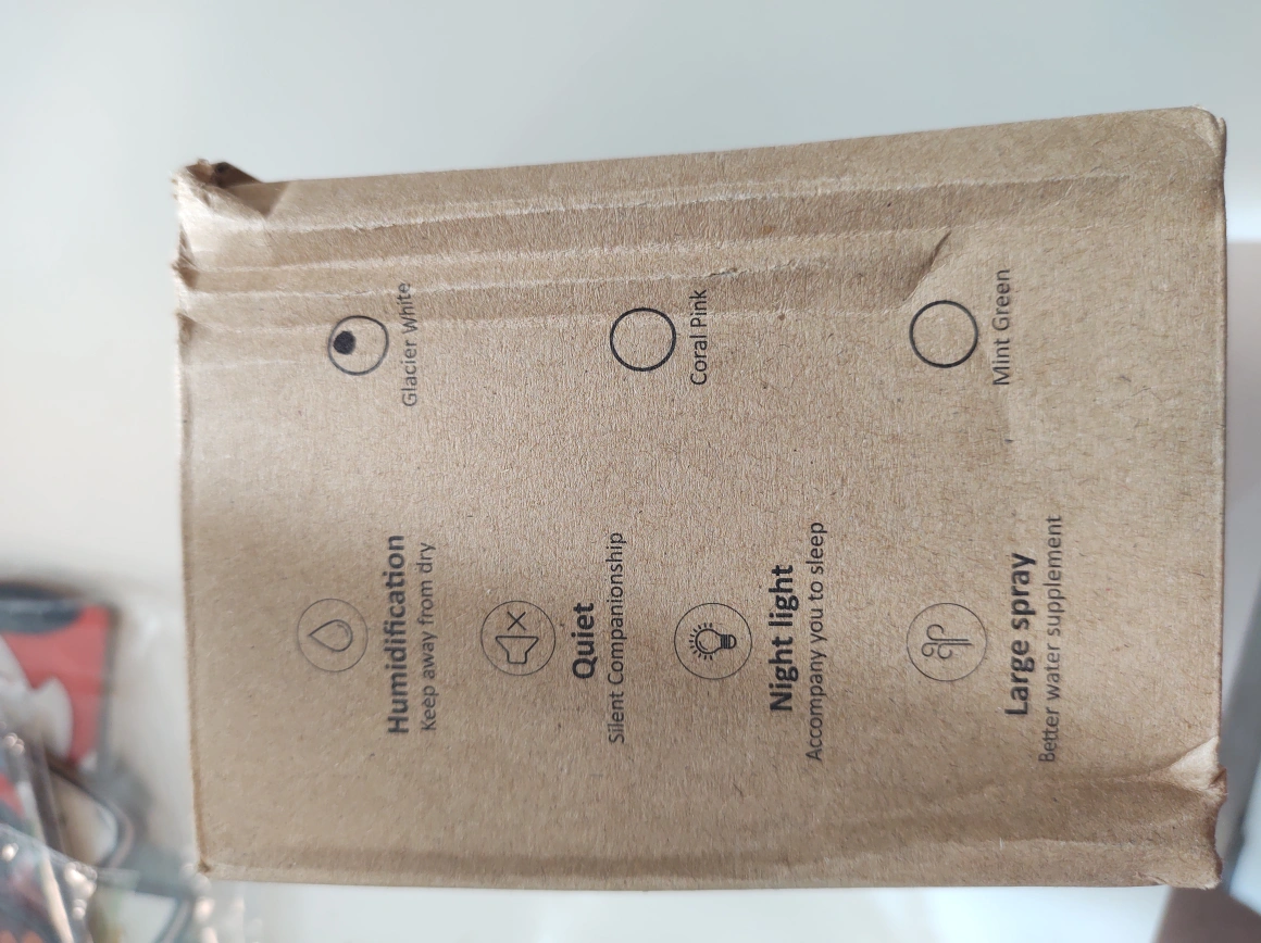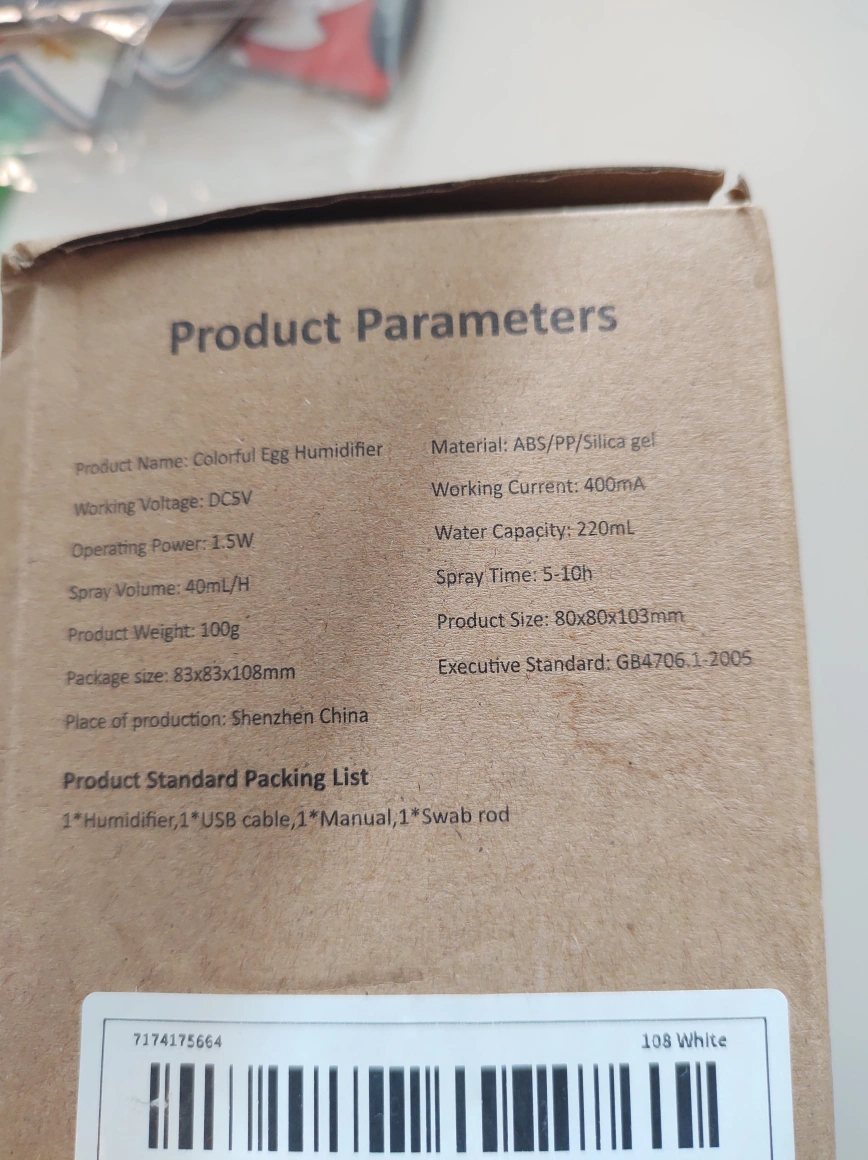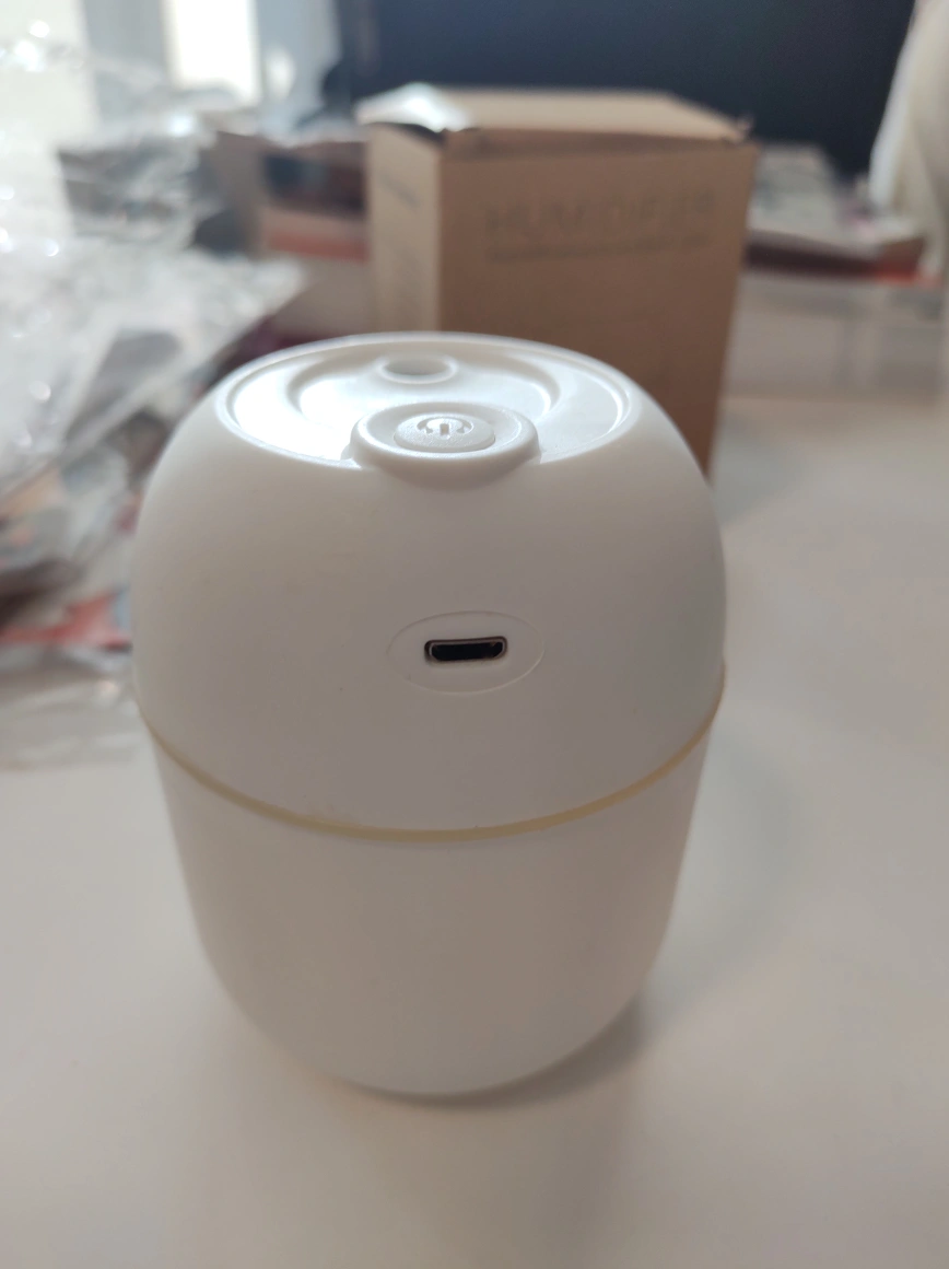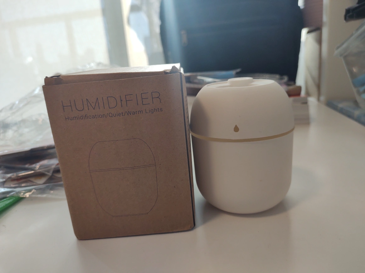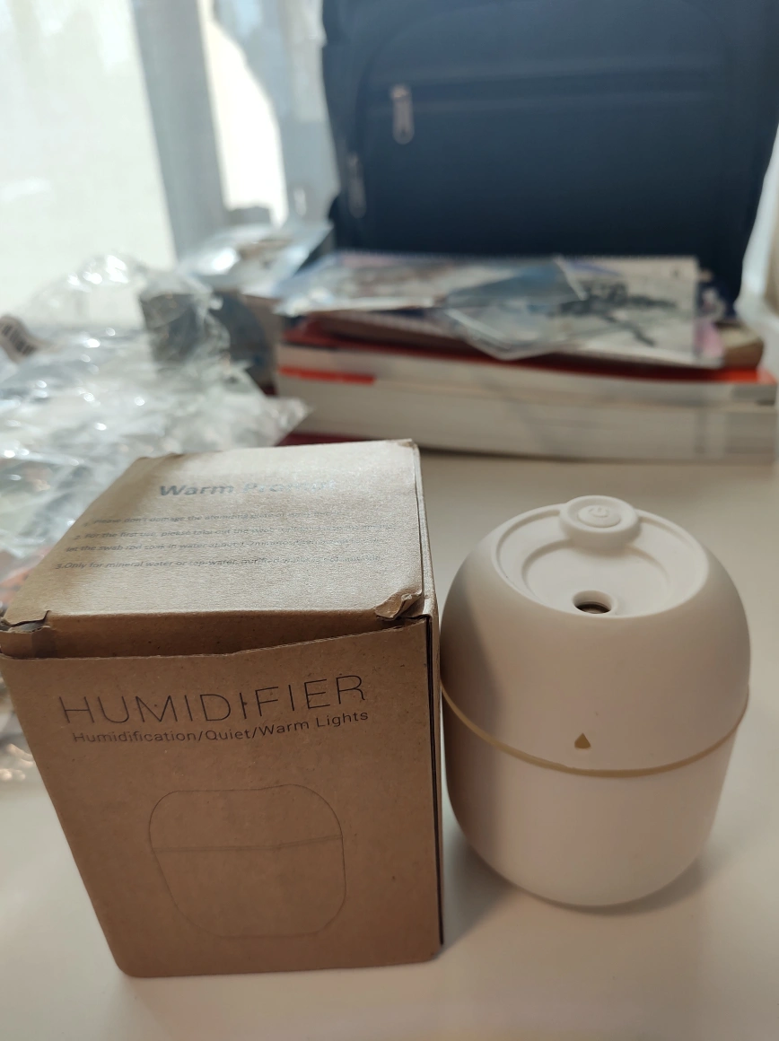Mini humidifier which is rechargeable with simple USB cable (not in the box). It comes with its original box, manual, and an extra swab rod.