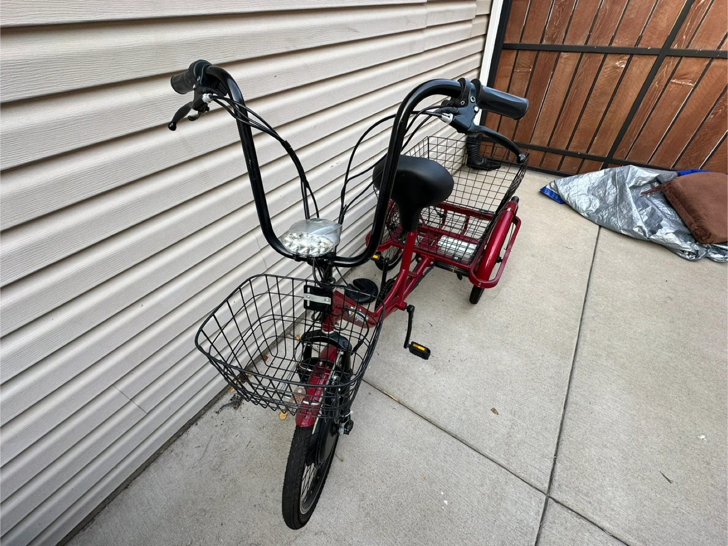 This electric tricycle is red and features a large basket for storage. It has a comfortable seat and handlebars with controls. The front wheel includes a motor, suggesting it's an electric-assist model. Three wheels provide stability.