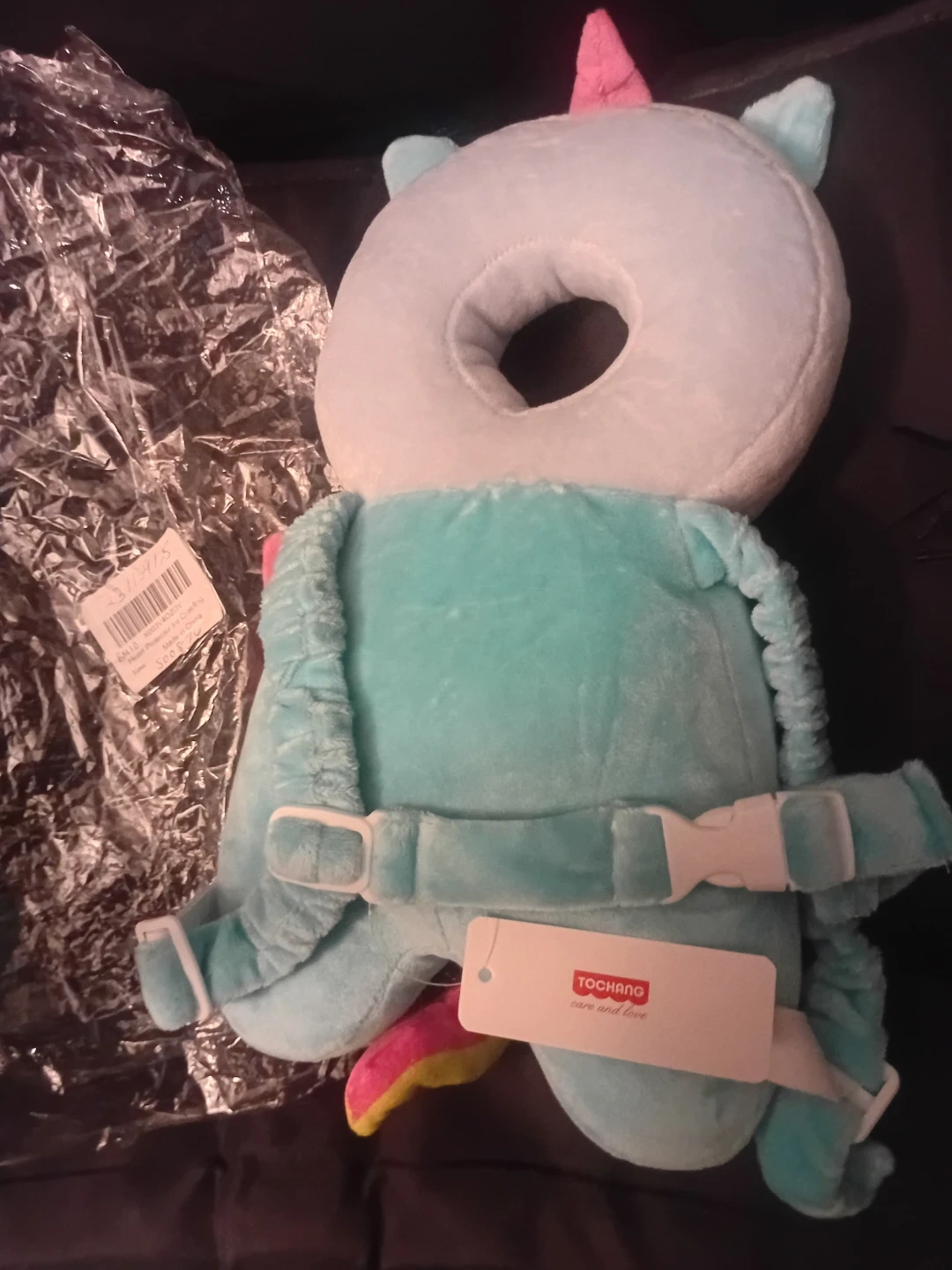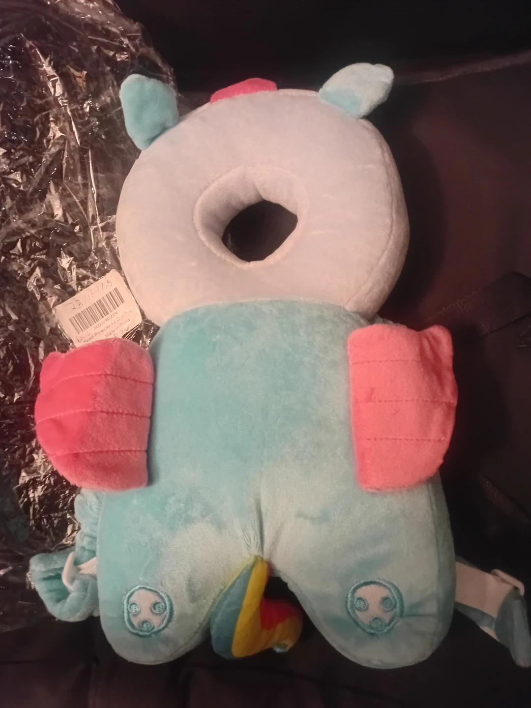 This baby head protector is made from 100% polyester fiber with PP cotton filling. It features adjustable shoulder and chest straps for a secure fit. It's designed to prevent injuries while little ones learn to walk, crawl, and run.