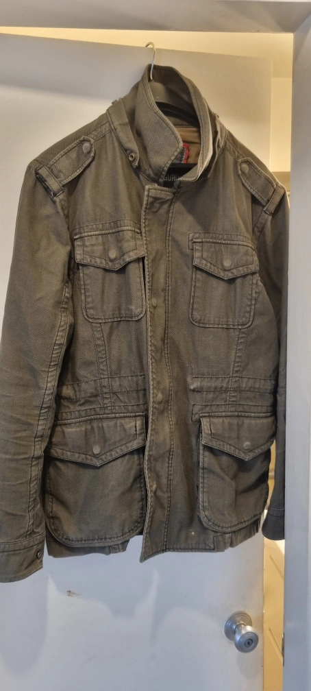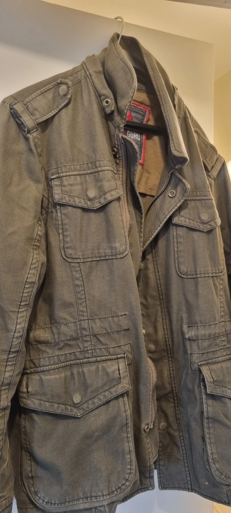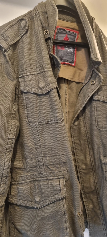 Here's a Guru jacket in an olive green colour. It has a stylish design with multiple pockets and a collared neck. It's perfect for adding a bit of ruggedness to your wardrobe!