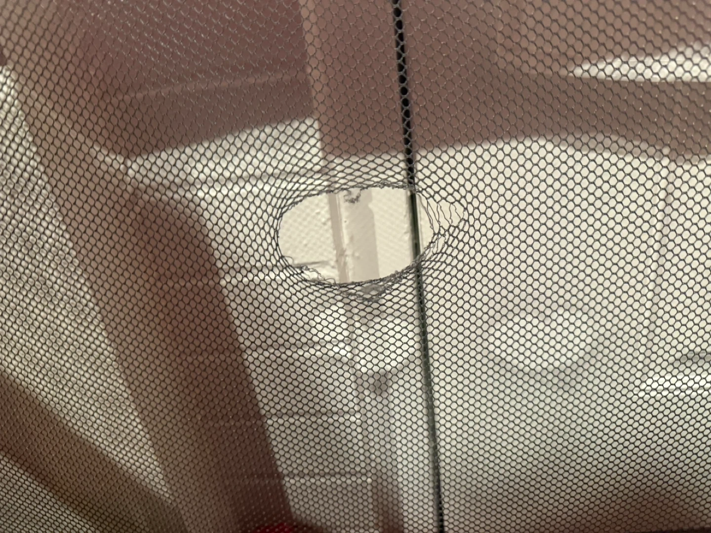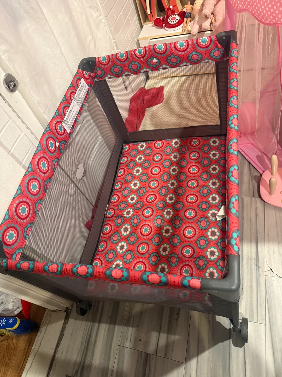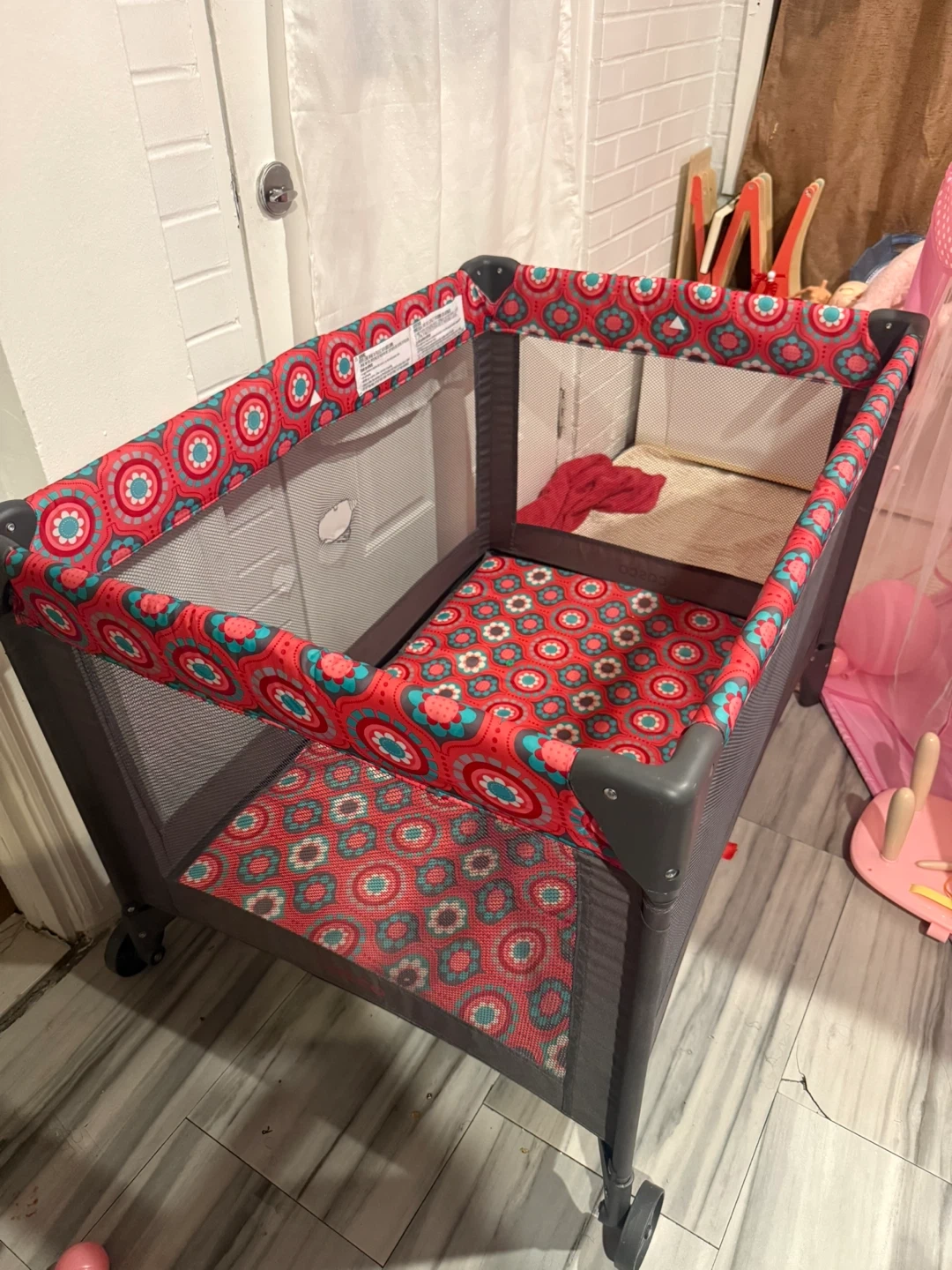 This portable playard is great for naps or playtime. It features a mesh side for visibility. One mesh panel has a small hole, as shown in photos. Folds for portability.