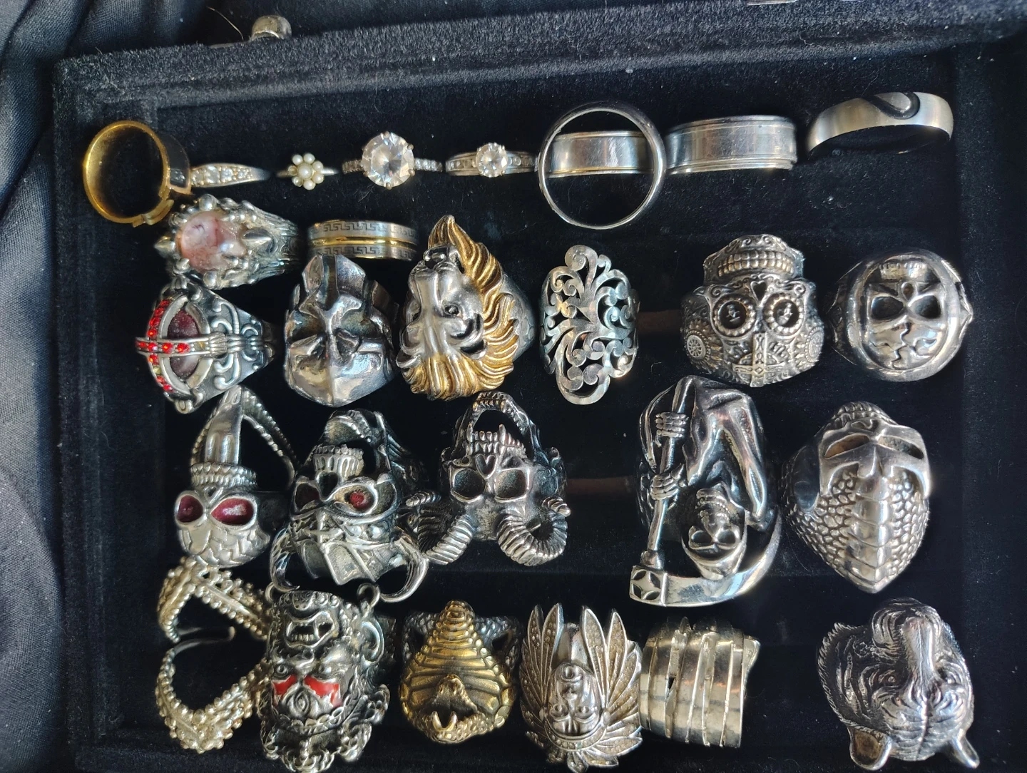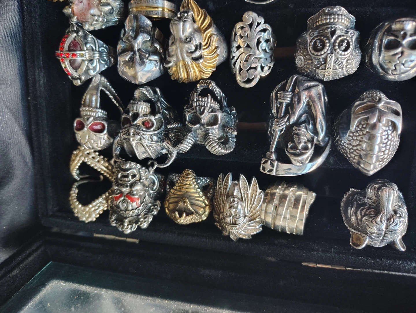This lot features a collection of distinctive rings with various designs. Materials appear to be primarily metal. Styles include skulls, animals, and ornate patterns.