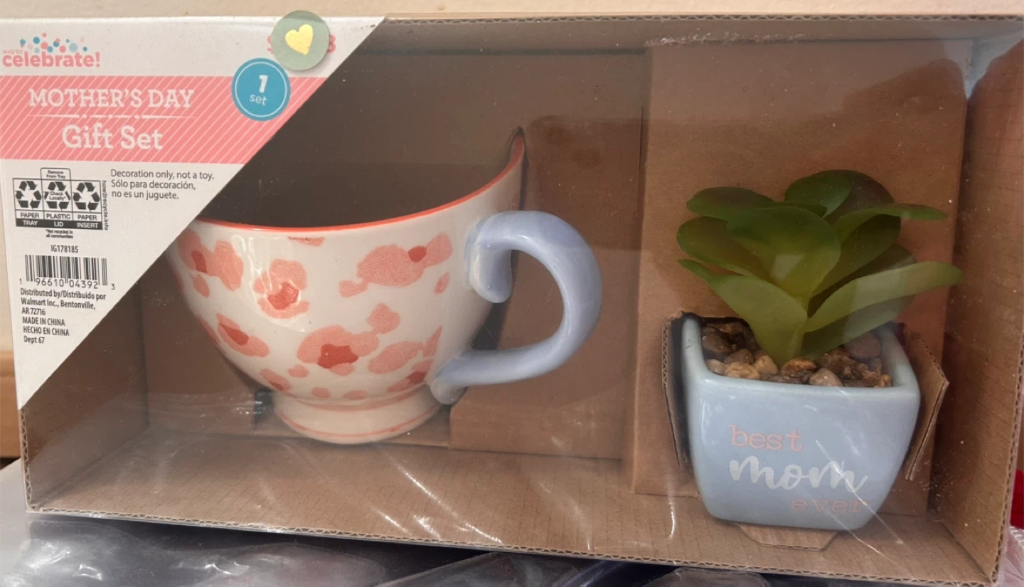 This Mother's Day gift set includes a decorative mug with a pink and white pattern and a light blue handle. It also comes with a small faux plant in a light blue pot that says "best mom ever". Decoration only, not a toy. 🥕