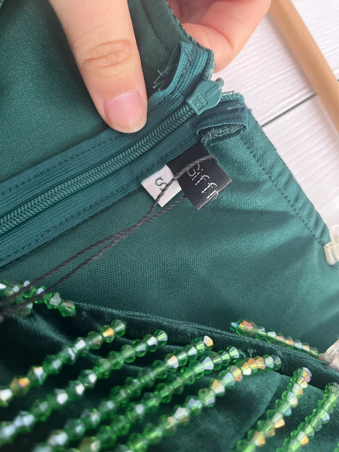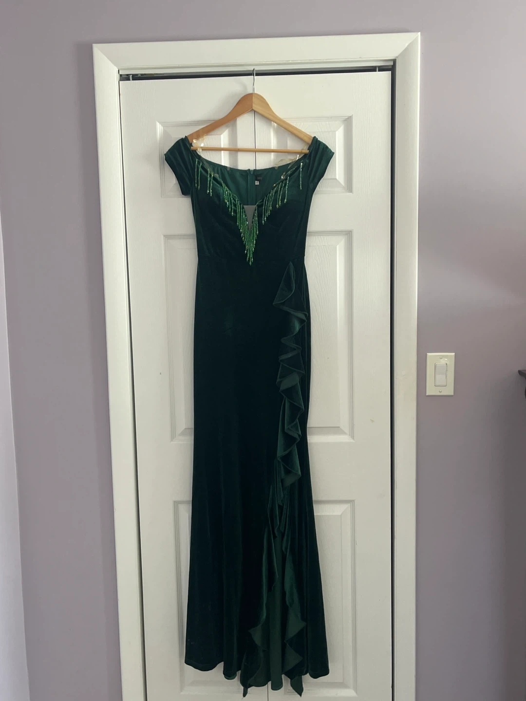 Elegant emerald green velvet gown by Giffniseti. Features an off-the-shoulder design with beaded neckline and ruffled skirt detail. Back zipper closure for a secure fit.