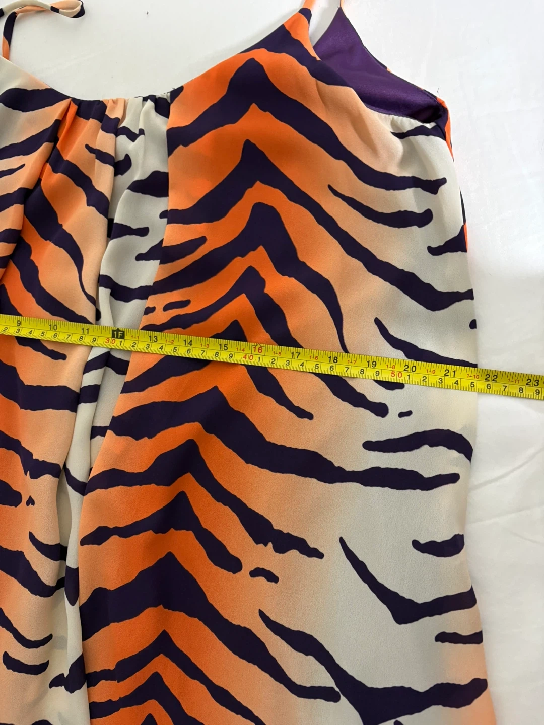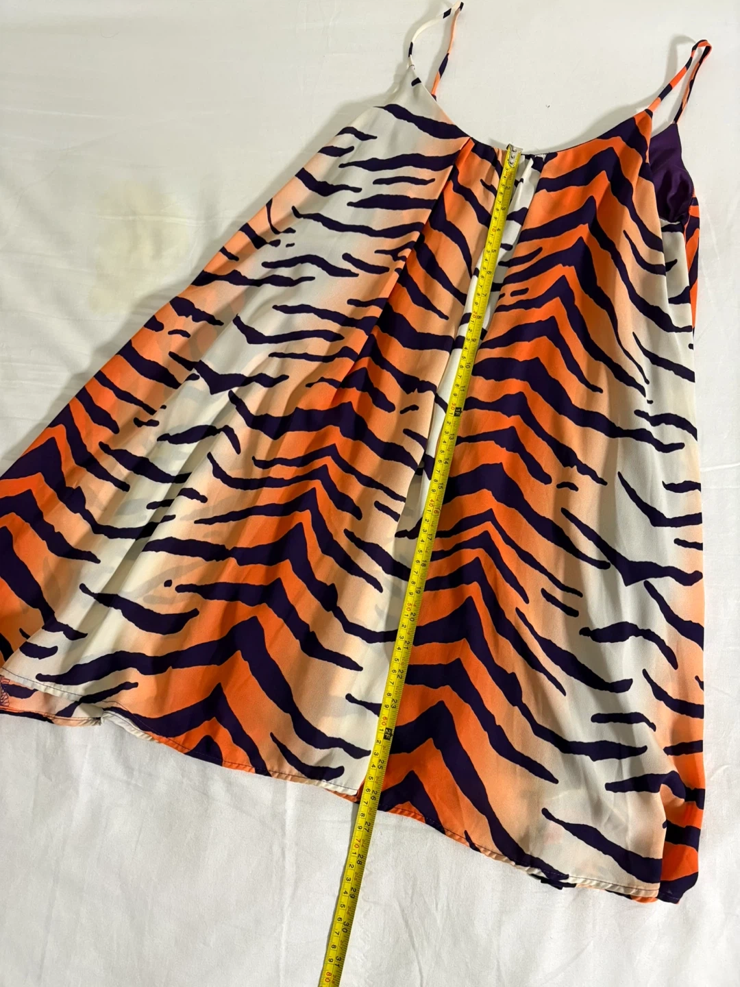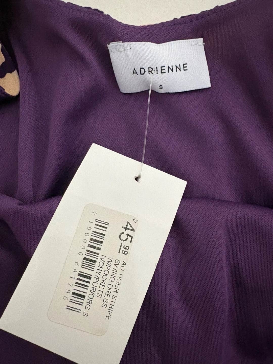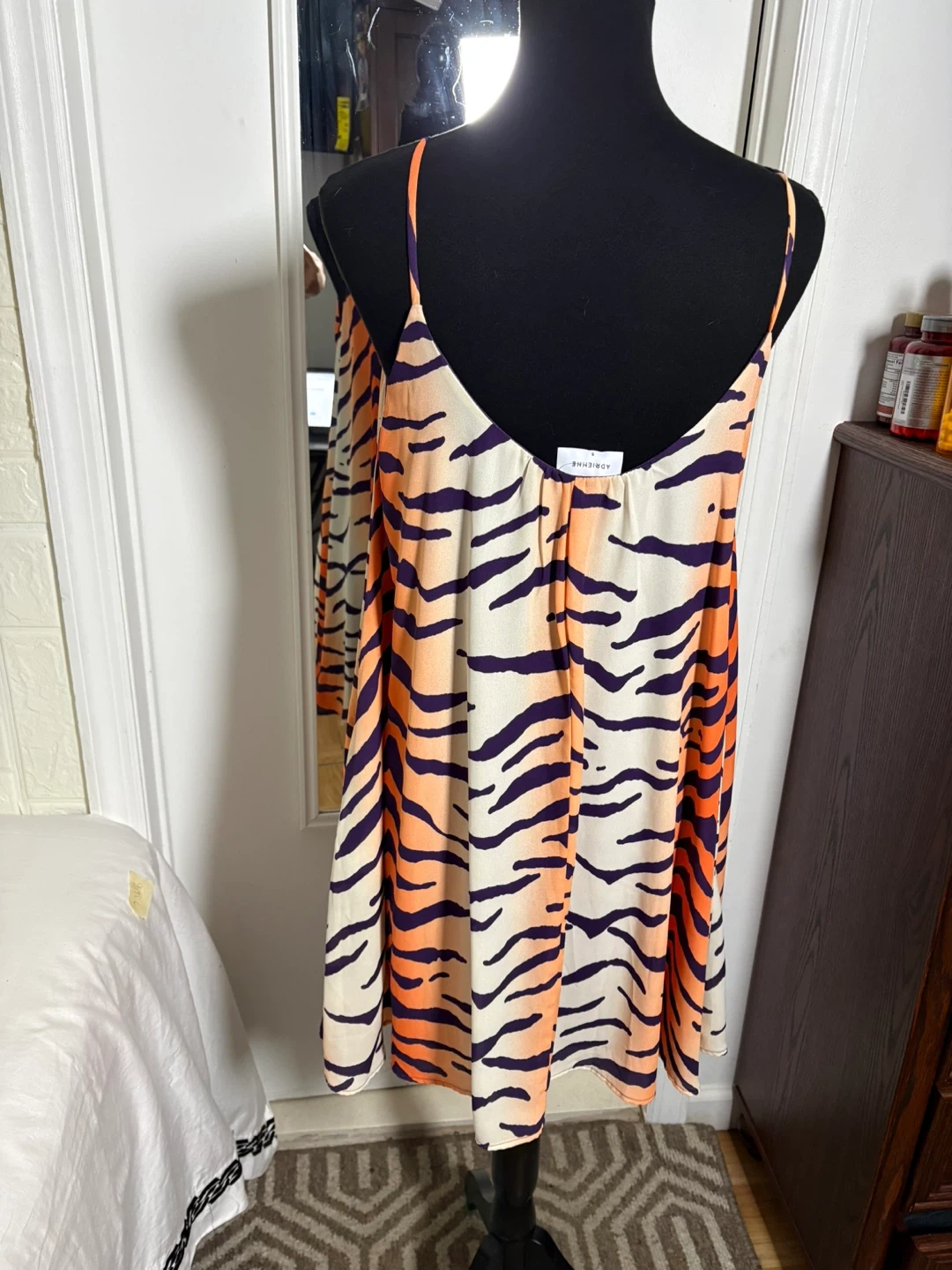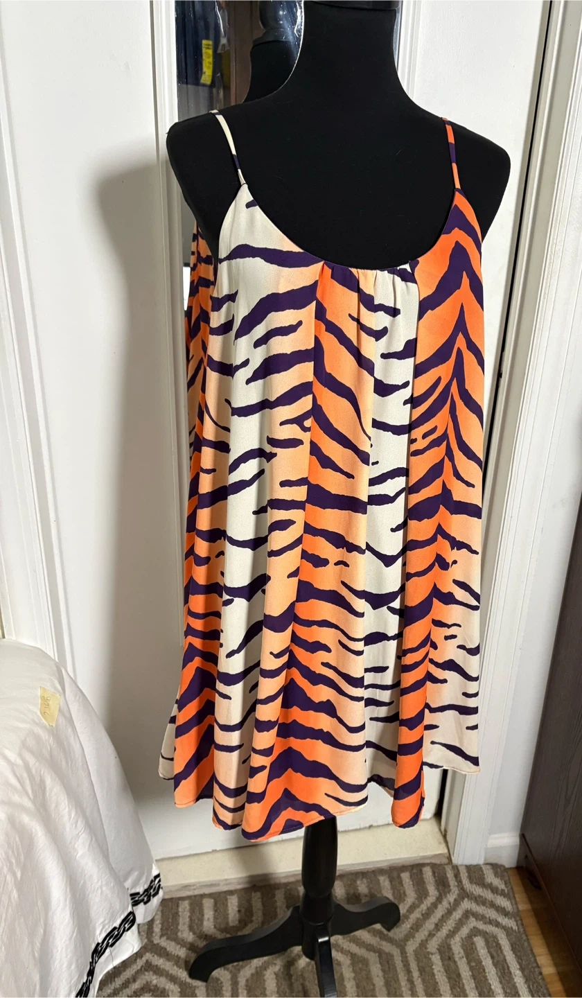 Adrienne brand swing dress with a tiger print in ivory, orange, and purple. Size is small. It's lightweight and has a flowy fit. Perfect for a casual day out!
