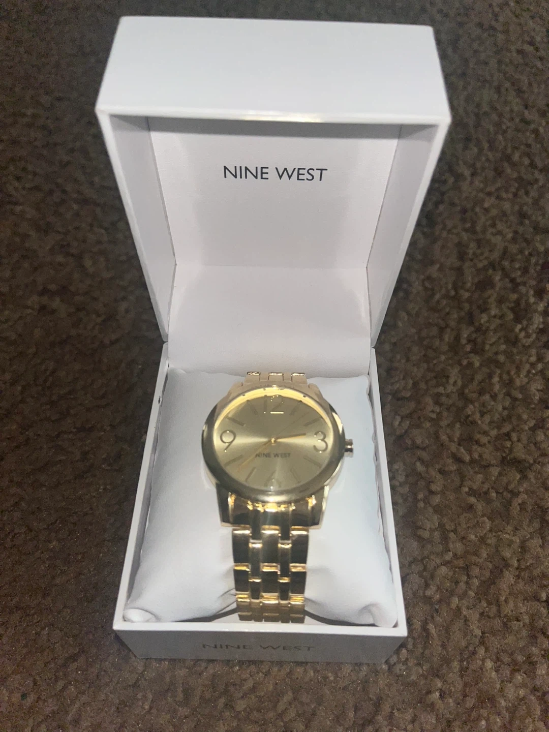 Selling a beautiful Nine West gold watch! It's in excellent condition and comes with its original box. This stylish timepiece is perfect for any occasion and adds a touch of elegance to your look