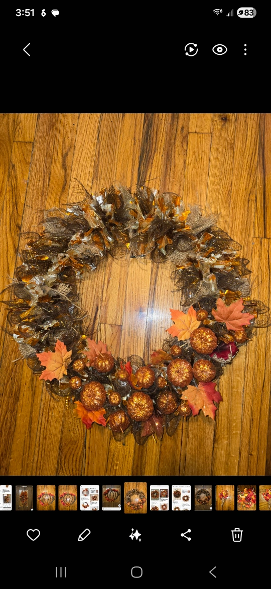 15Beautiful fall-themed wreath featuring glittery pumpkins and leaves! Perfect for adding a touch of autumn to your home decor