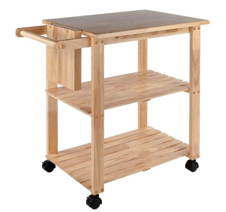 Winsome brand, bought new from Target. 31.93 Inches (H) x 33.19 Inches (W) x 20.47 Inches (D) Two shelves, knife block, towel rack, and pull out cutting board Used car for a year. Cutting board barely used. Upon assembly a wood chip cracked off of the knife block and there is a wooden screw cap missing. Otherwise cart works fine. Wheels lock. Might need some screws tightened. Worked better for my old space which is why I’m selling it Pick up in Hamilton Heights