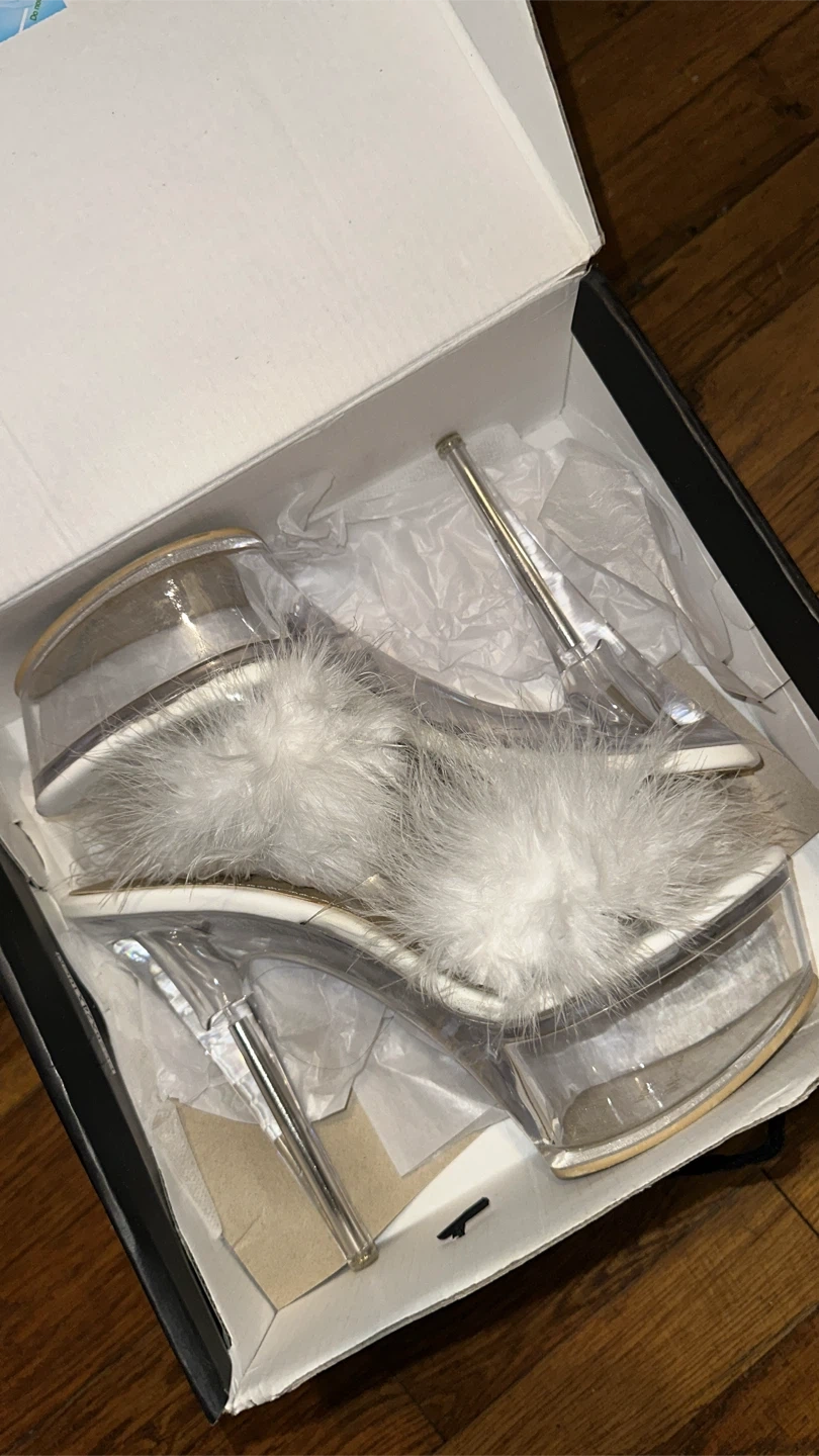 Size 7.5 clear heels with white fur trim. Perfect for a stylish look.