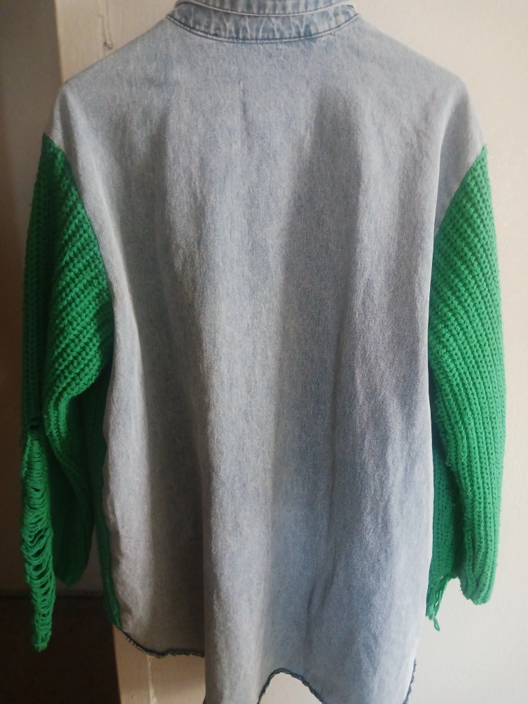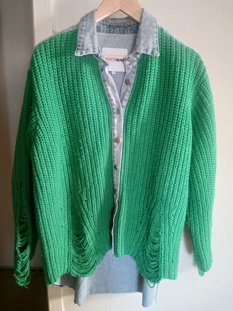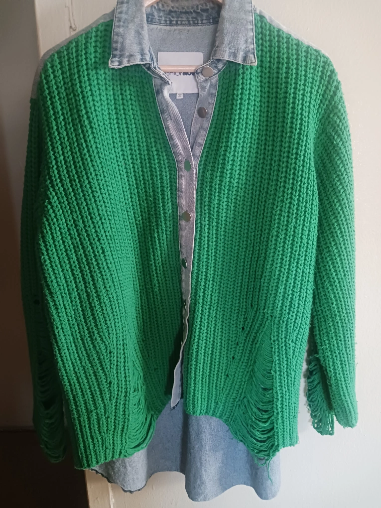 Selling a Fashion Nova green knit jacket with denim details! It features a button-down front and a unique blend of knit and denim materials. Great for adding a pop of color to your wardrobe!great for fall time