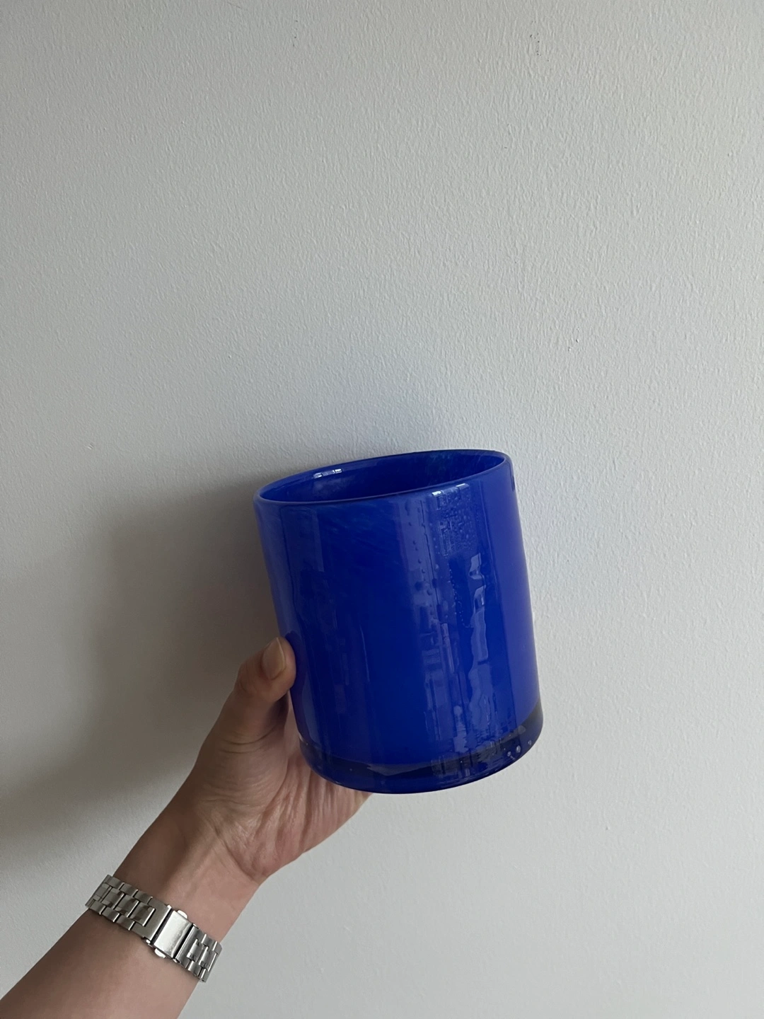 Beautiful blue glass vase! It's a vibrant and eye-catching piece that would look great with any decor. The color is a rich, deep blue. Can also be used for tea lights, as a pencil holder, etc