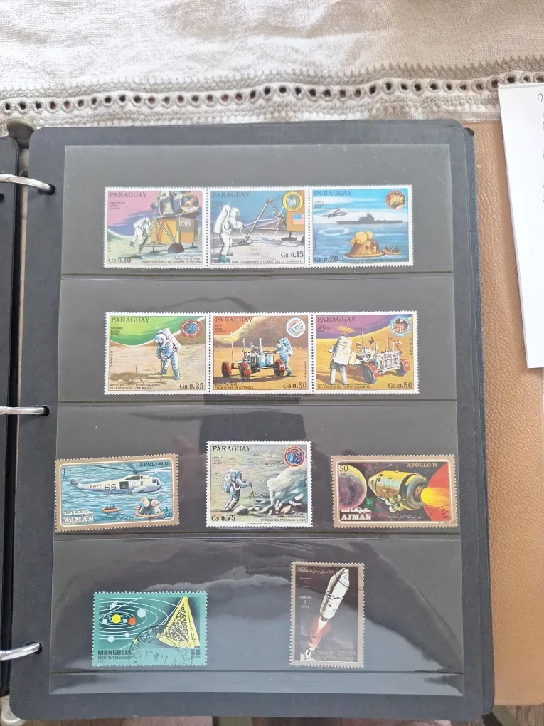 Collection of space-themed postage stamps from Paraguay and Ajman. Features Apollo 15 missions and astronaut activities. Various denominations shown.