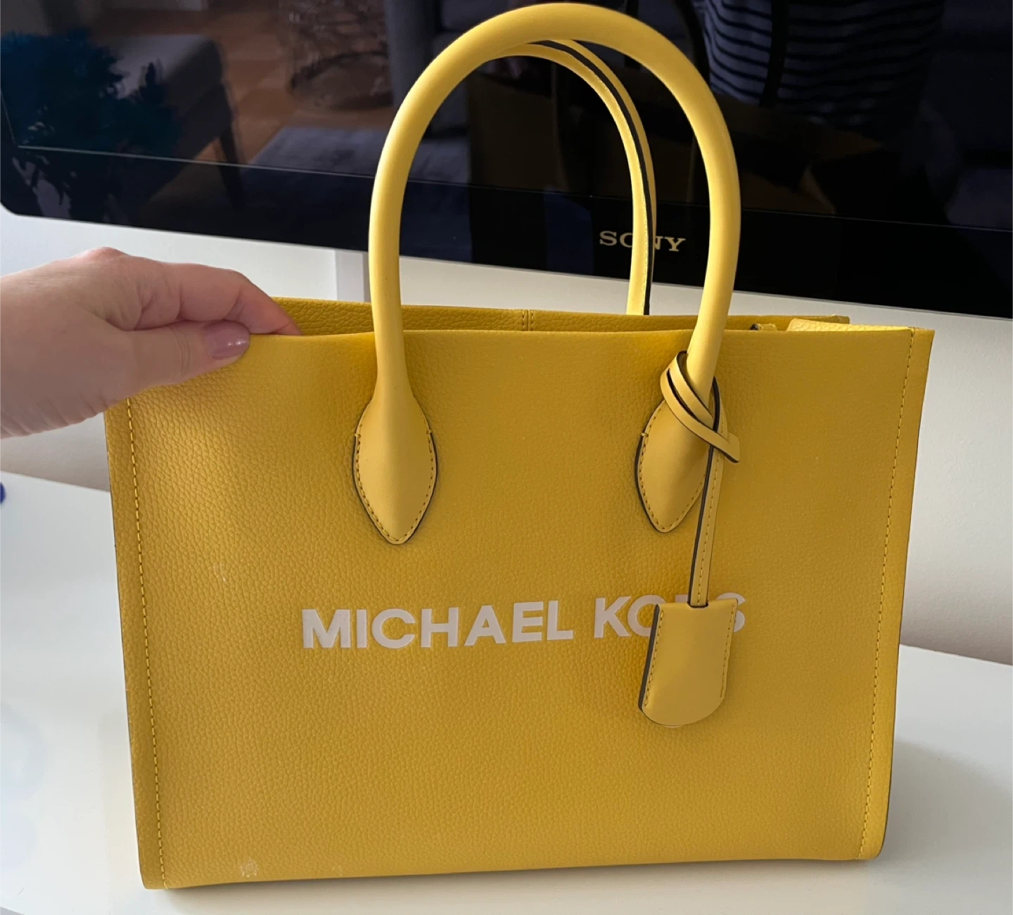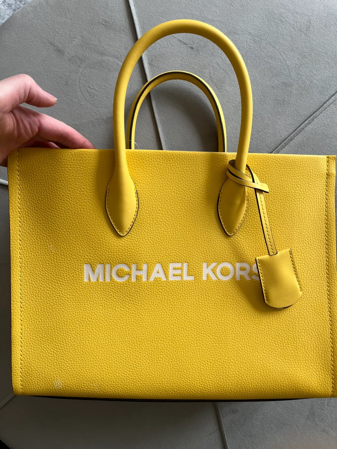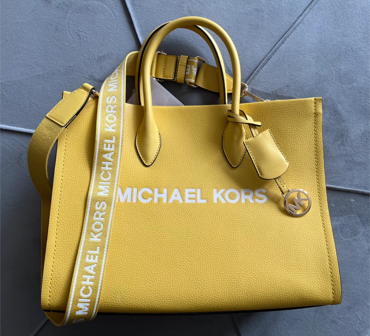 This is a yellow leather tote bag from Michael Kors. It features the brand name printed on the front and a detachable strap. Interior is lined with branded fabric and includes a zip pocket.