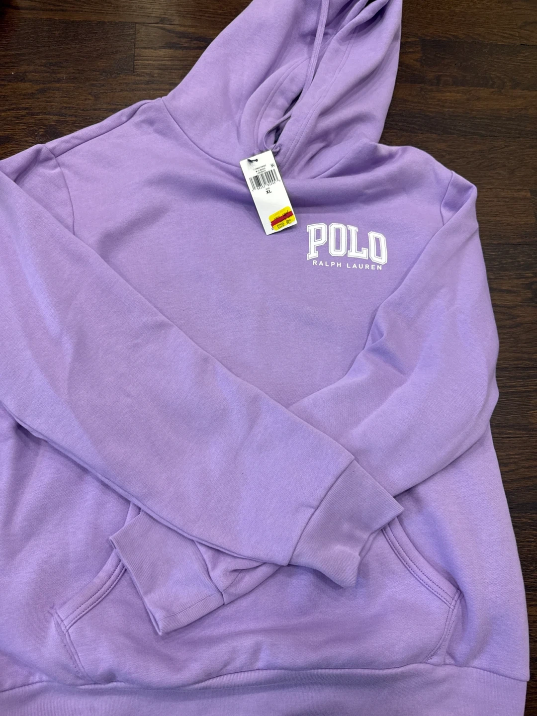 This is a Polo Ralph Lauren hoodie in a lavender color. It's a size XL. The hoodie is made from a soft material and features a front pocket and adjustable hood.