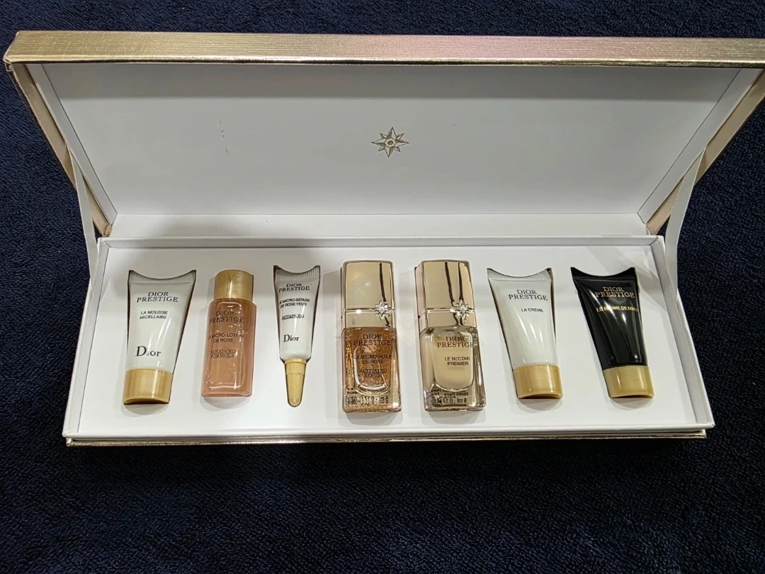 This Dior Prestige skincare set includes a collection of mini products. It's presented in a beautiful gold gift box. The set contains several creams and serums from the Prestige line.