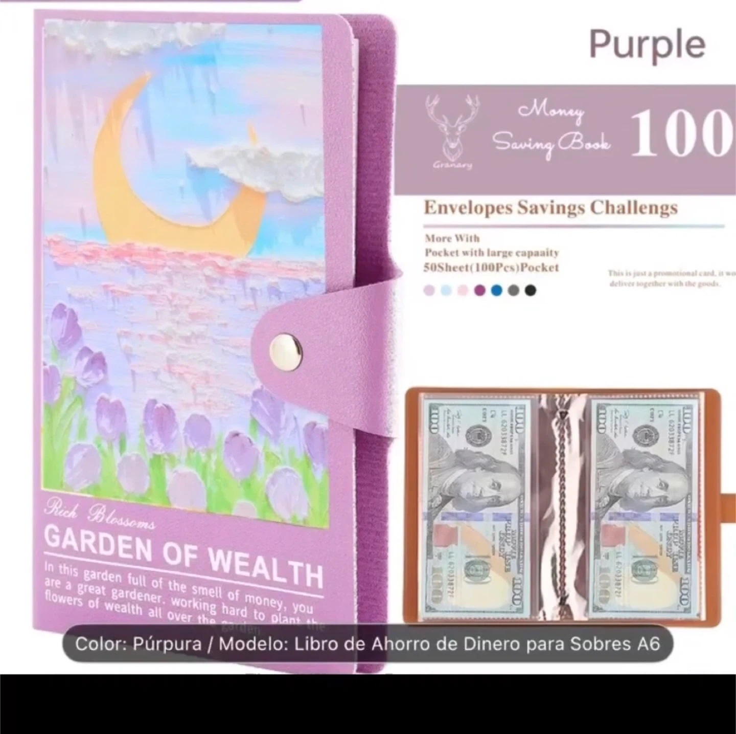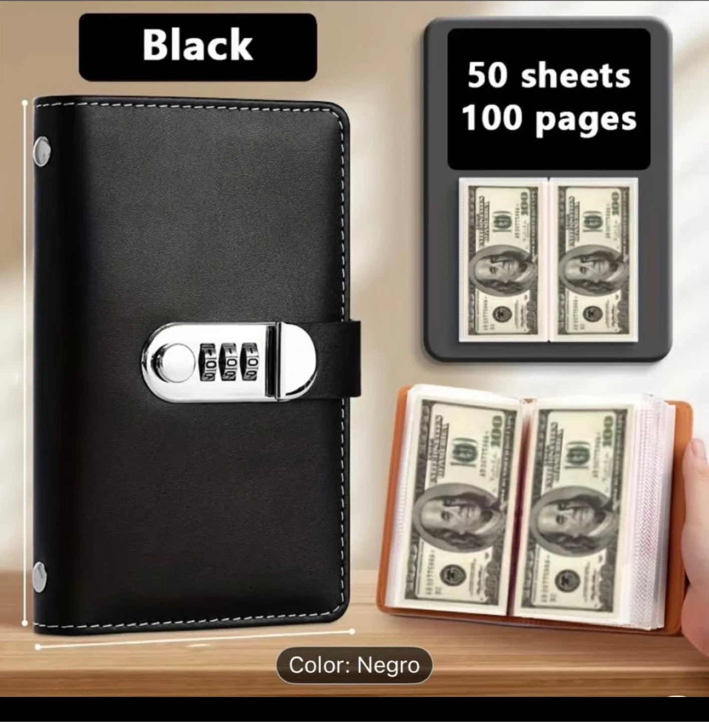 This notebook features a password lock closure and includes a bill holder. It comes with 50 sheets and 100 pages. The metal hidden buckle ensures no loose pages.