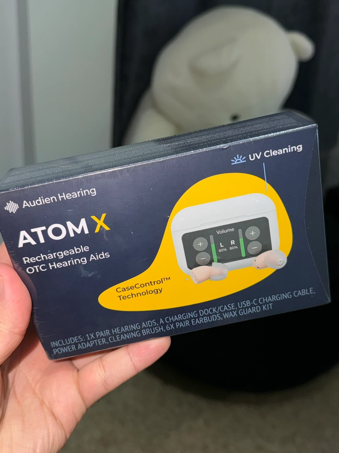 Audien AtomX rechargeable OTC hearing aids. Includes 1x pair hearing aids, charging dock/case, USB-C charging cable, power adapter, cleaning brush, and 6x pair earbuds. UV cleaning feature included.