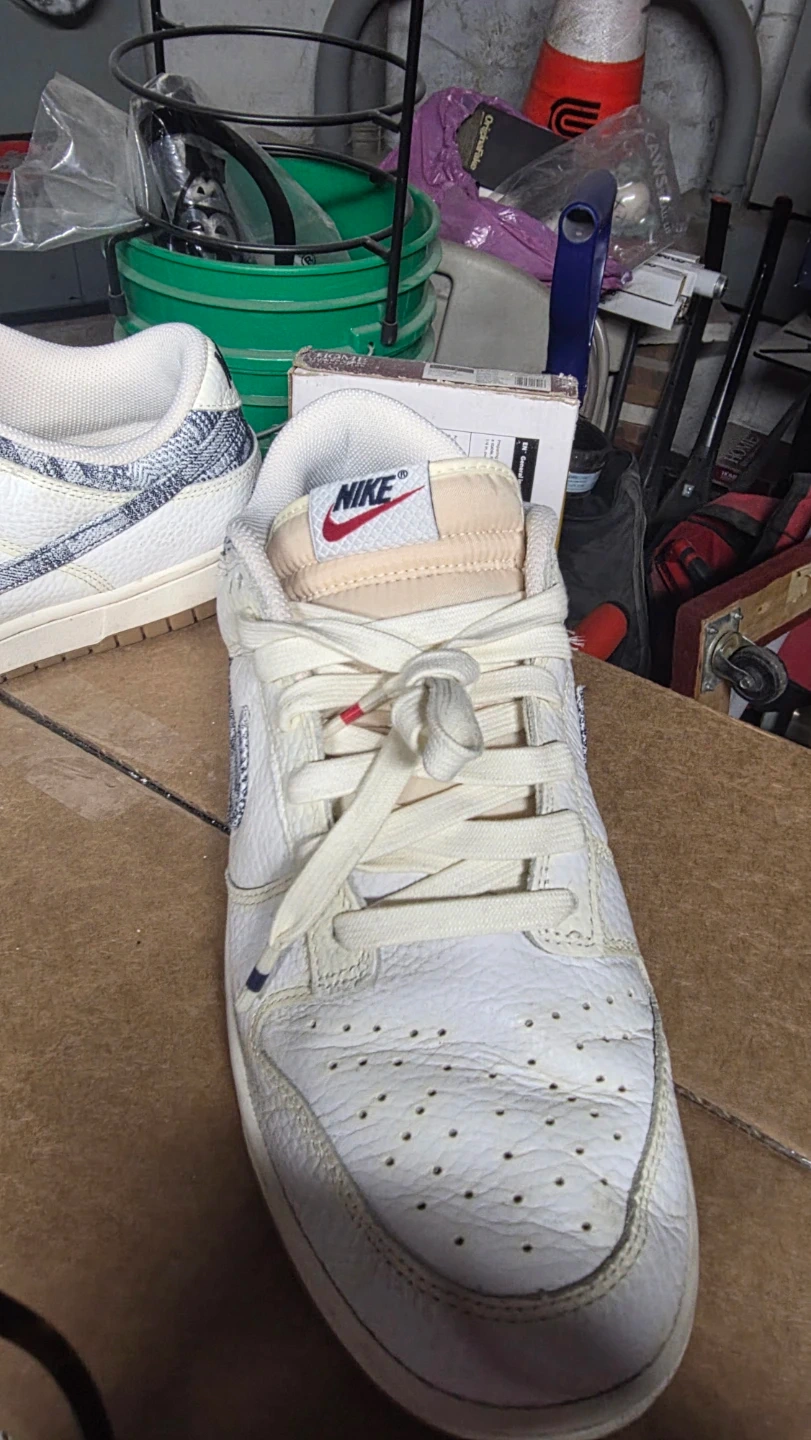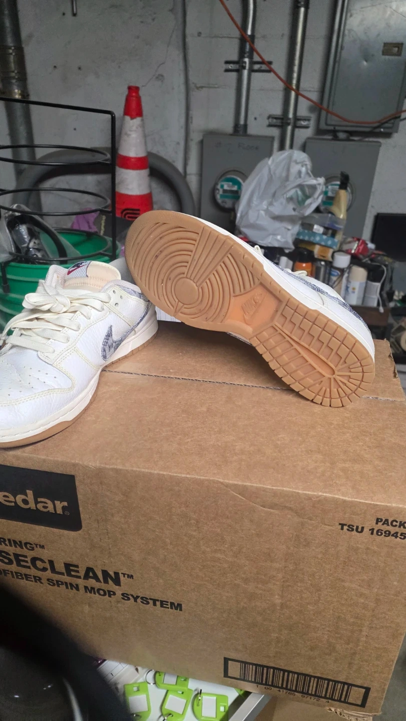 These are Nike Dunk Low sneakers in white with blue accents. They feature a leather construction with a gum sole. A classic silhouette for everyday wear.