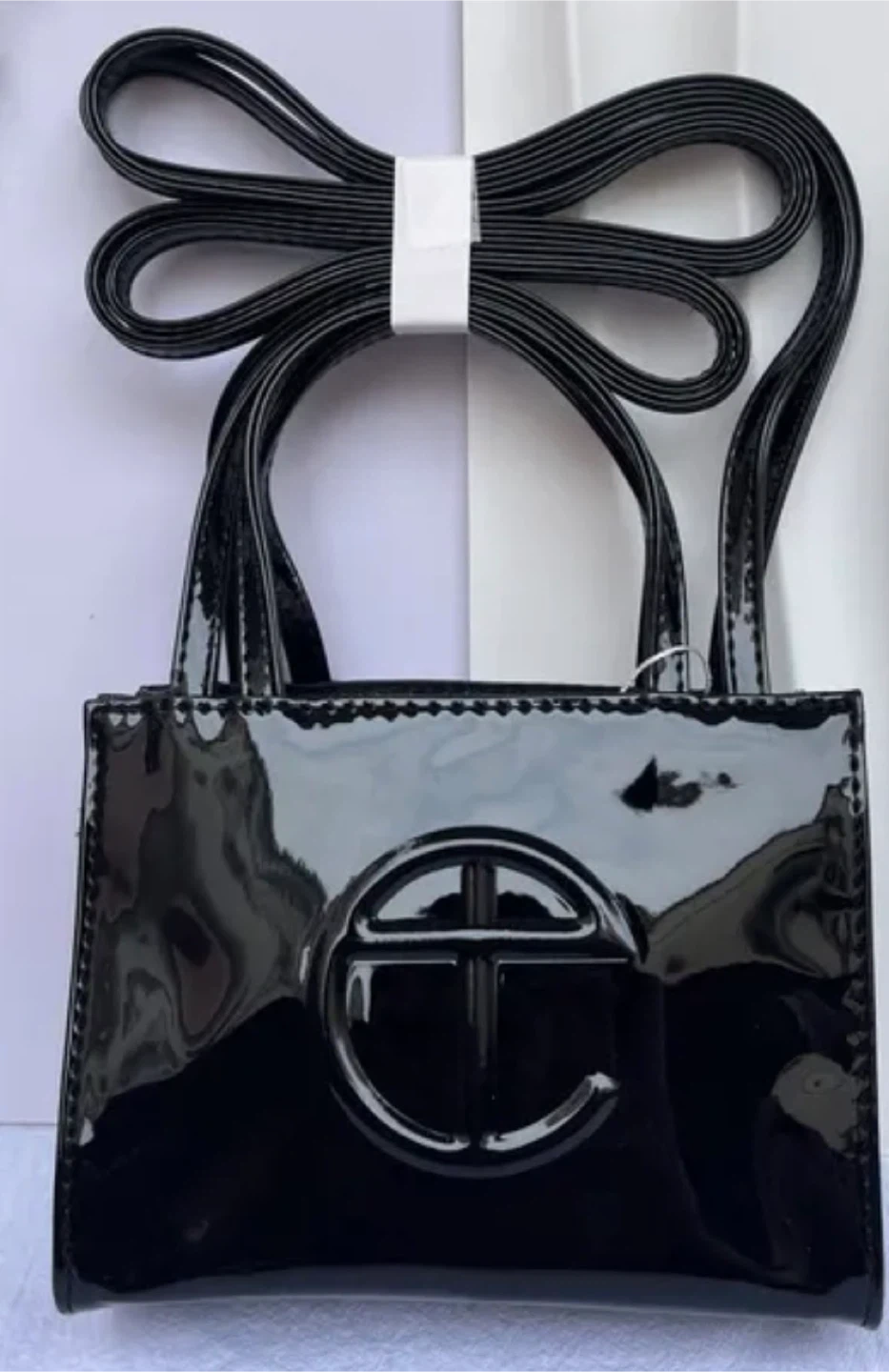 Black patent leather Telfar shopping bag. It has double top handles and a detachable crossbody strap. The signature Telfar logo is embossed on the front.