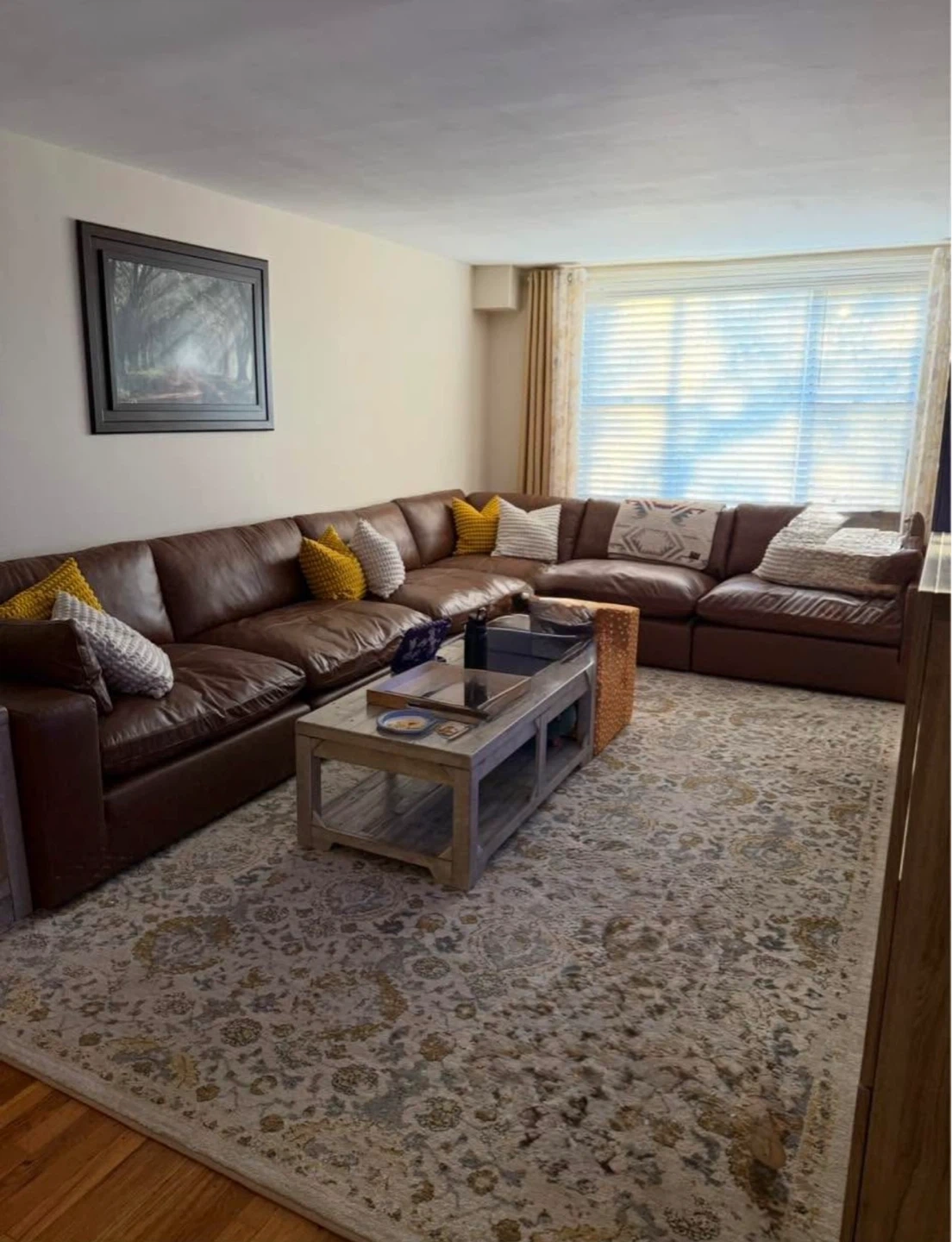 Spacious brown leather sectional sofa. Plenty of seating for the whole family or guests. Comfortable and stylish addition to any living room!