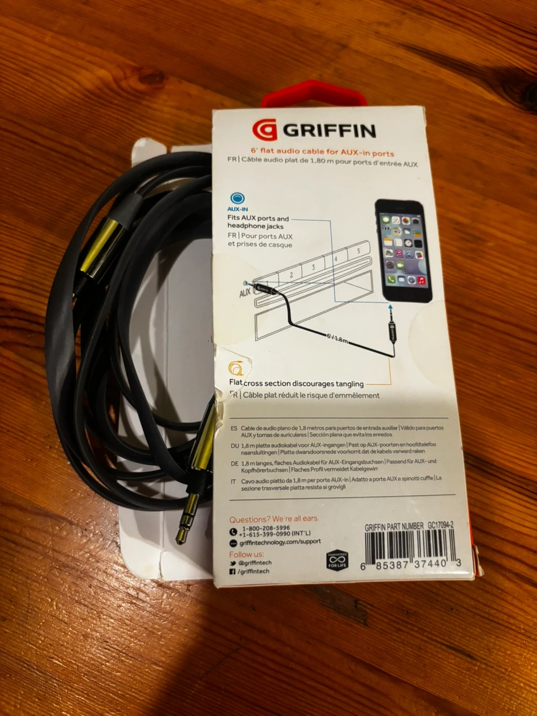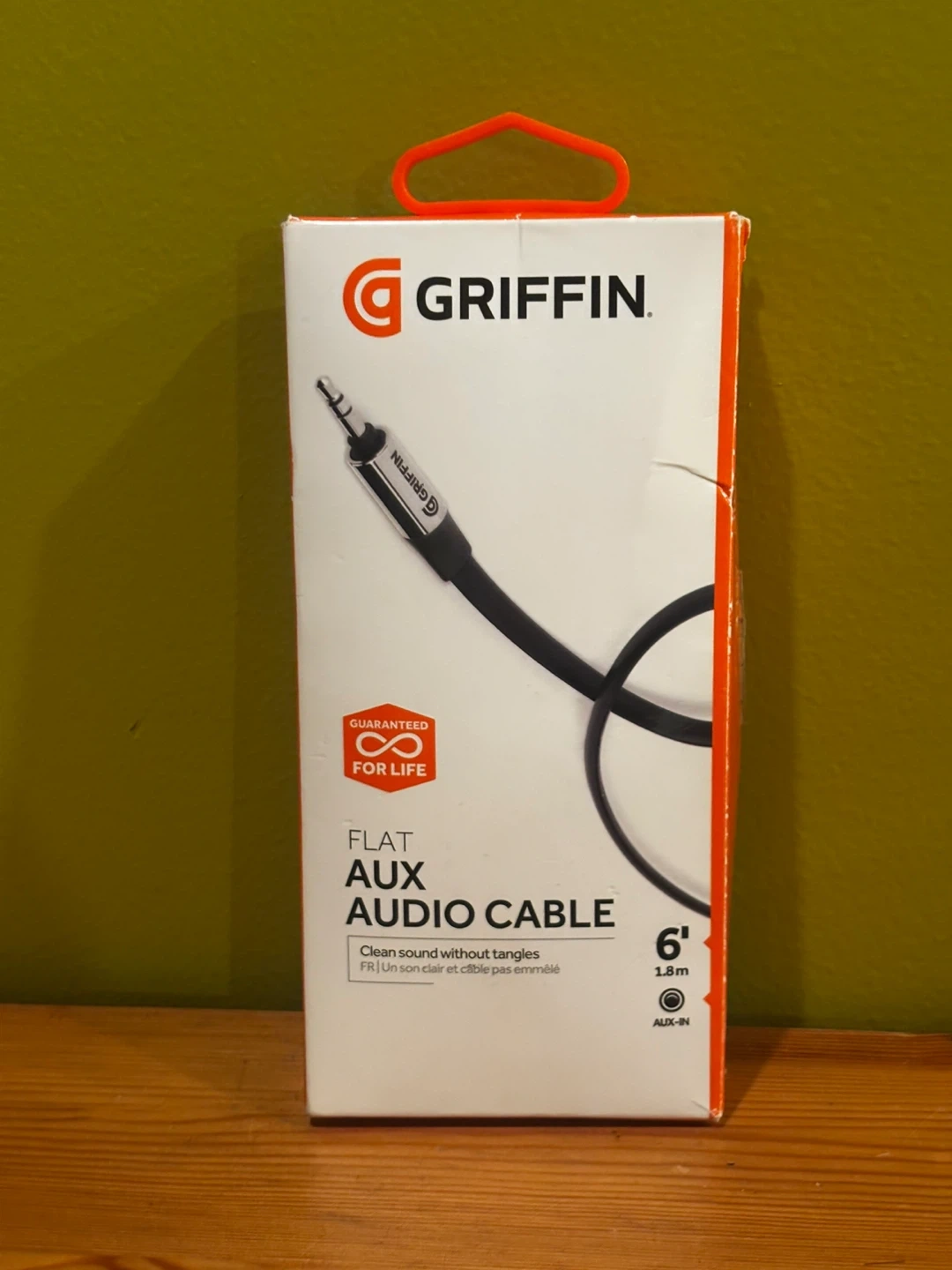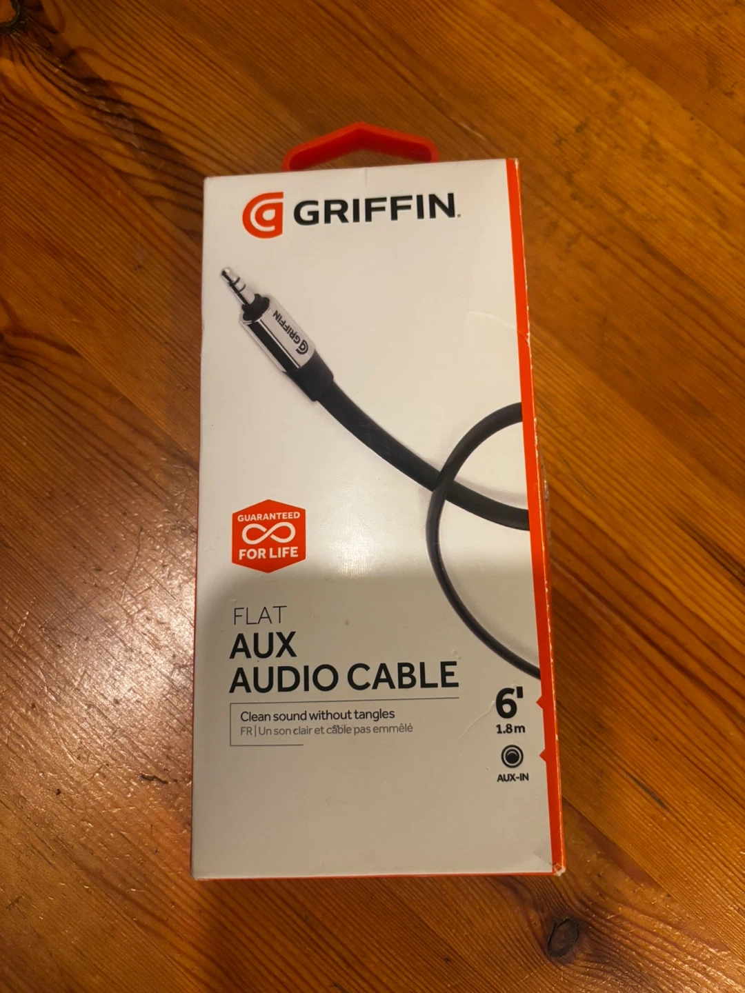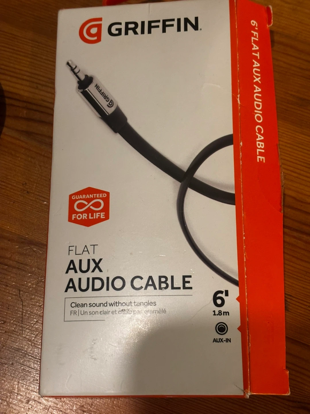This is a 6-foot flat aux audio cable from Griffin. It fits aux ports and headphone jacks. The flat design helps prevent tangles!