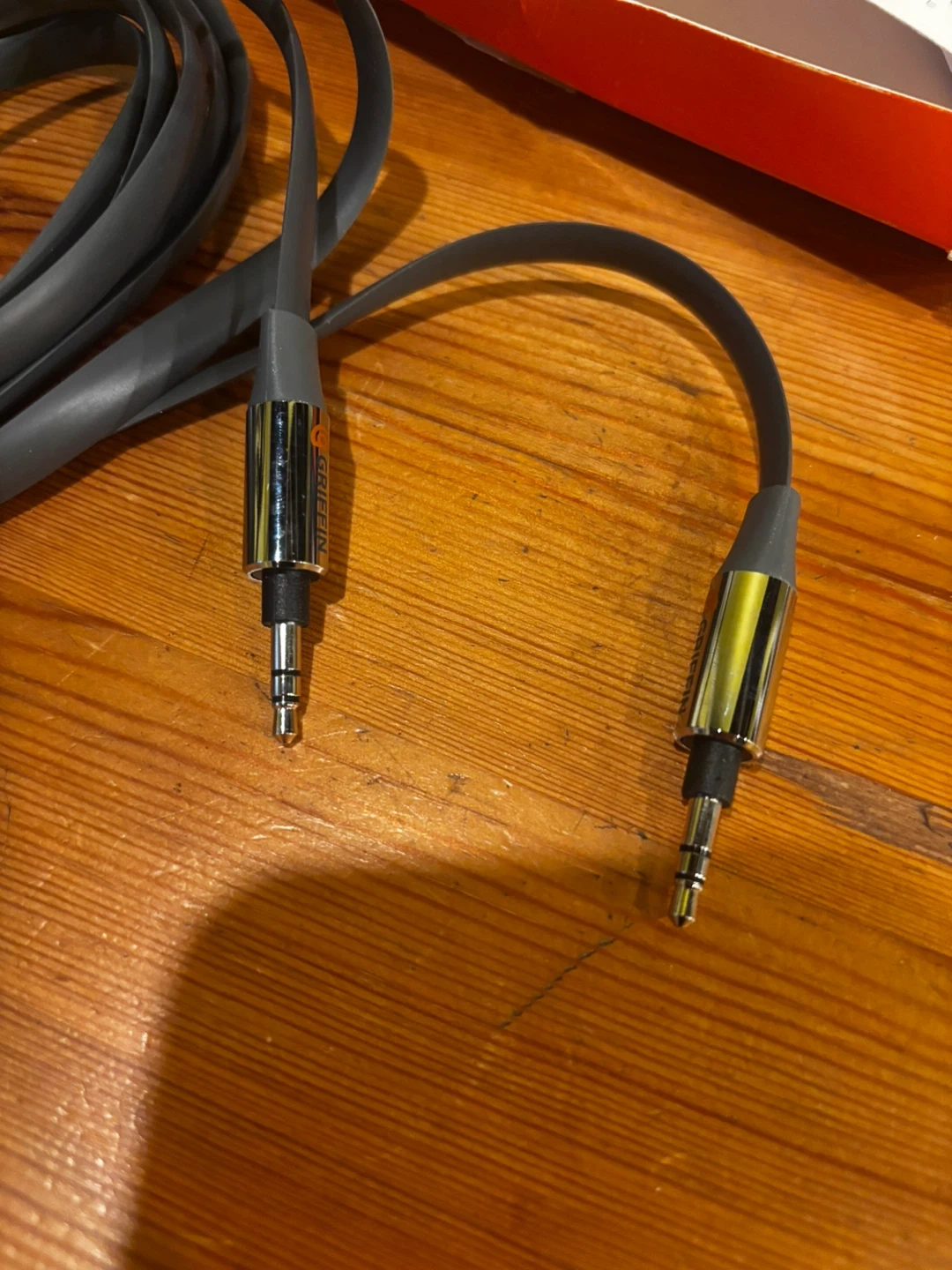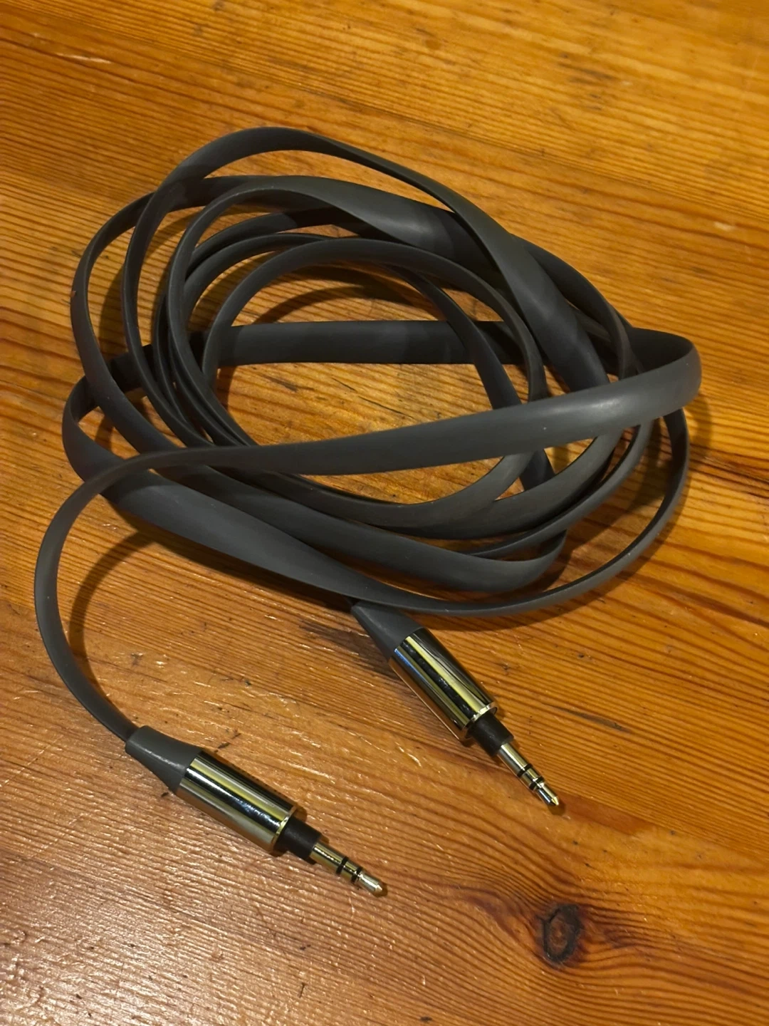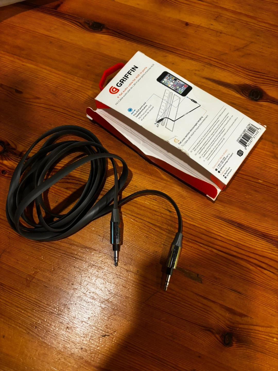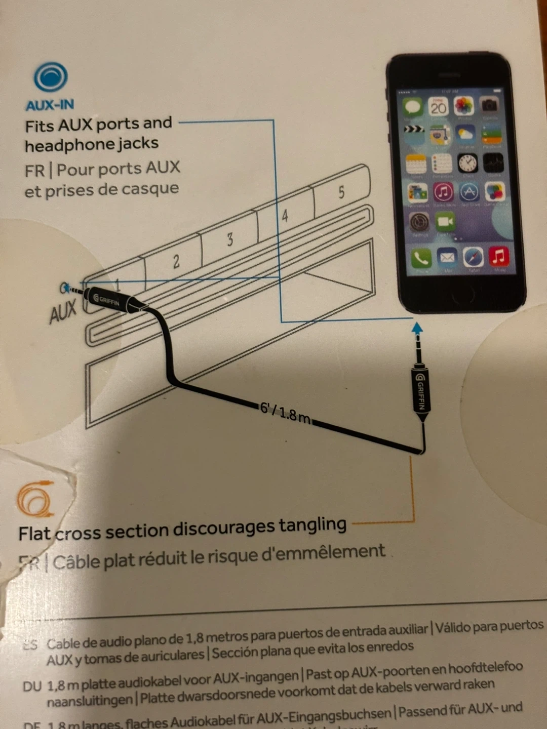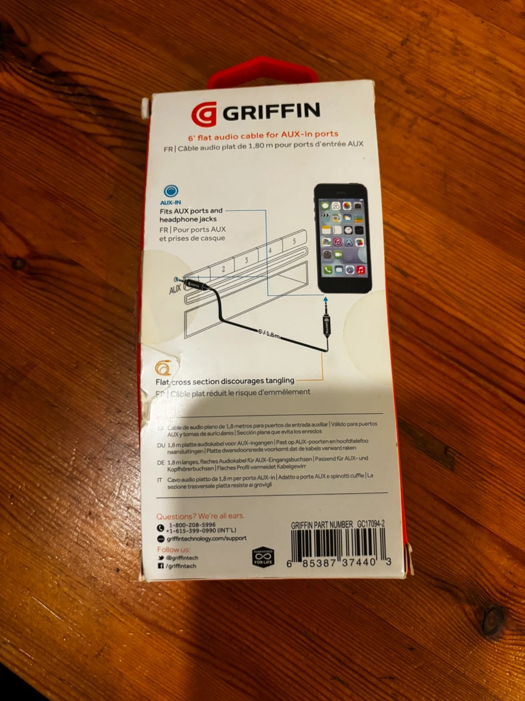 This is a 6-foot flat aux audio cable from Griffin. It fits aux ports and headphone jacks. The flat design helps prevent tangles!
