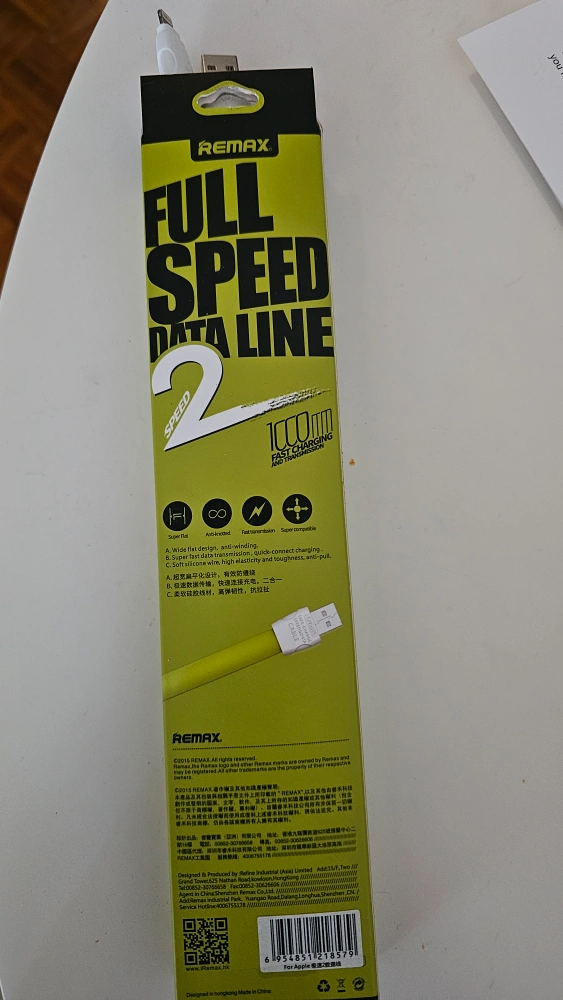 We bought but never needed or used so time to go : a Remax Full Speed Data Line cable! It supports 1000 mA fast charging and super compatibility. The cable features a wide flat design, anti-winding, and fast transmission