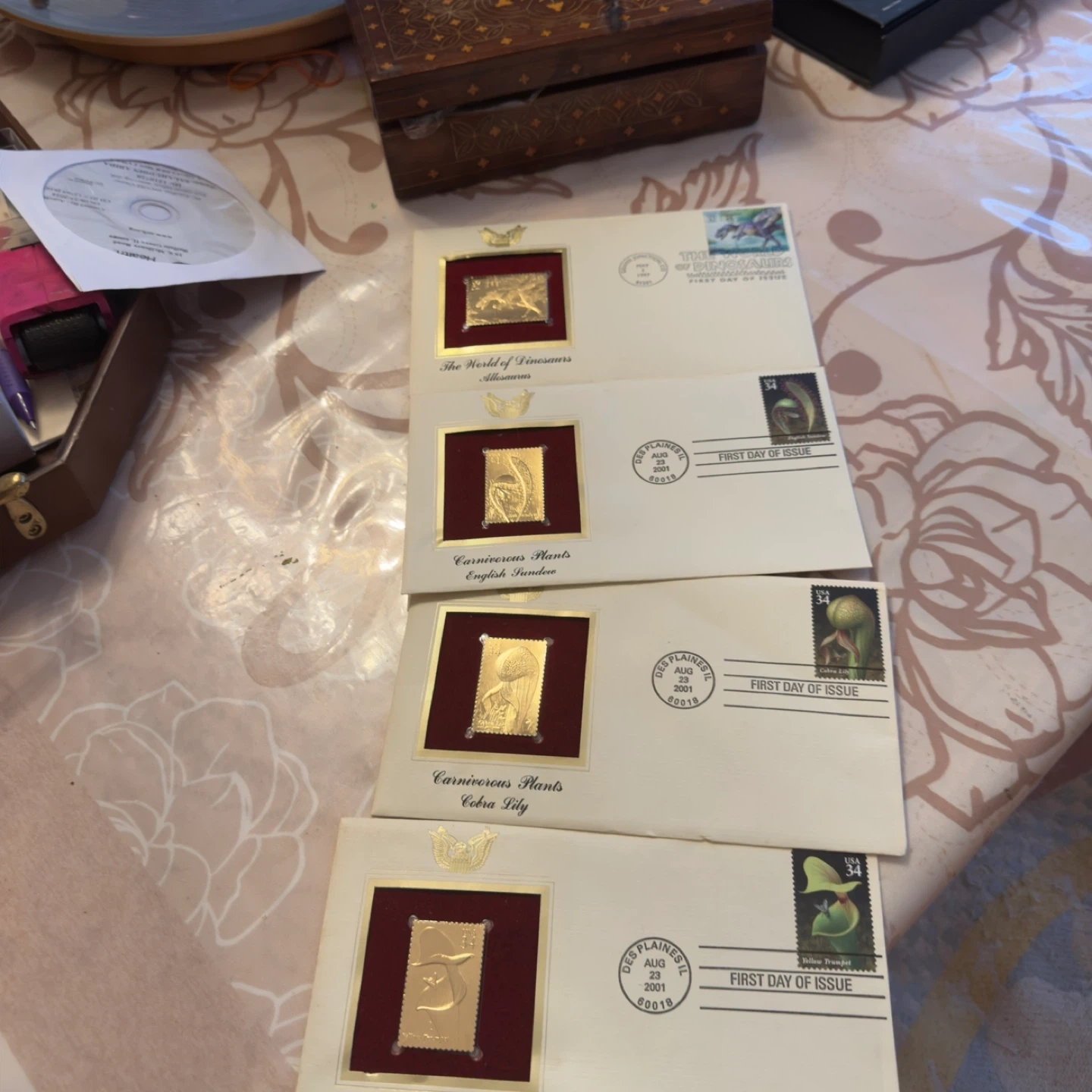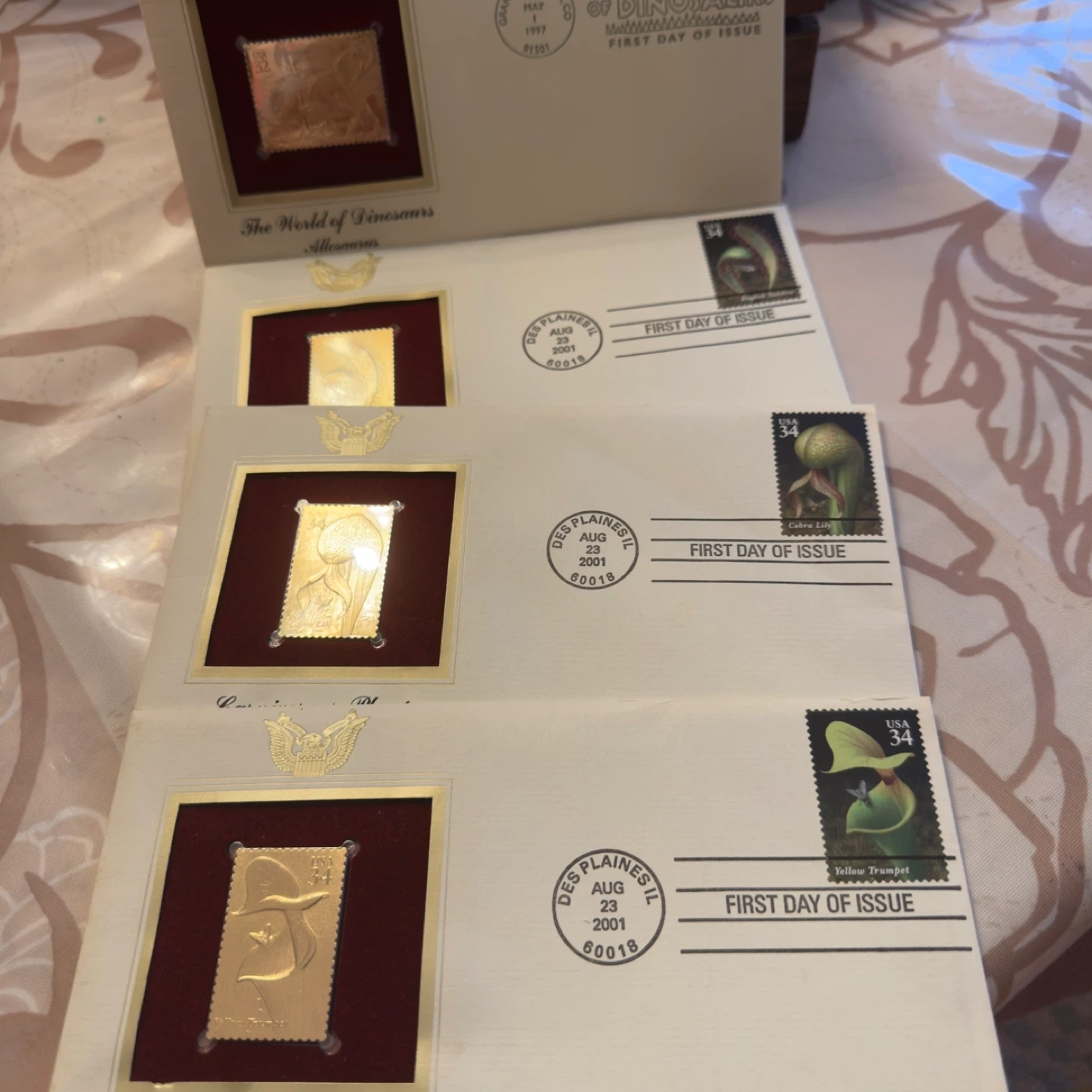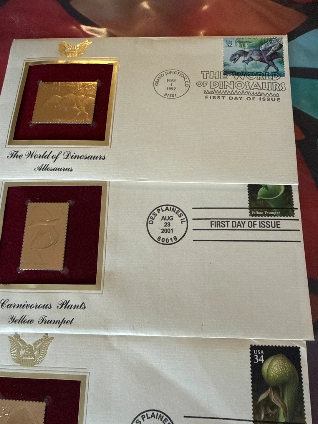 Set of four First Day Issue stamp covers. Includes 'The World of Dinosaurs Allosaurus' dated May 1, 1997. Also includes three 'Carnivorous Plants' covers: 'Yellow Trumpet' dated August 23, 2001, 'Cobra Lily' dated August 23, 2001, and one other 'Carnivorous Plants' cover.