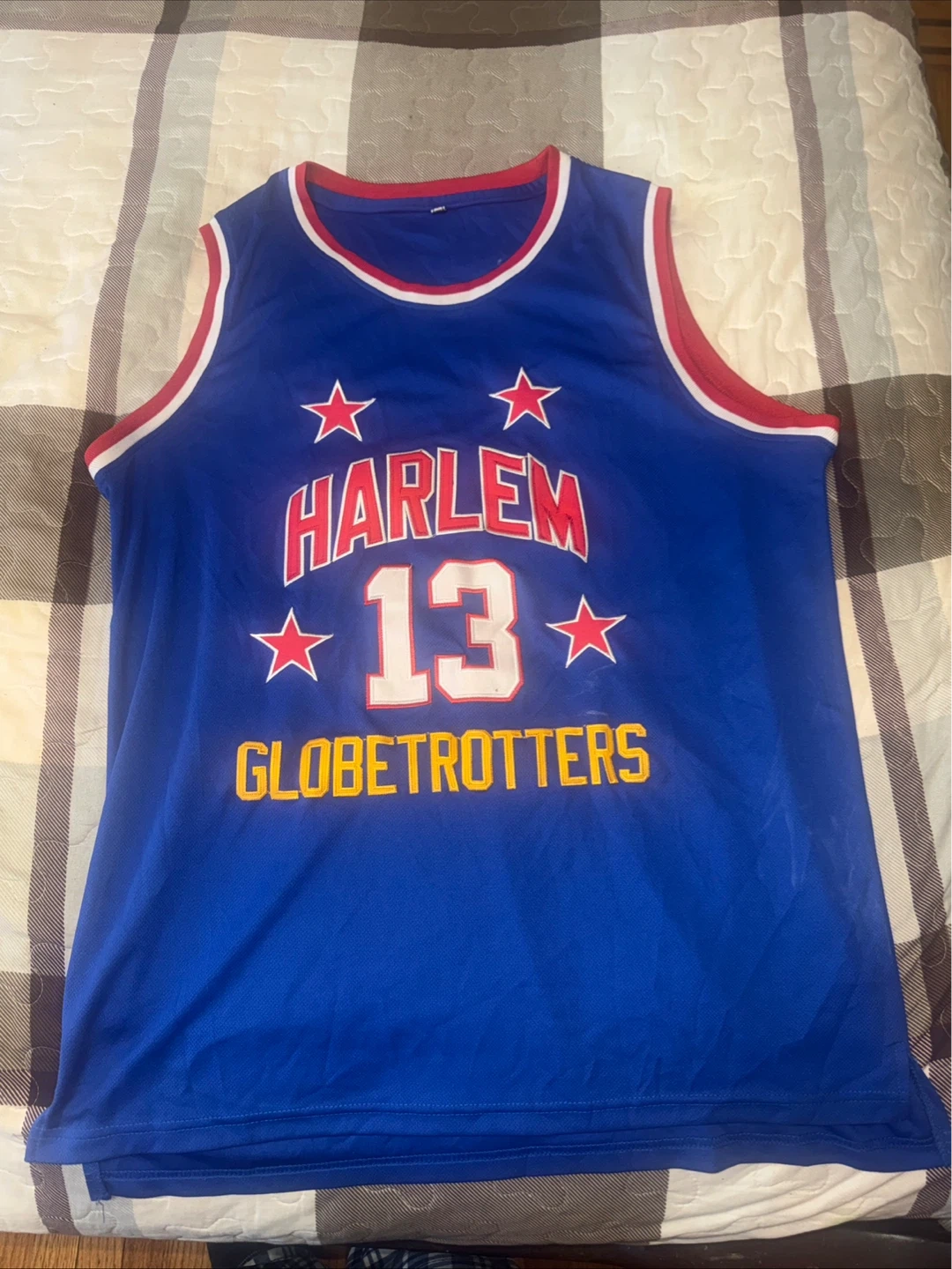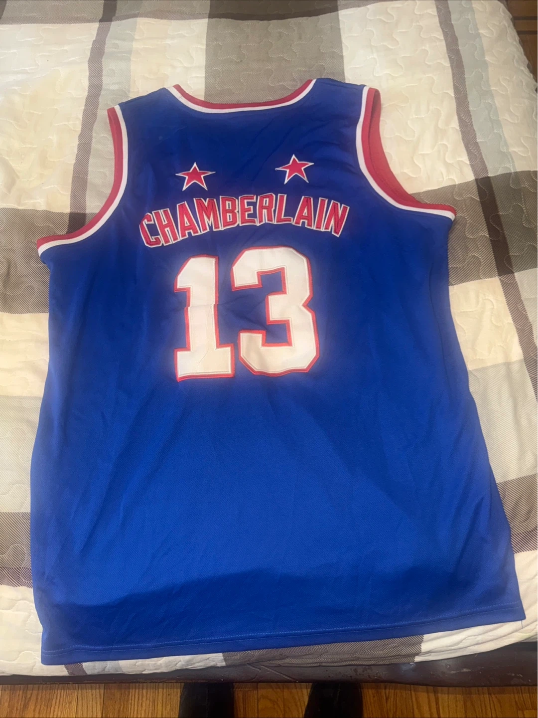 This blue basketball jersey commemorates the Harlem Globetrotters with 'Chamberlain' and the number 13 on the back. It features a red and white trim. It's a classic sports fan piece. Perfect for any basketball enthusiast!
