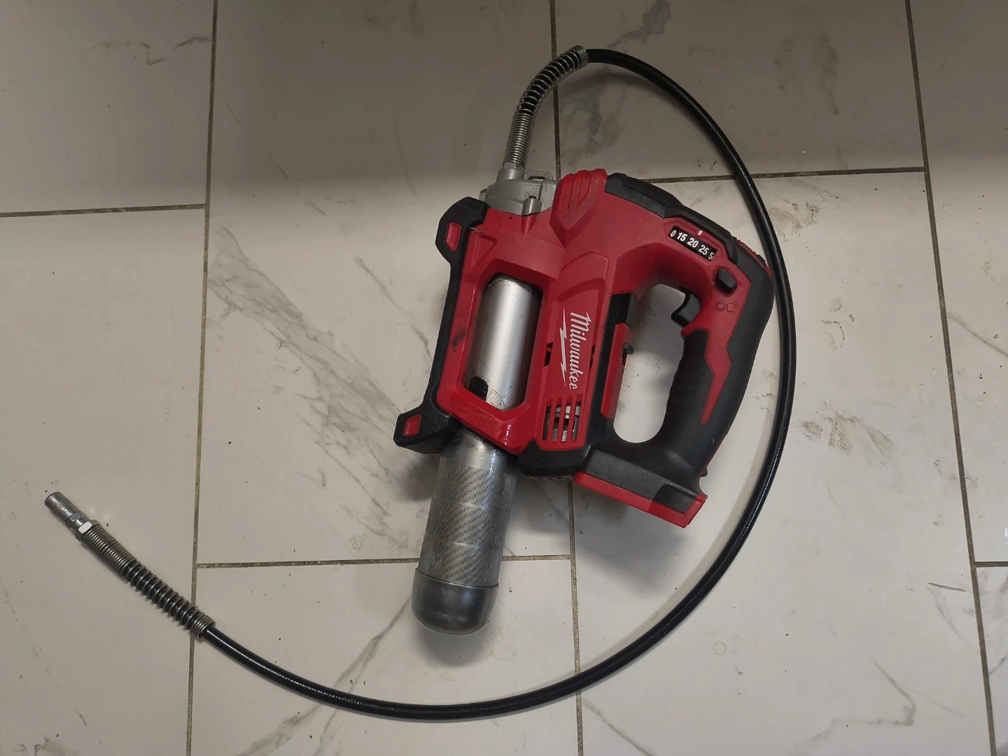 This is a Milwaukee cordless grease gun. It's red and black with a flexible hose and nozzle attachment. Includes a pressure indicator dial.