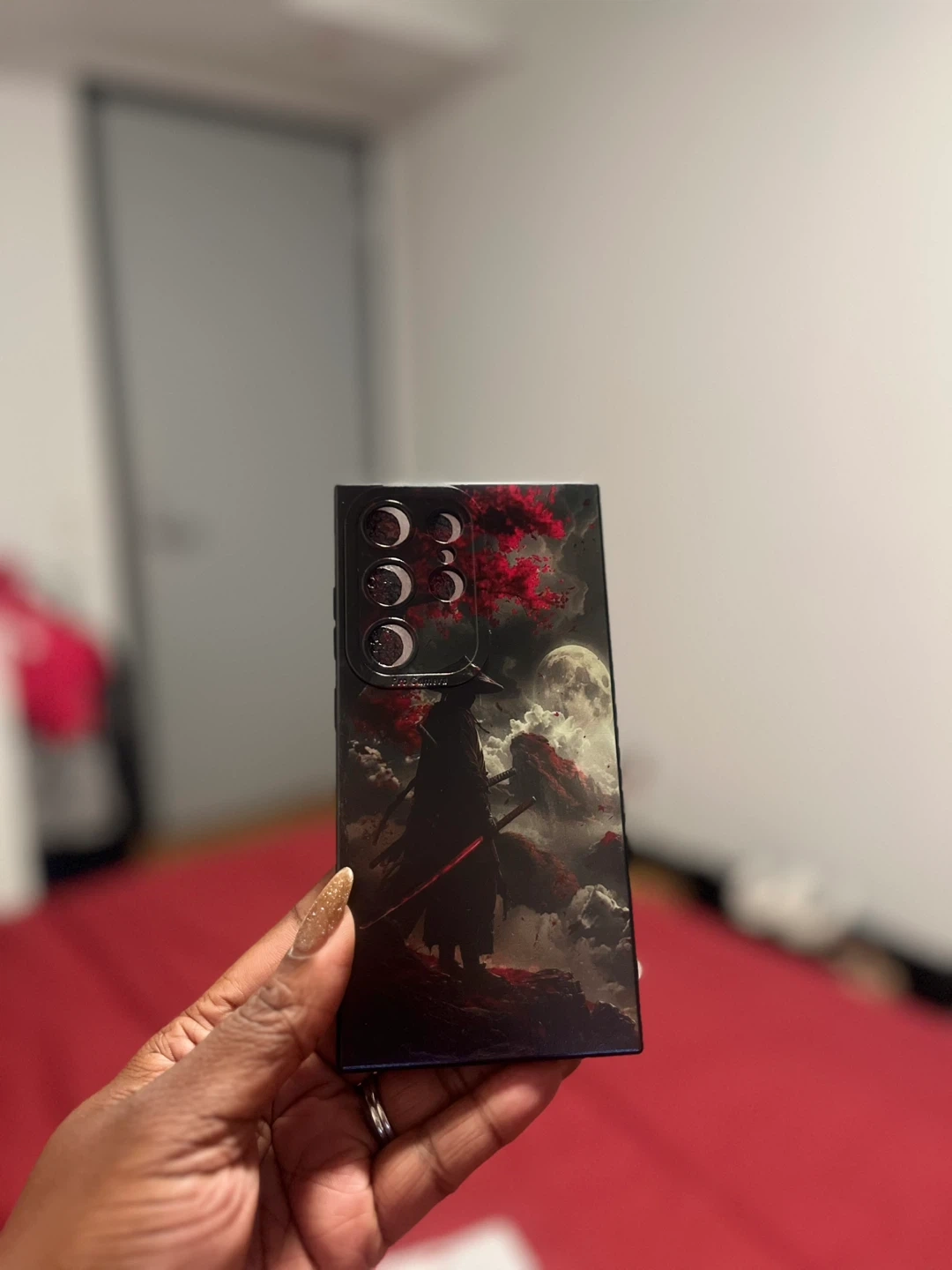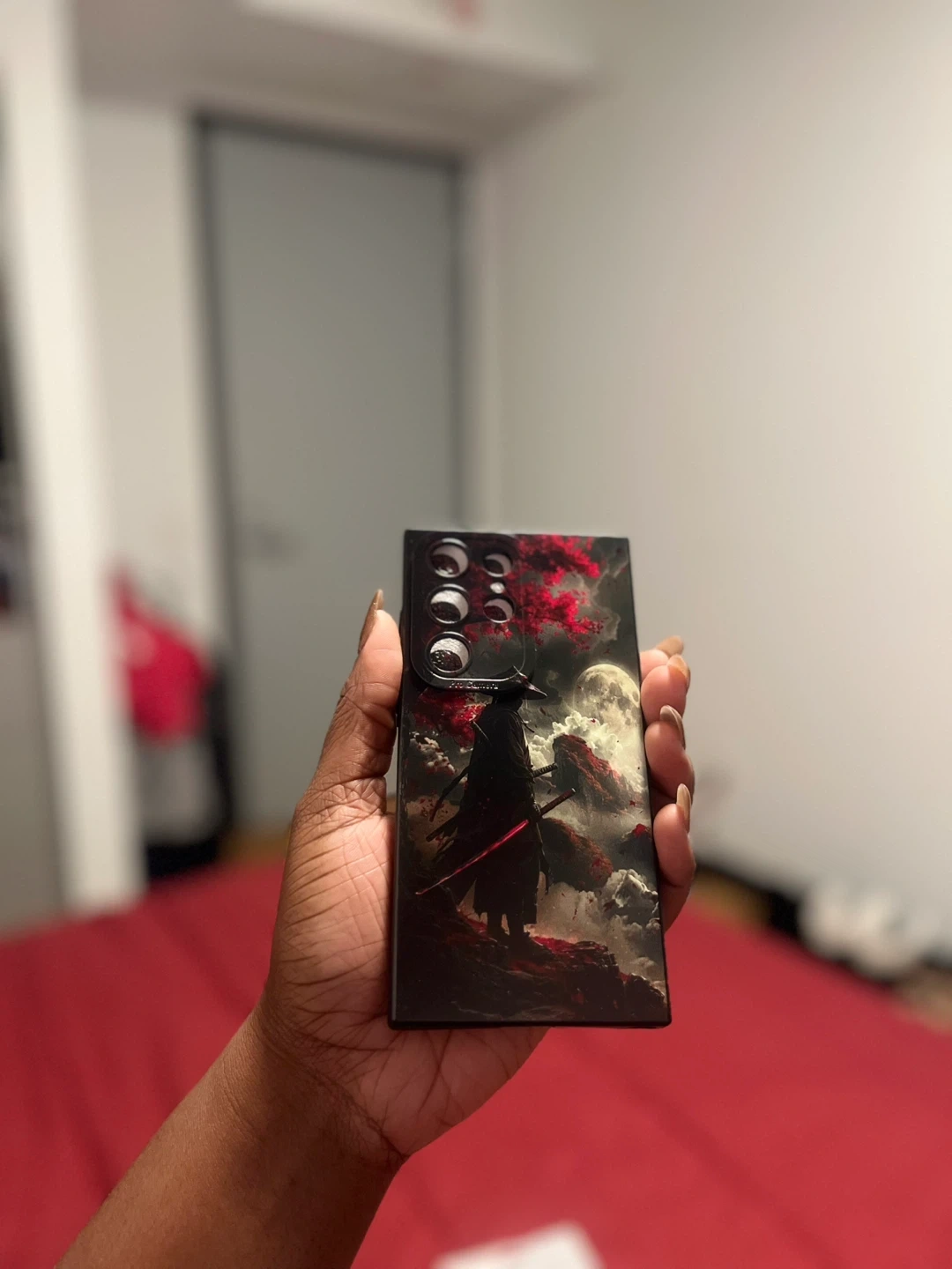 This phone case showcases a striking samurai warrior design with a moonlit background and red floral accents. It offers a unique aesthetic for your device. Protect your phone with this eye-catching case!